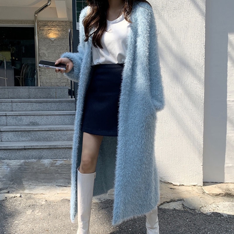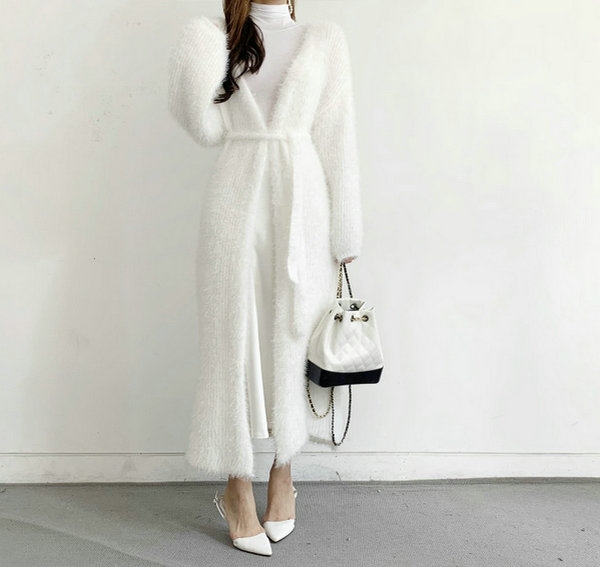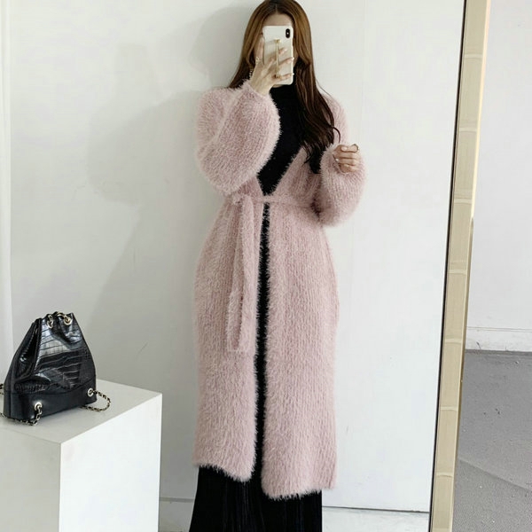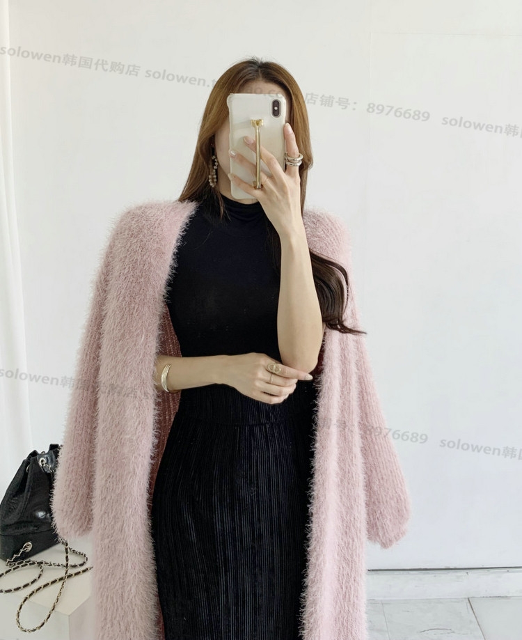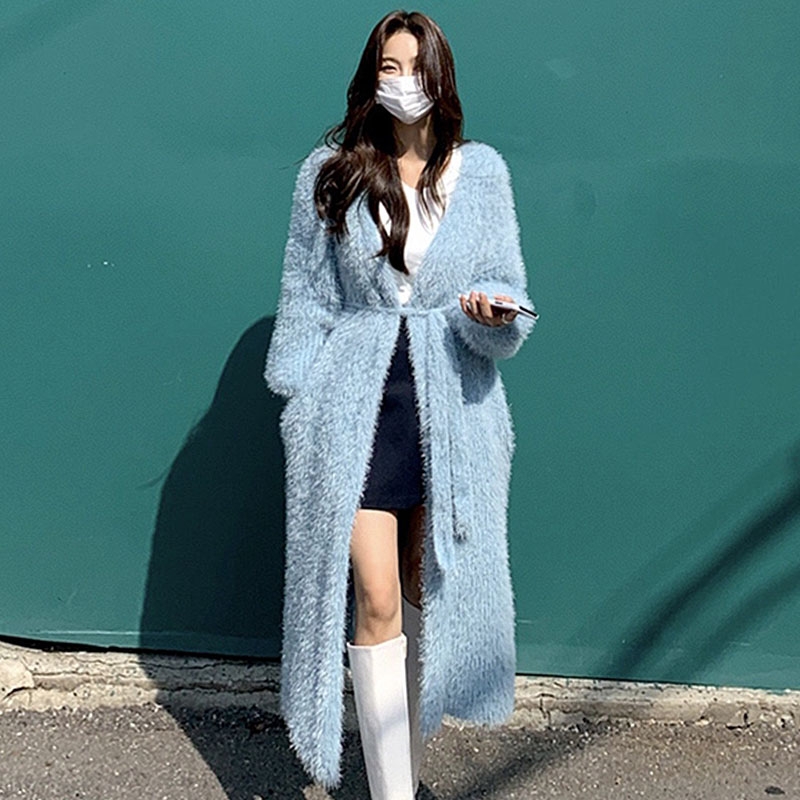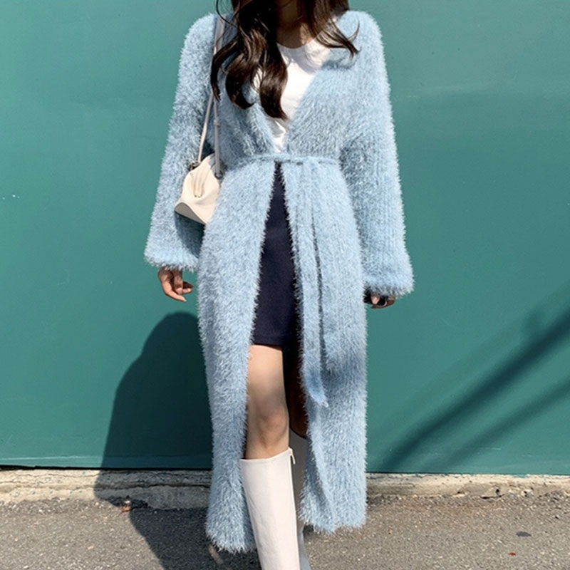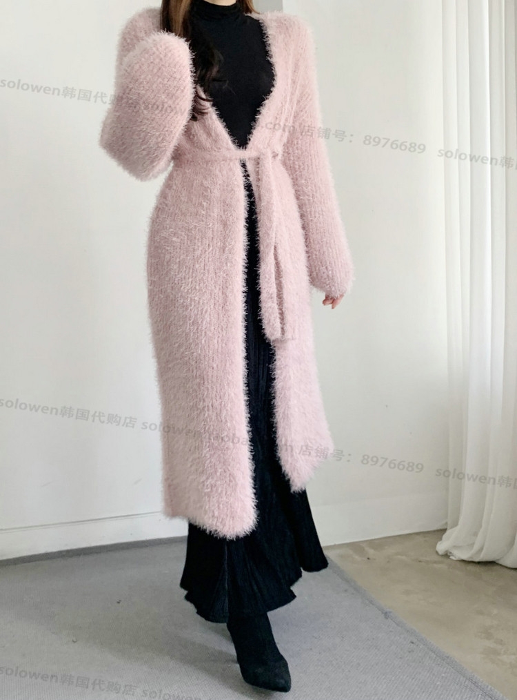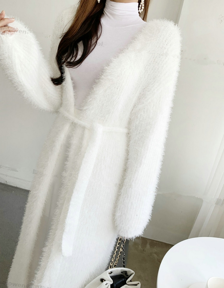 Korean autumn and winter elegant temperament long straps fluffy solid color knitted sweater coat