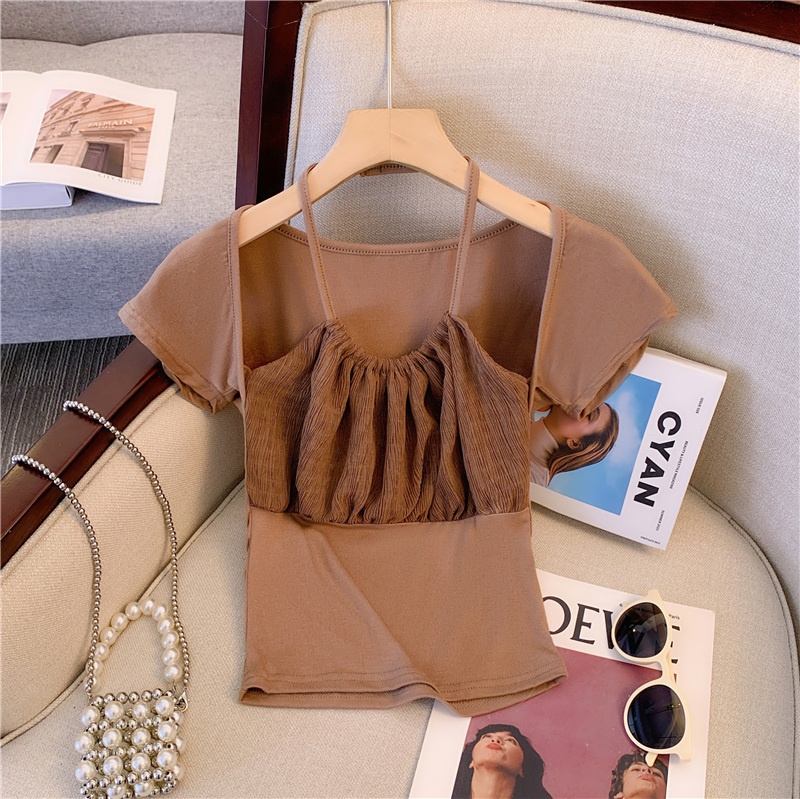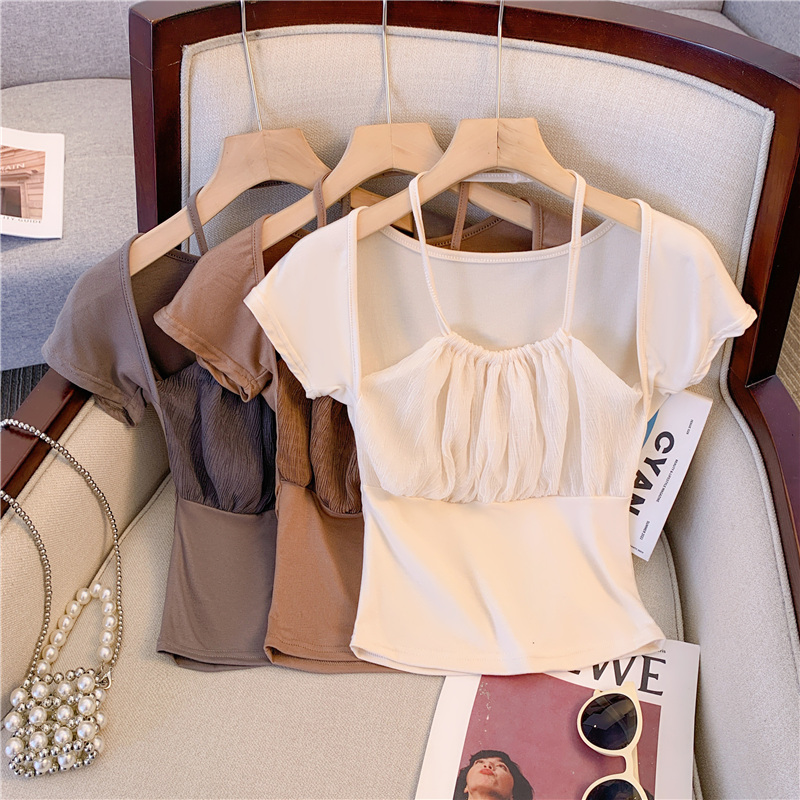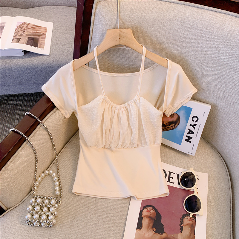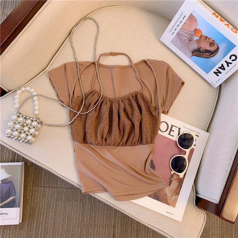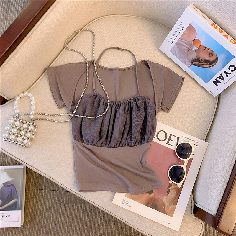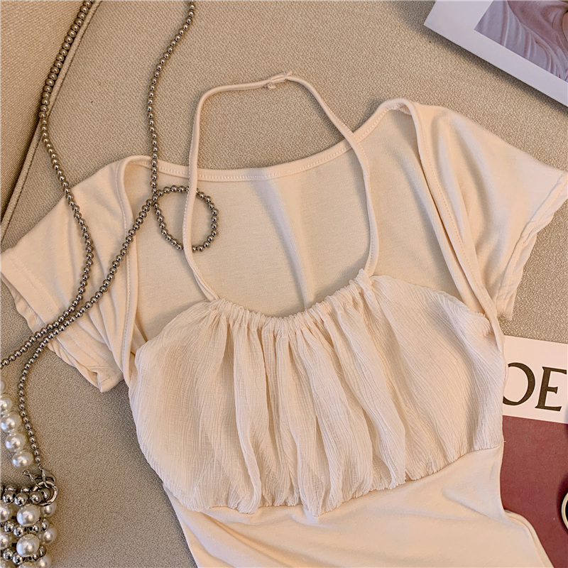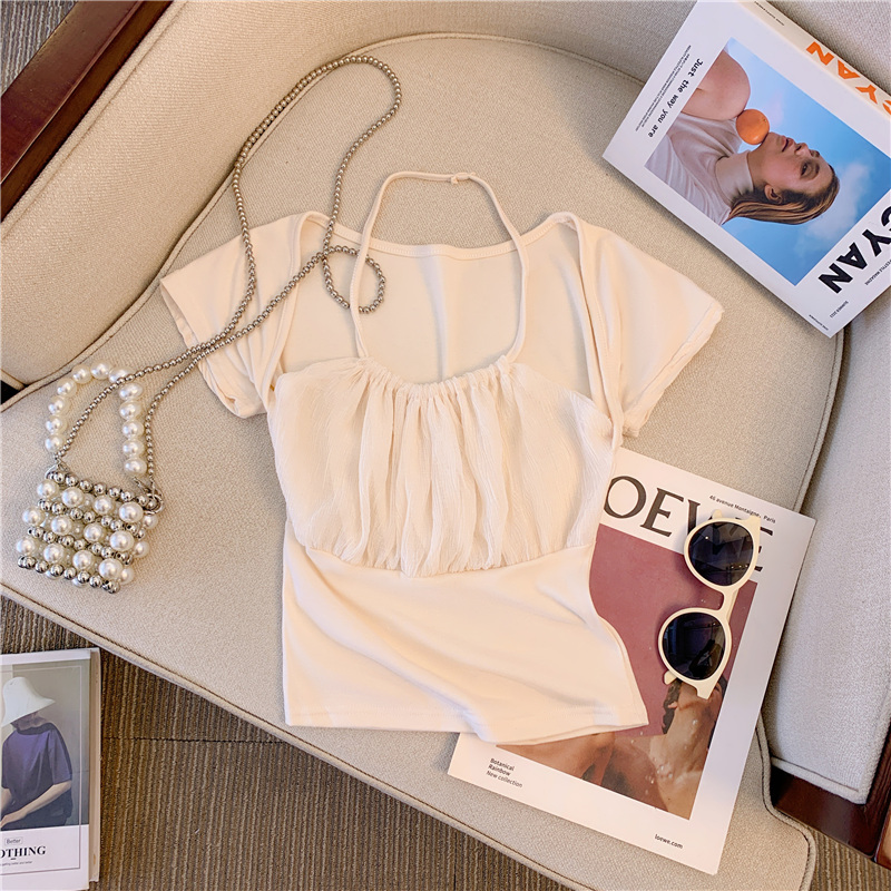 实拍纯欲短袖T恤女2023夏季修身显瘦挂脖吊带小众拼接辣妹上衣潮