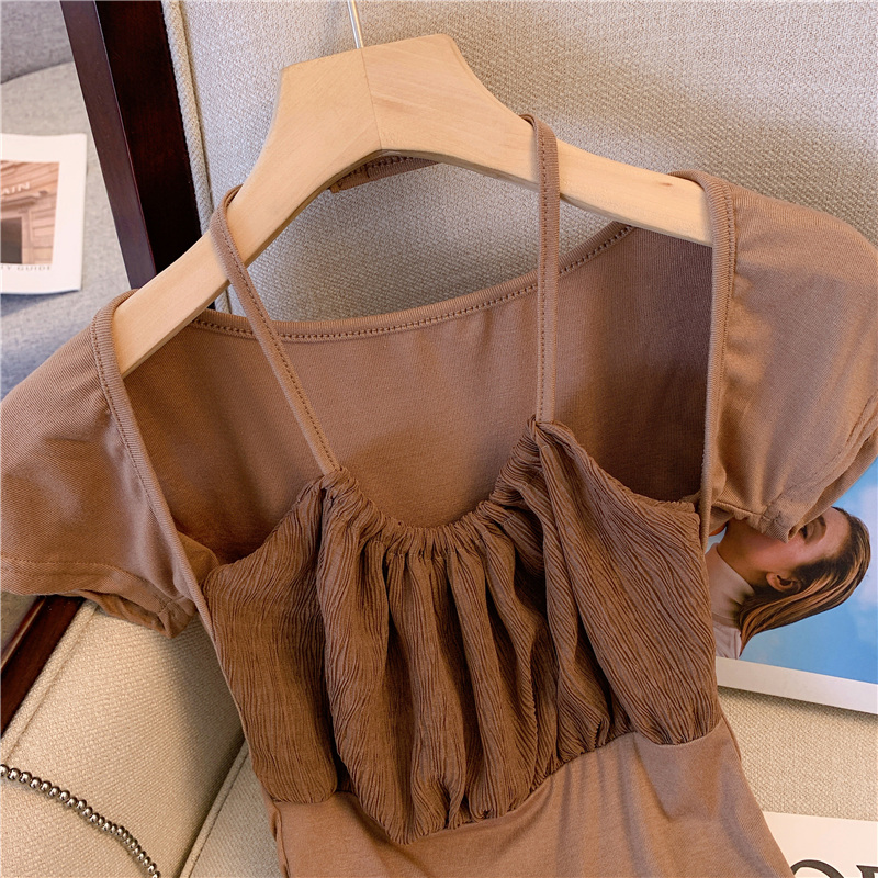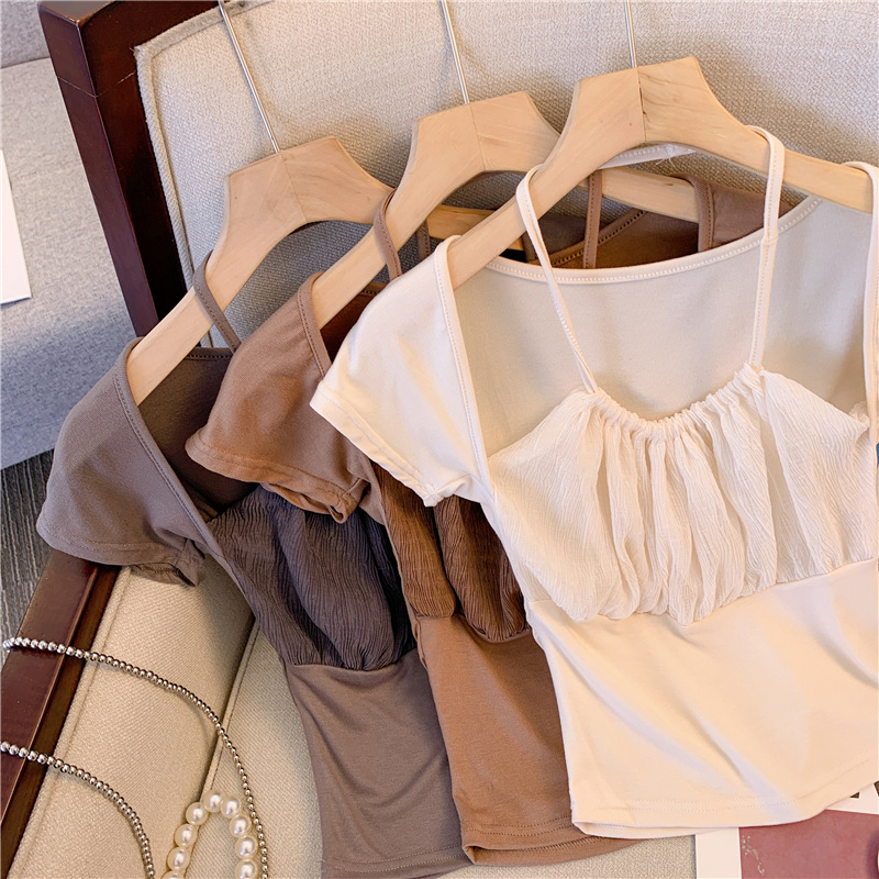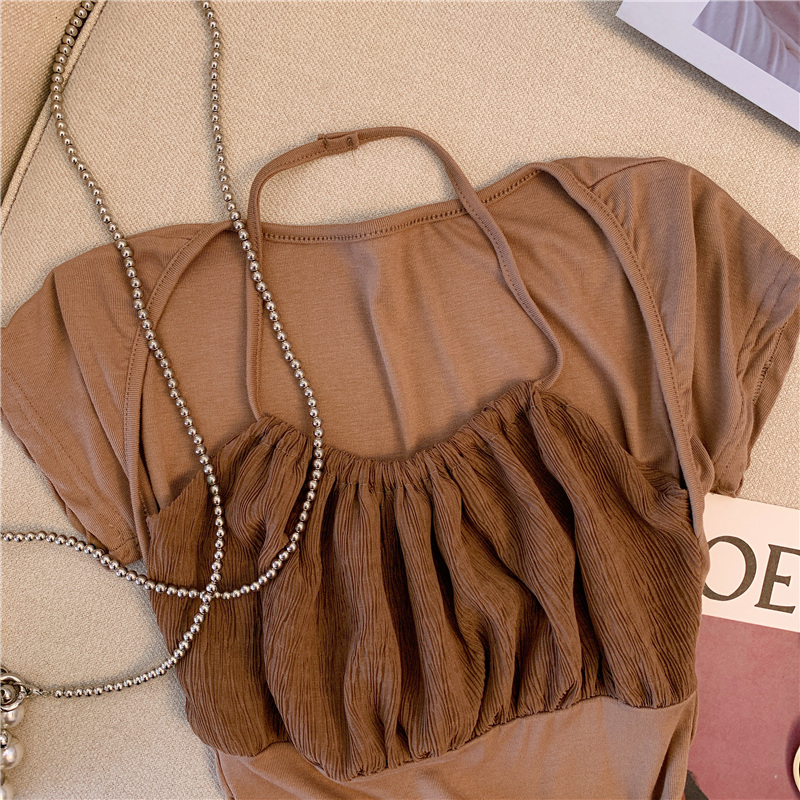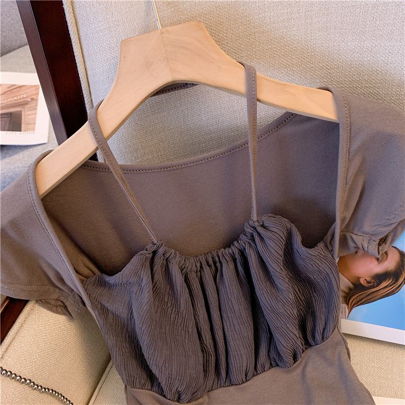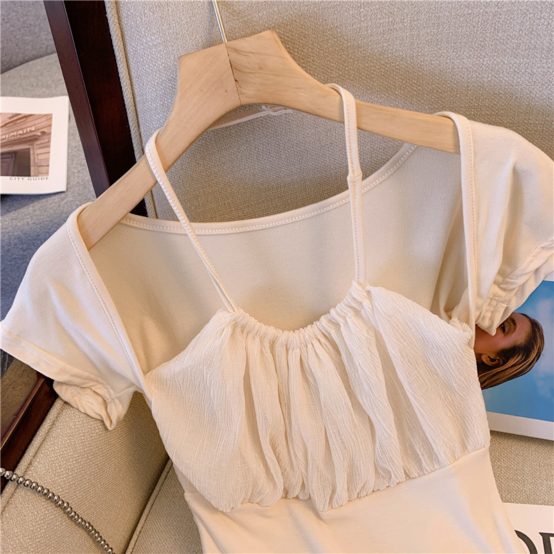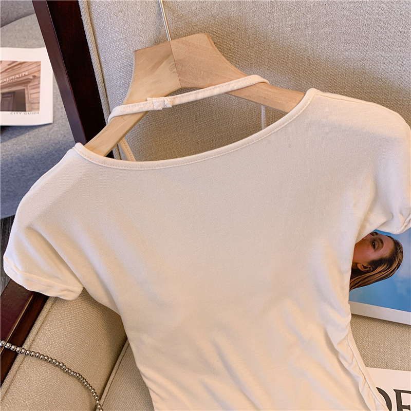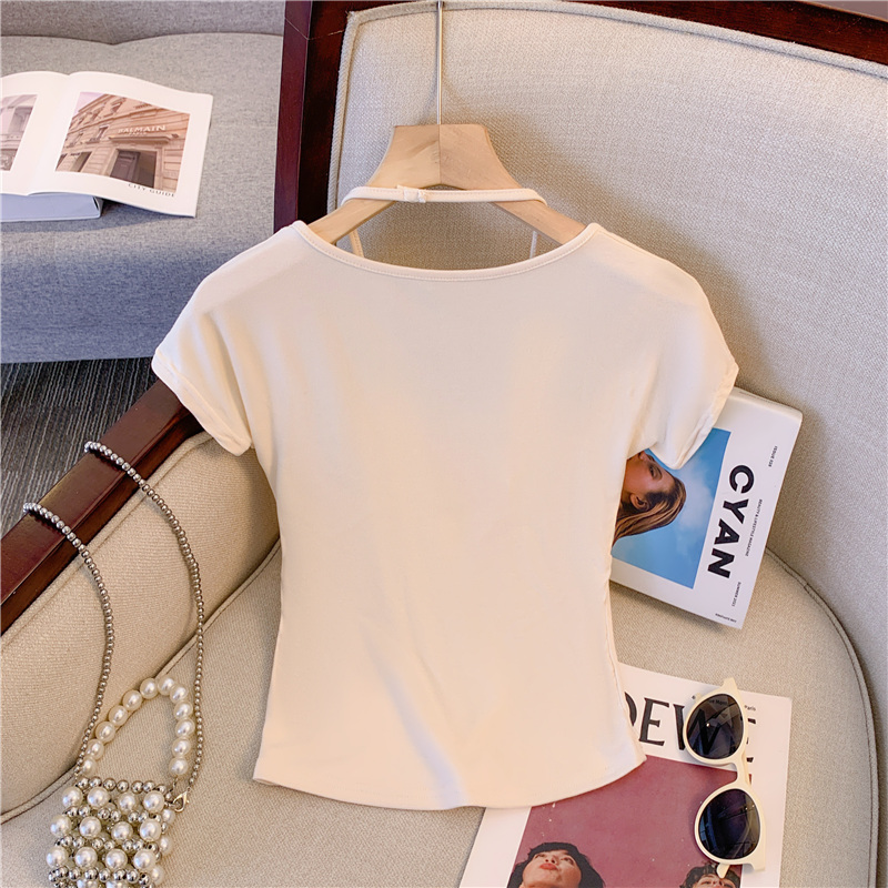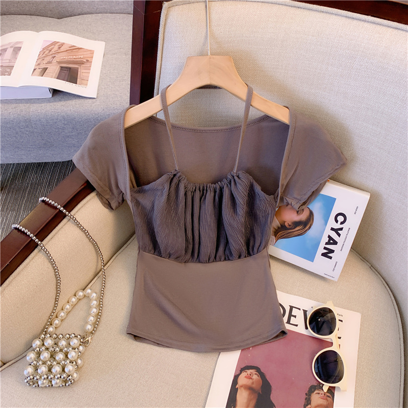 实拍纯欲短袖T恤女2023夏季修身显瘦挂脖吊带小众拼接辣妹上衣潮