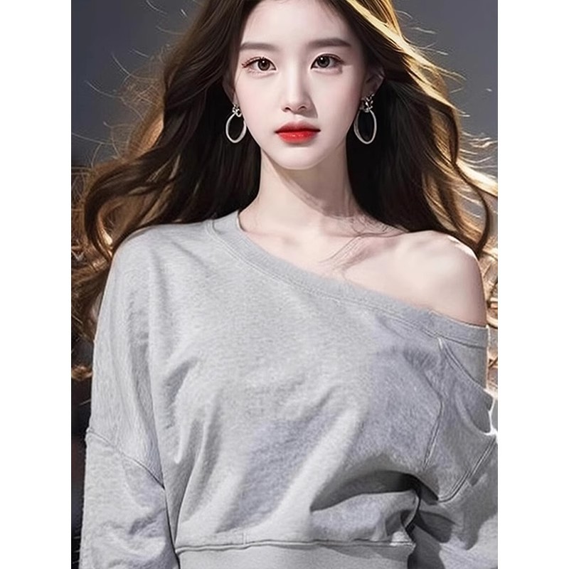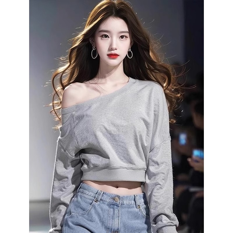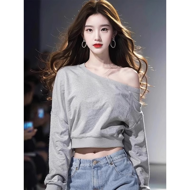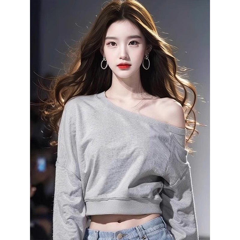 Spring and autumn unique petite navel-baring short oblique shoulder sweater female design niche super good-looking long-sleeved top