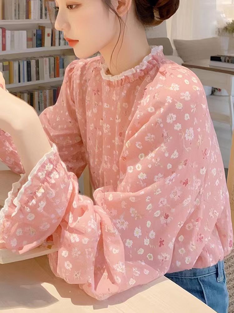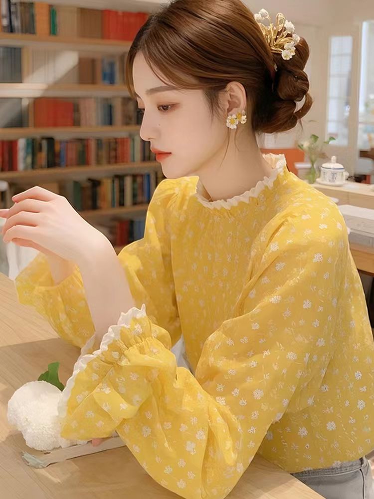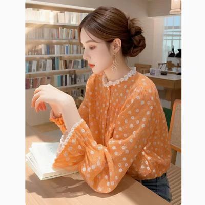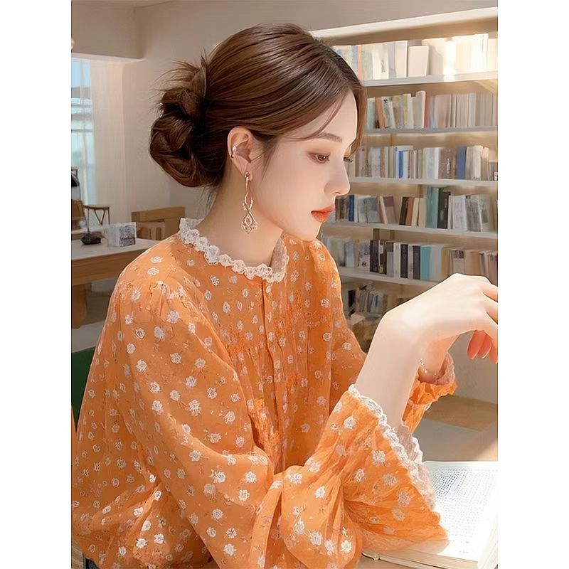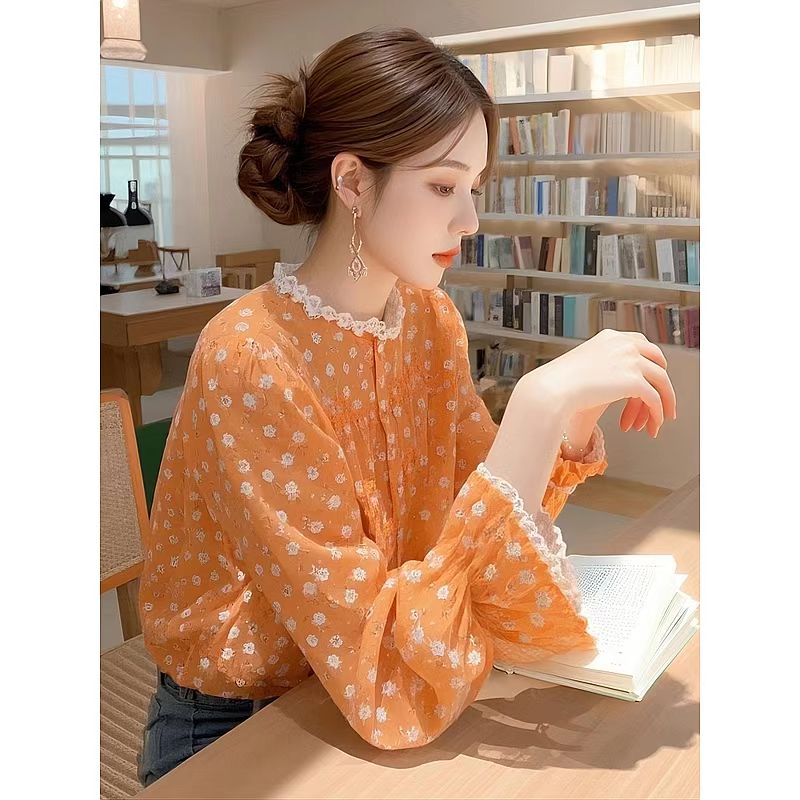 橘色碎花衬衫春款2025新款女装法式多巴胺上衣独特好看蕾丝边小衫