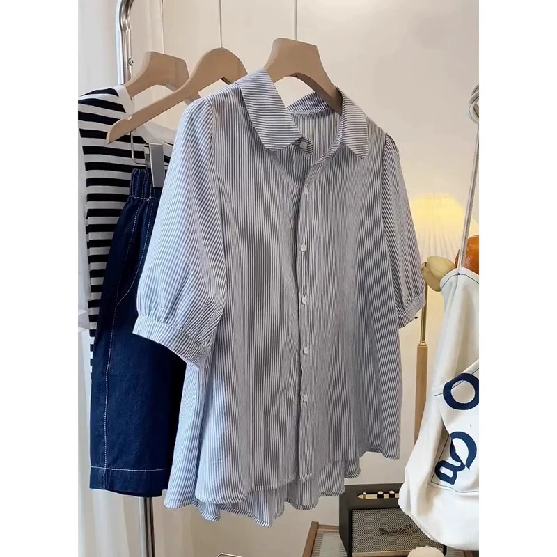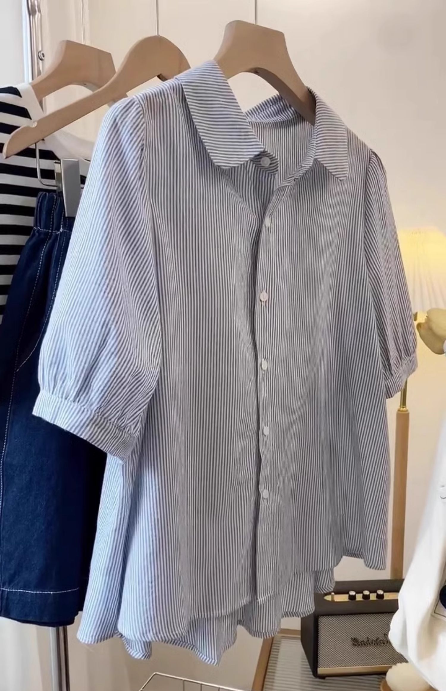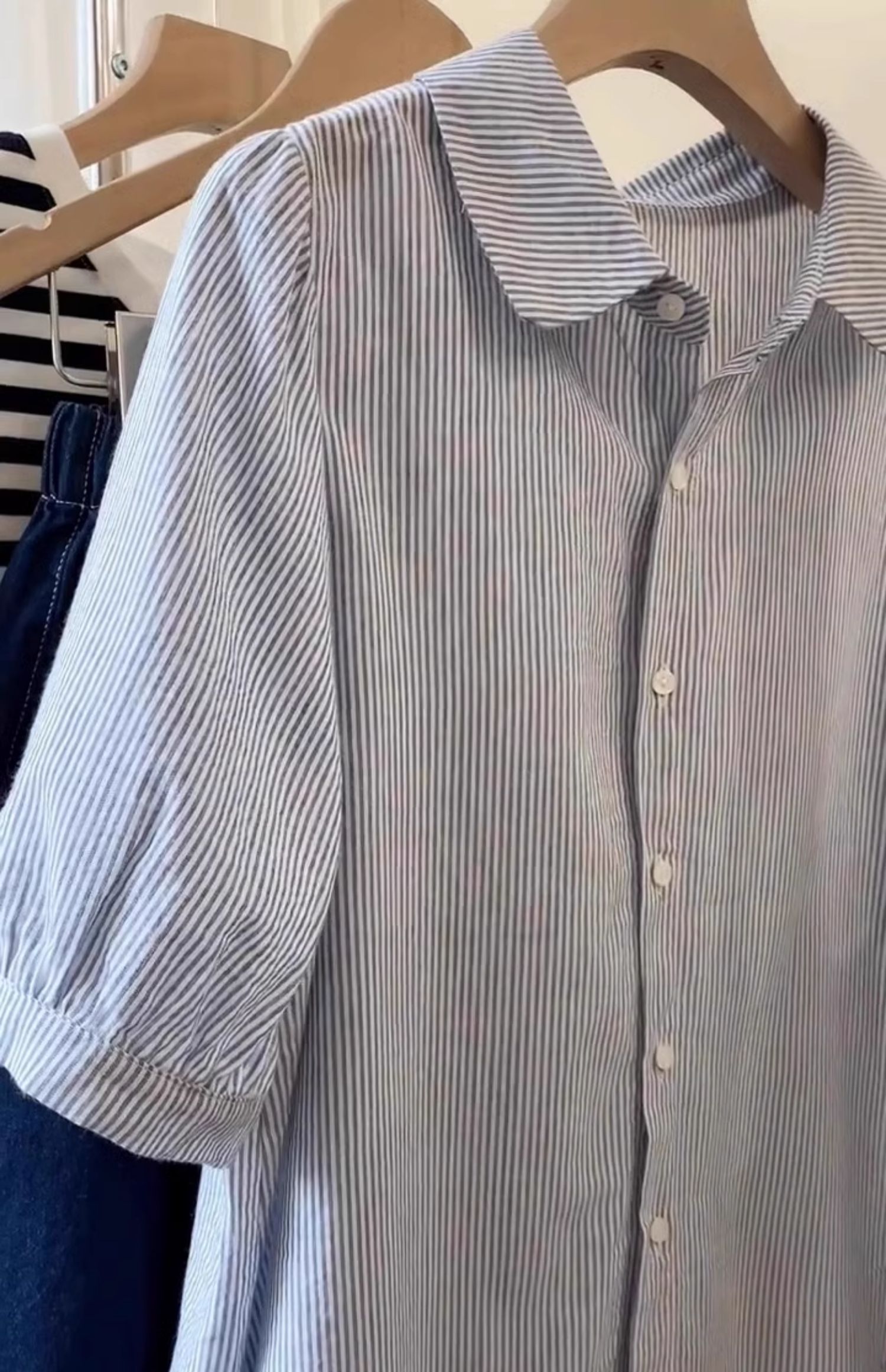 2025 new light mature French style niche foreign style age-reducing baby shirt top blue striped short-sleeved shirt female summer style