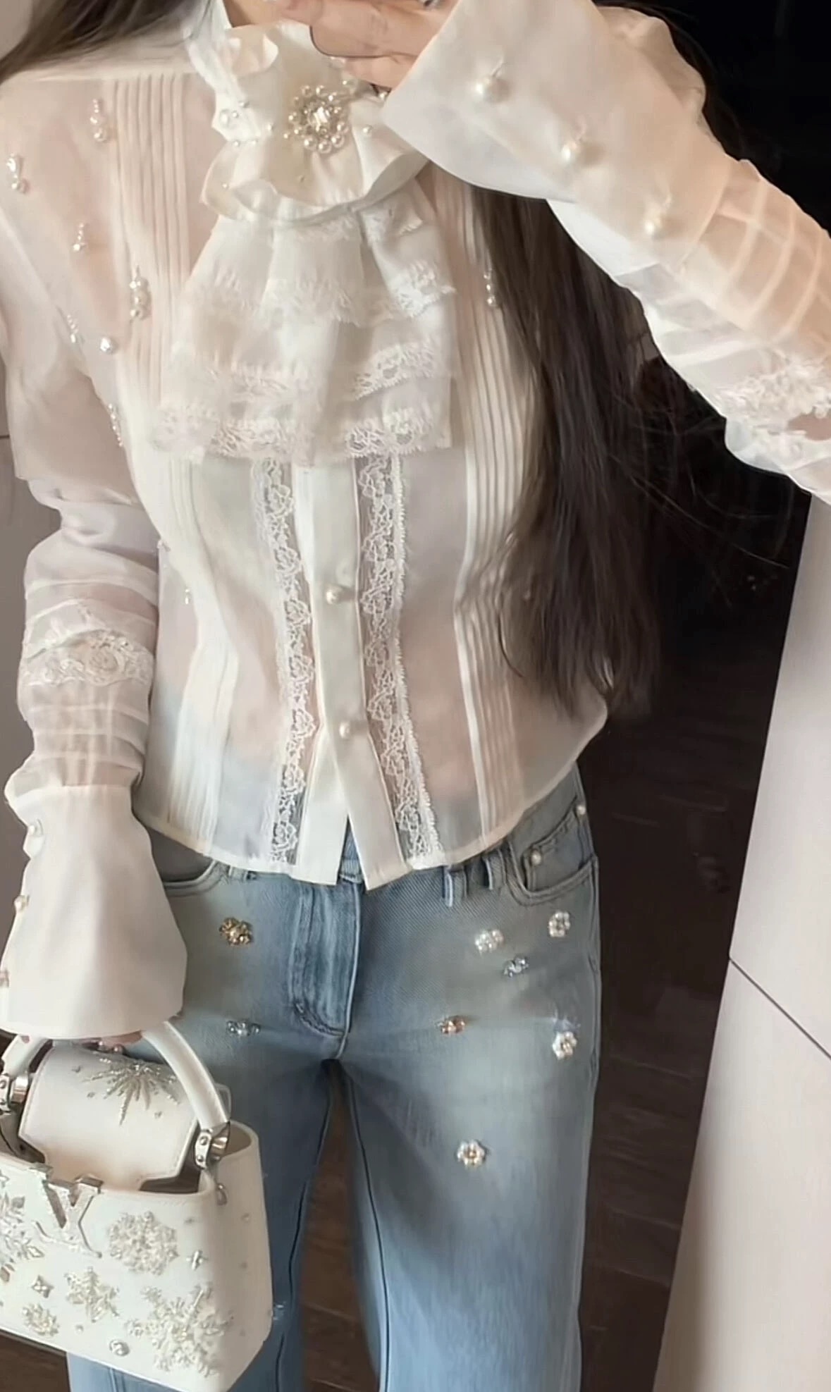 深圳南油高端女装2025新款法式甜美气质蕾丝边钉珠领结半透明衬衫