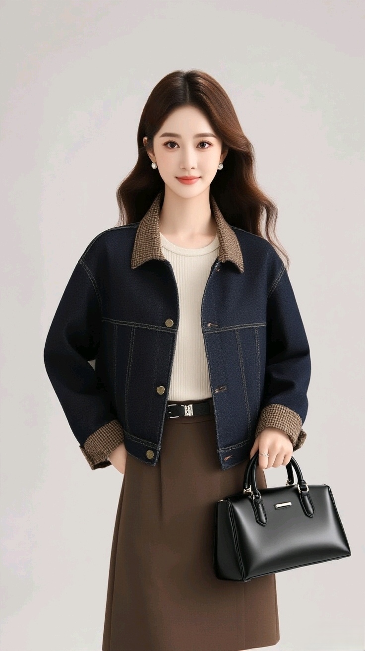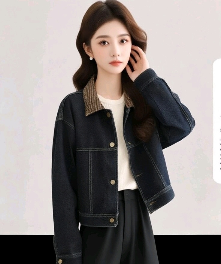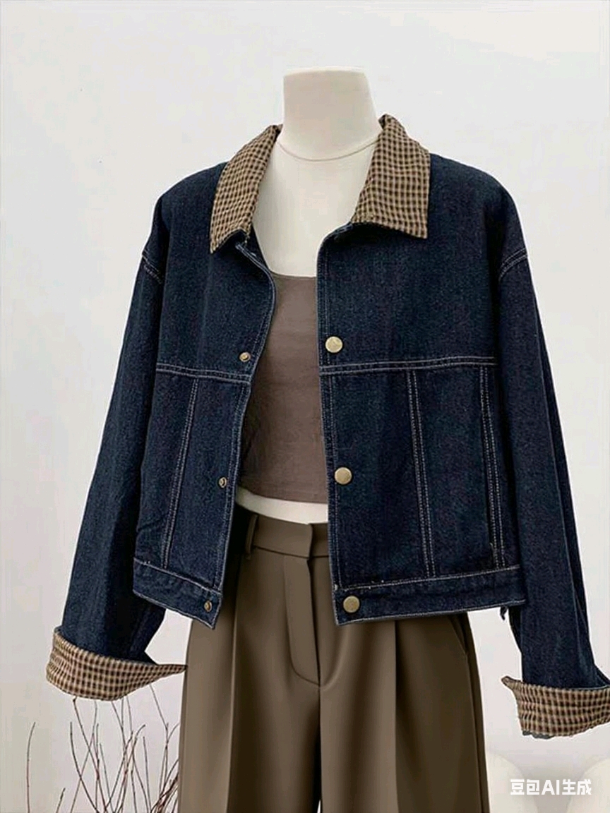 撞色格子花布拼接时尚百搭韩版牛仔上衣外套