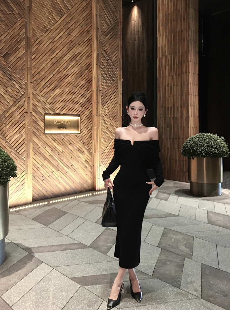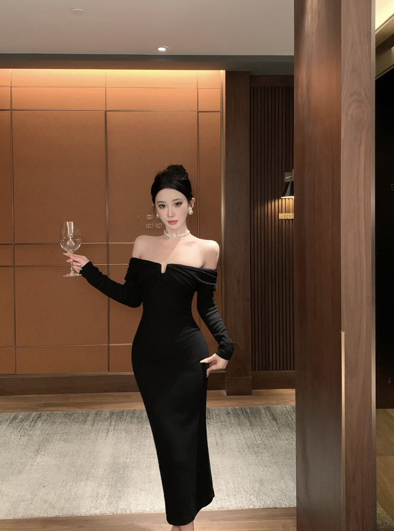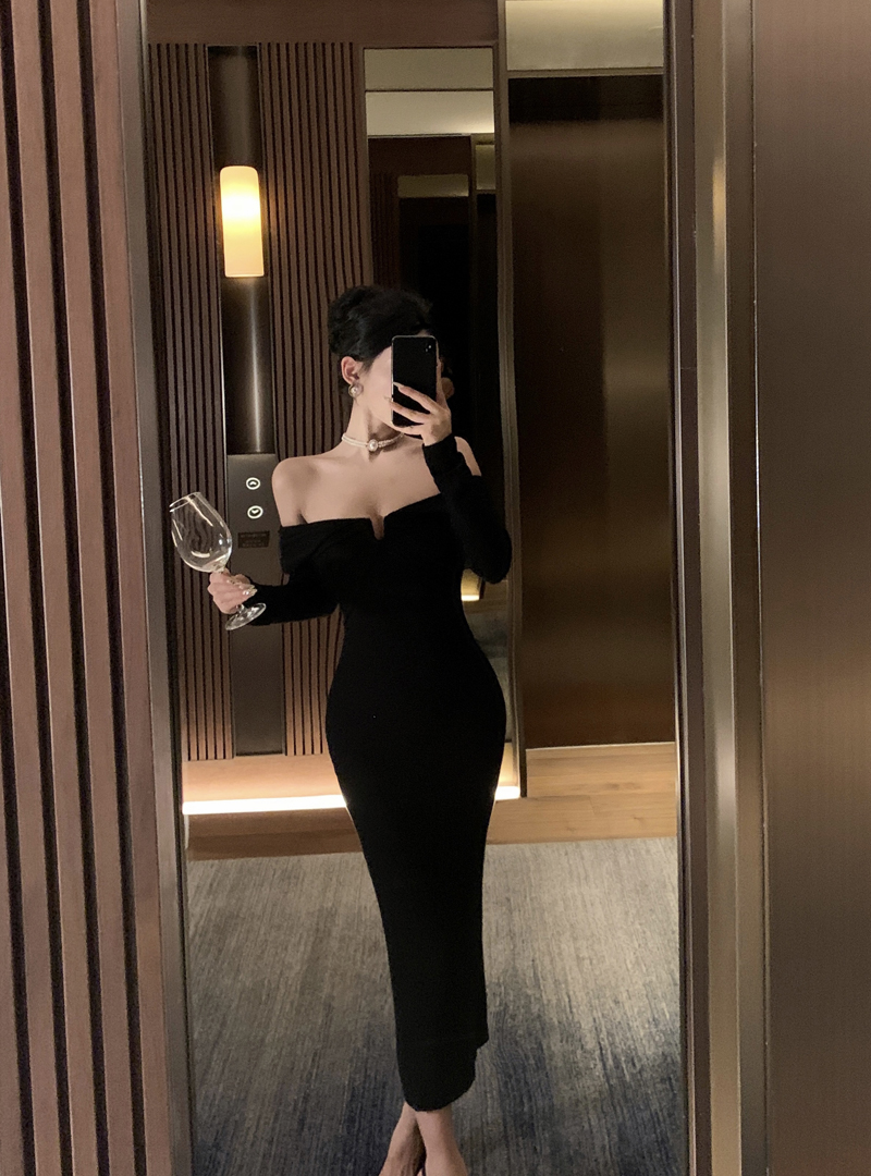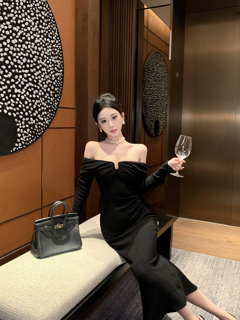 实拍针织连衣裙一字肩礼服性感宴会约会裙黑色气质年会长袖裙