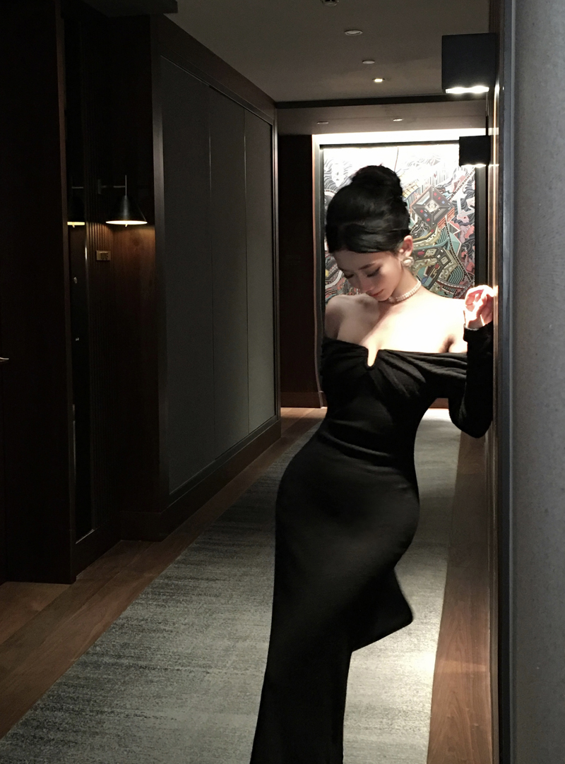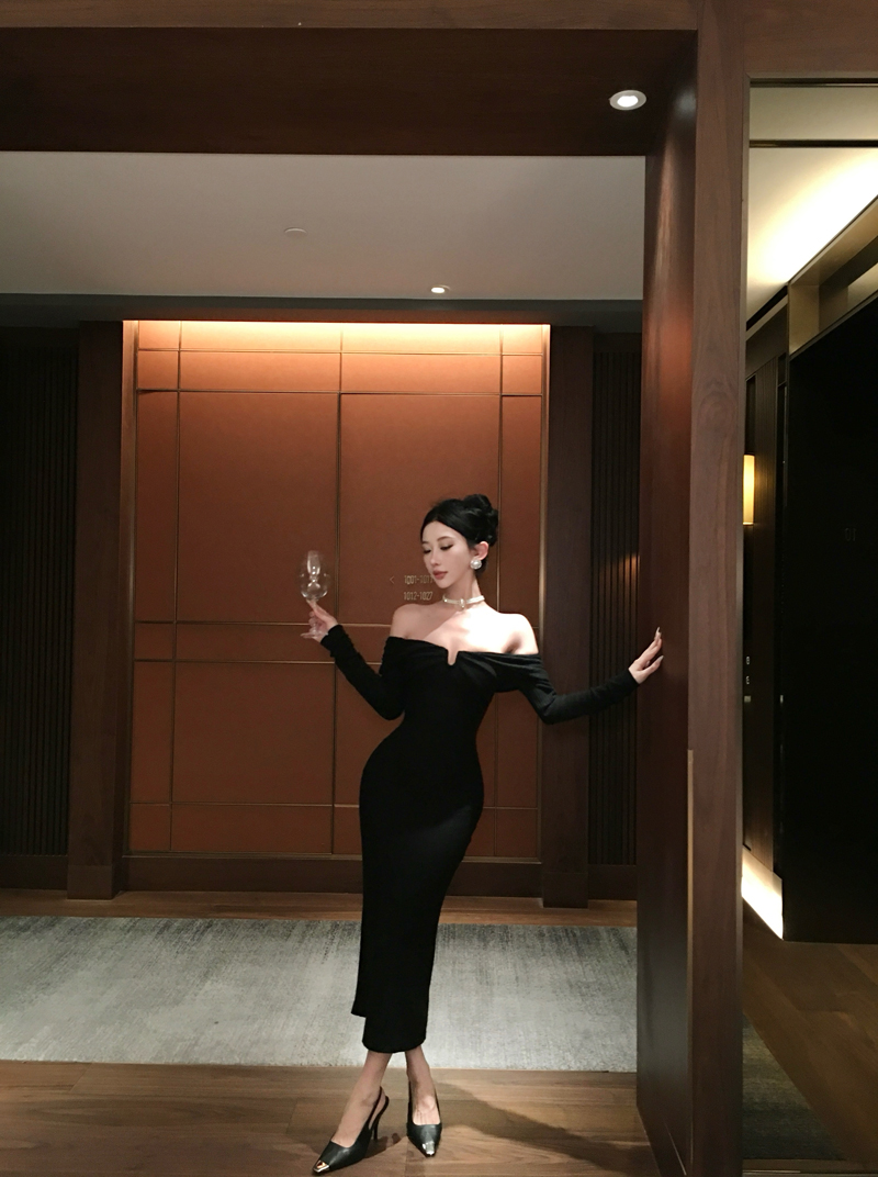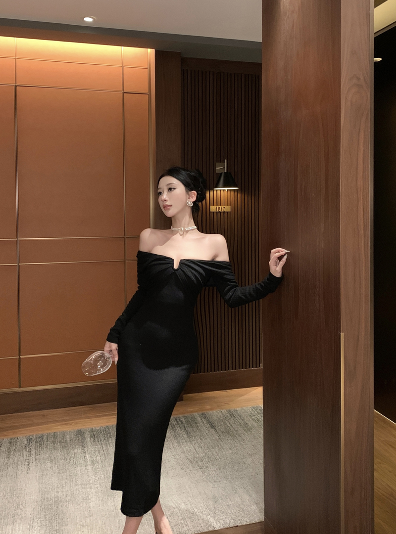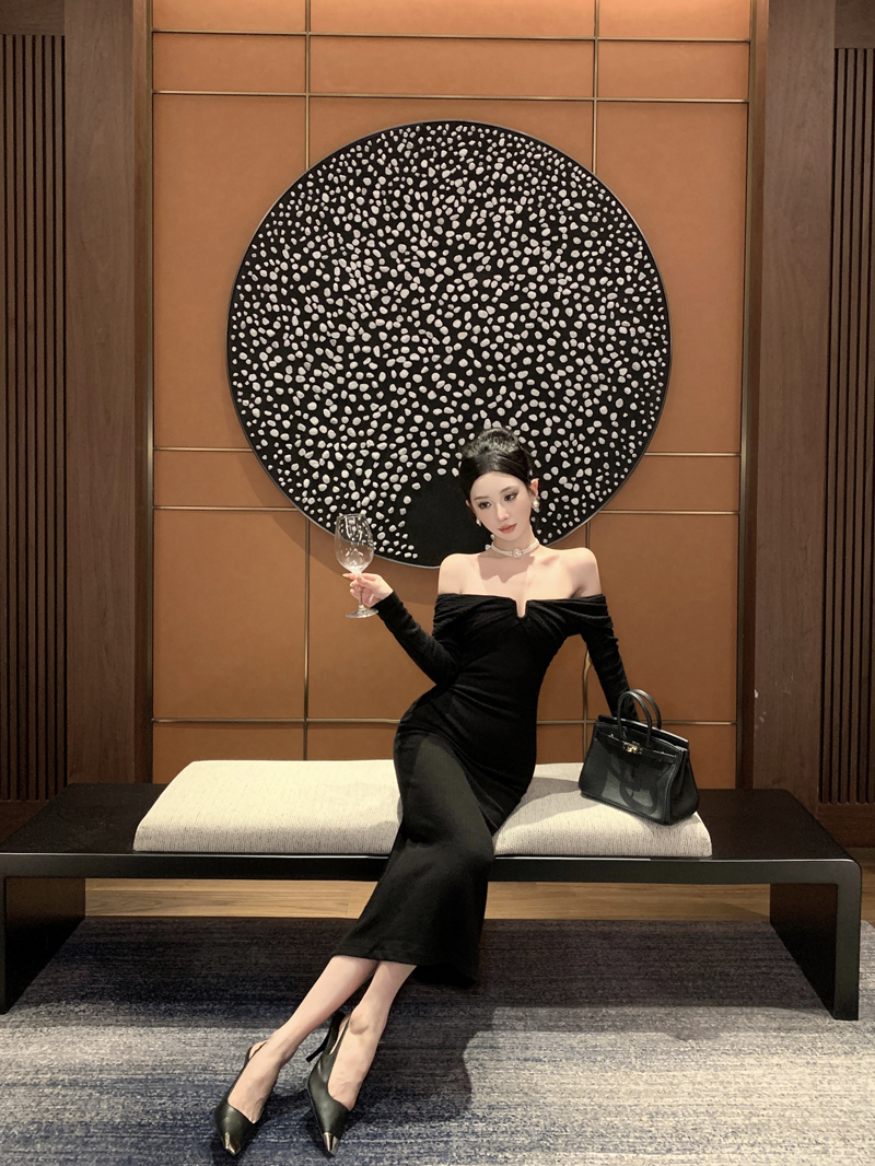 实拍针织连衣裙一字肩礼服性感宴会约会裙黑色气质年会长袖裙