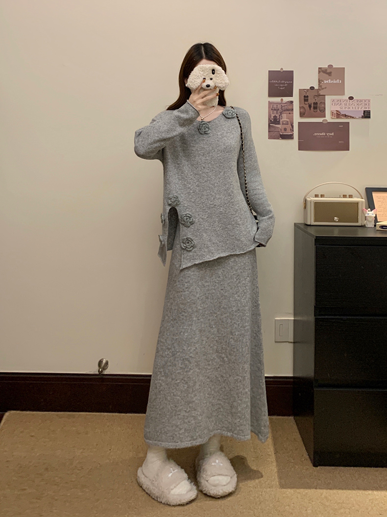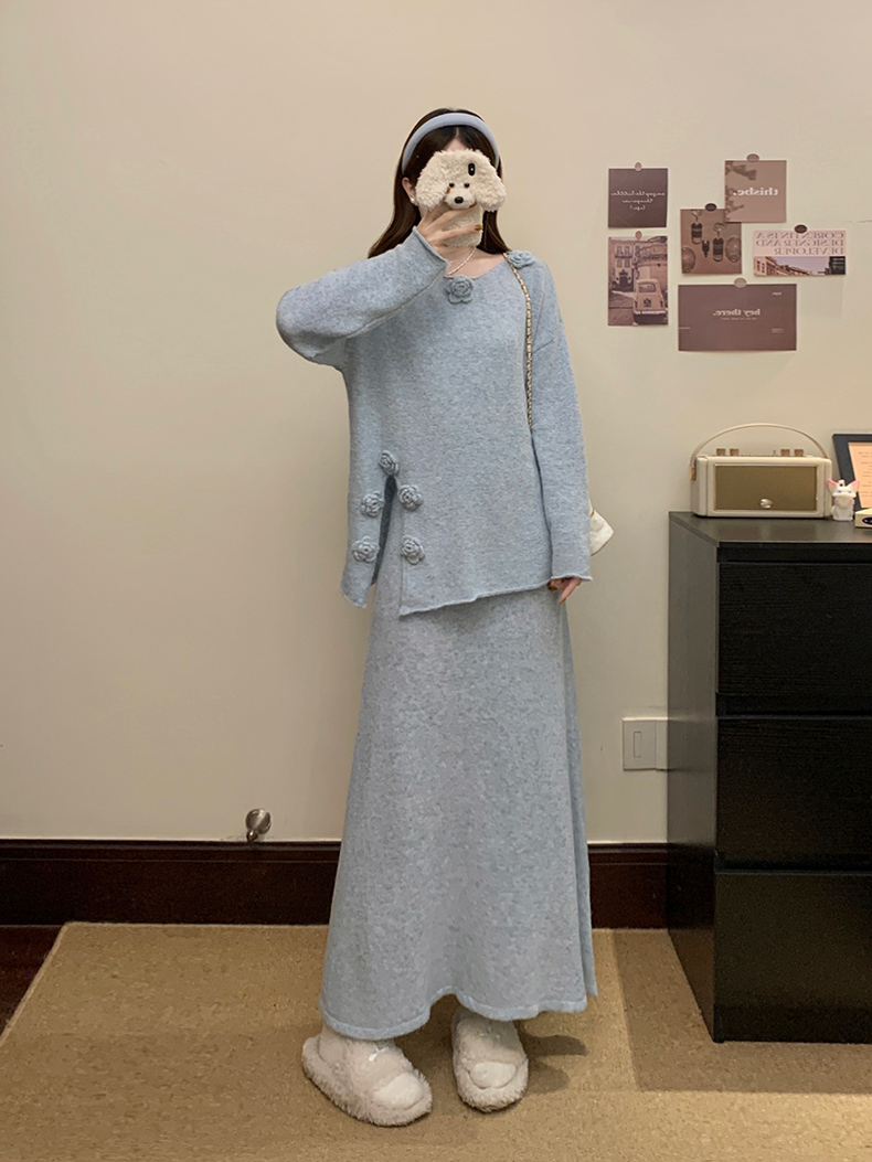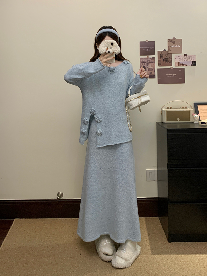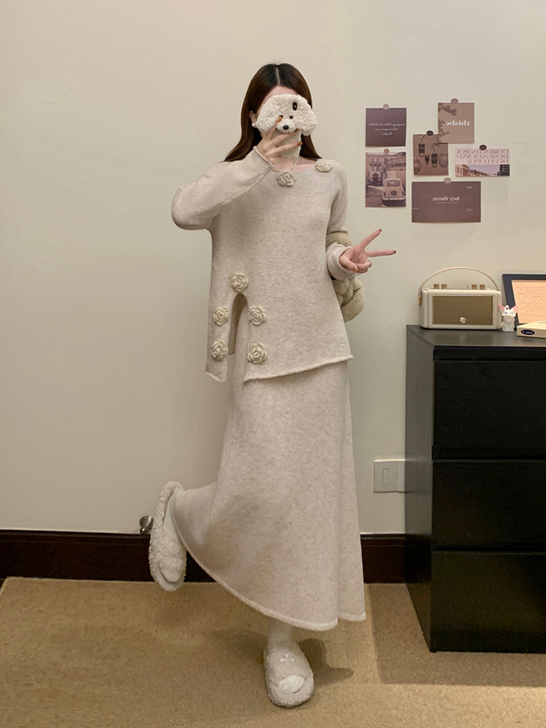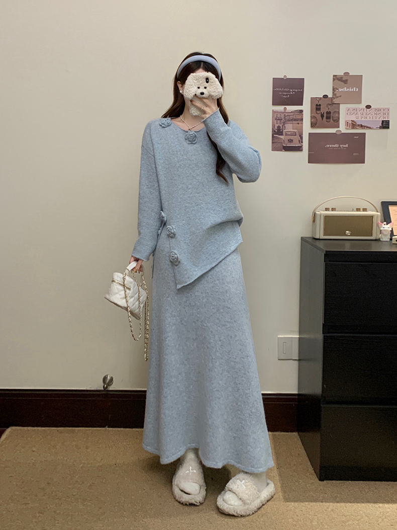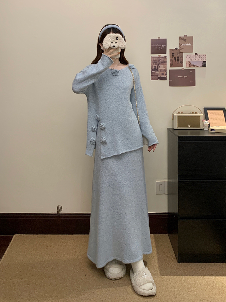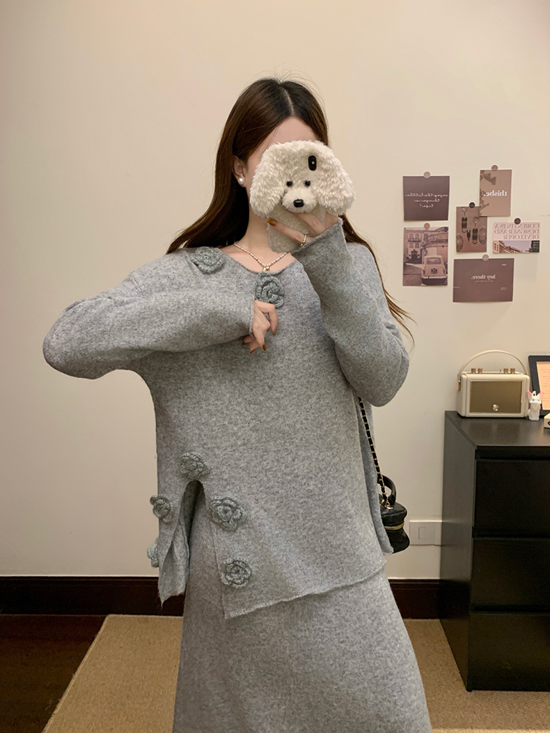 实拍大码秋冬法式温柔风设计感立体花朵针织软糯毛衣+半身裙套装