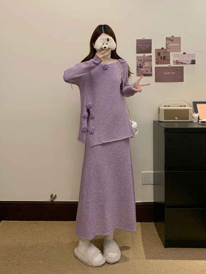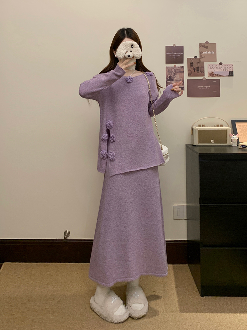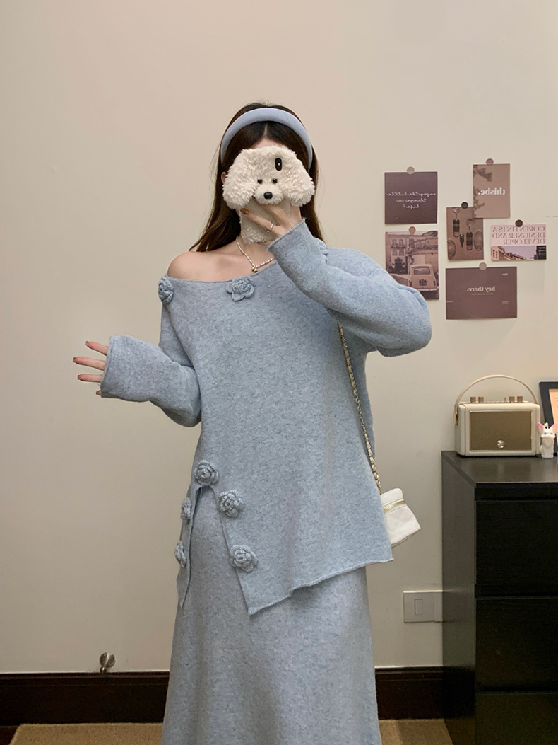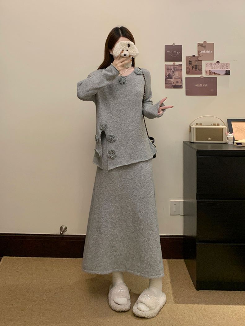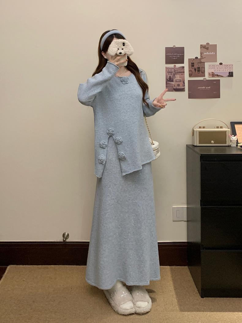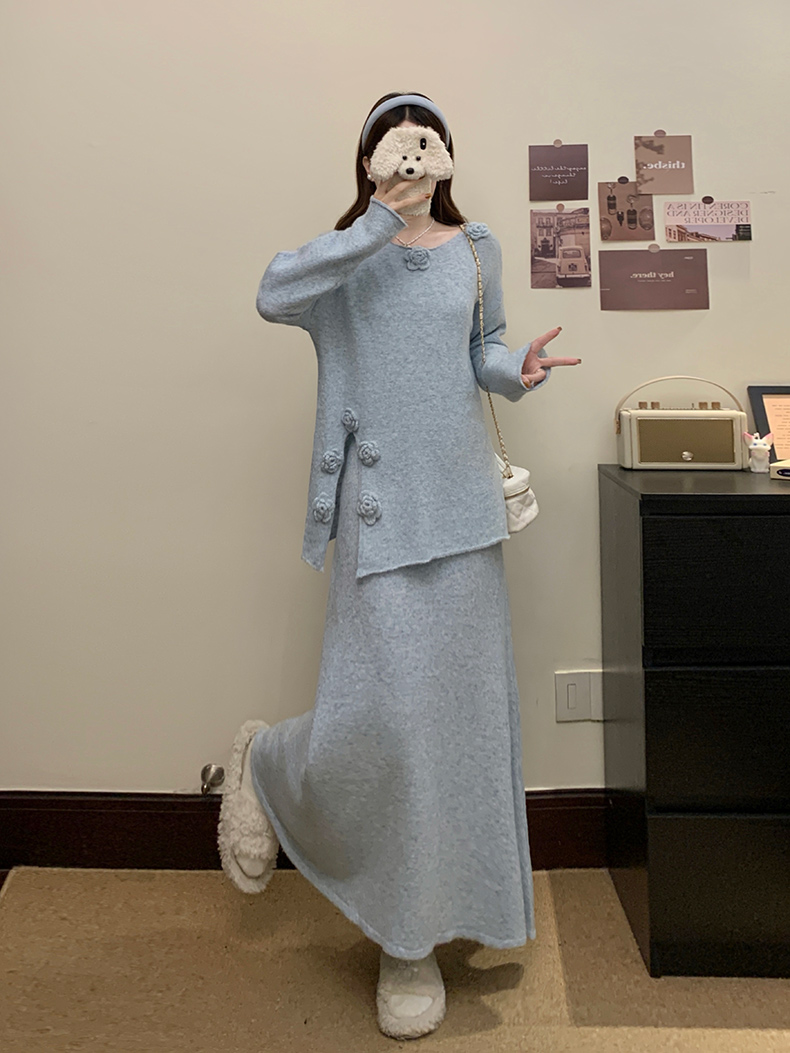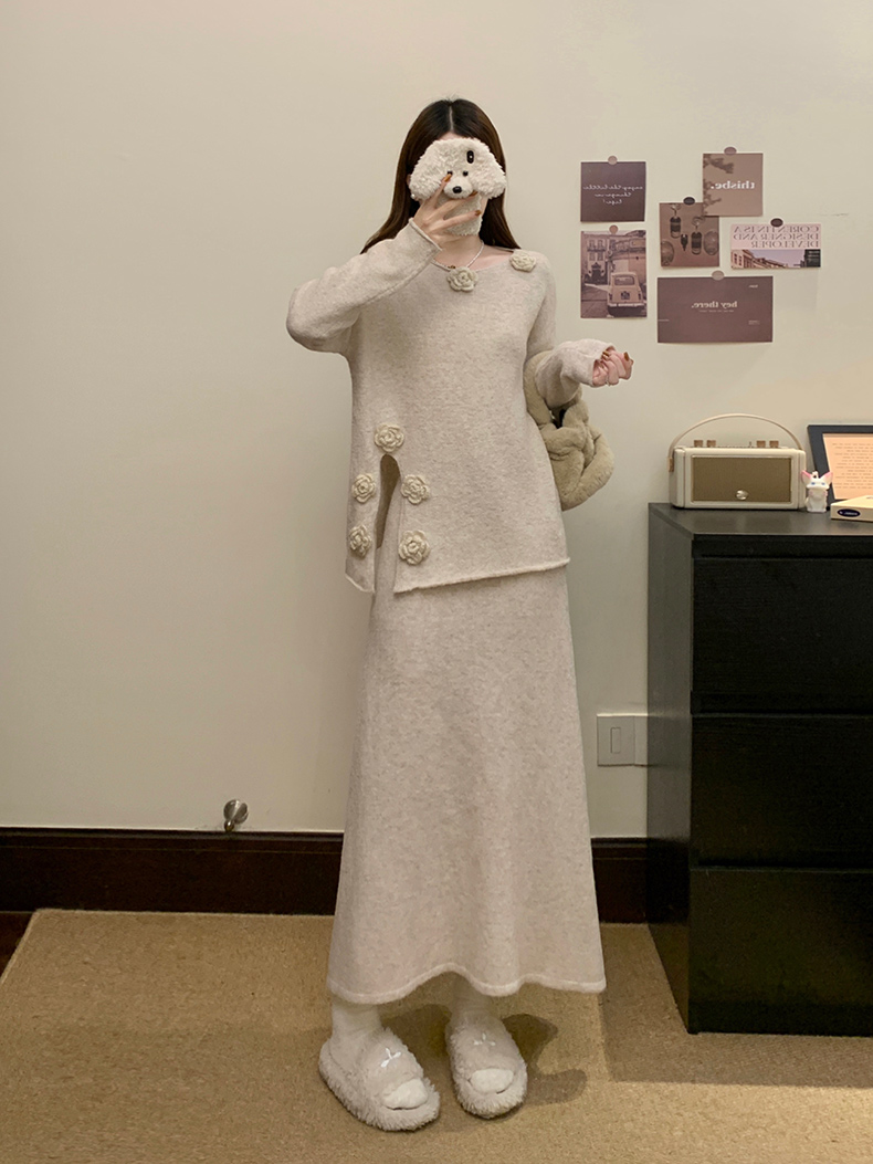 实拍大码秋冬法式温柔风设计感立体花朵针织软糯毛衣+半身裙套装