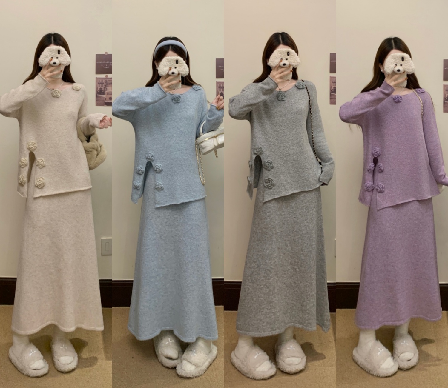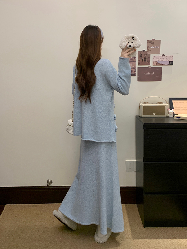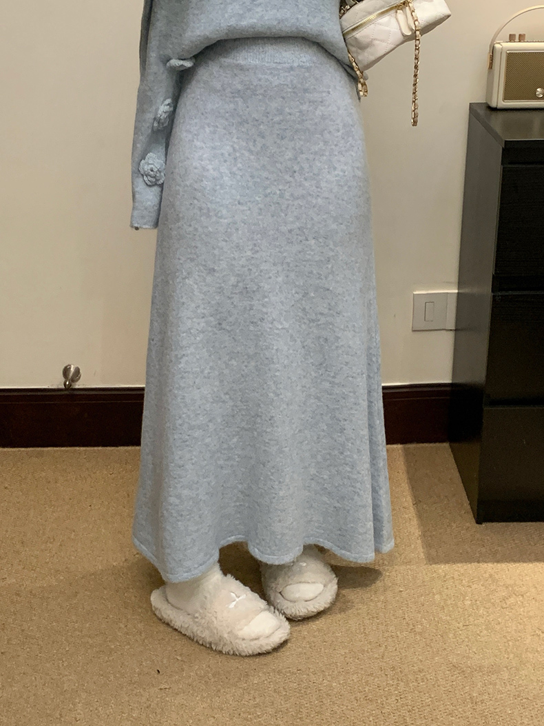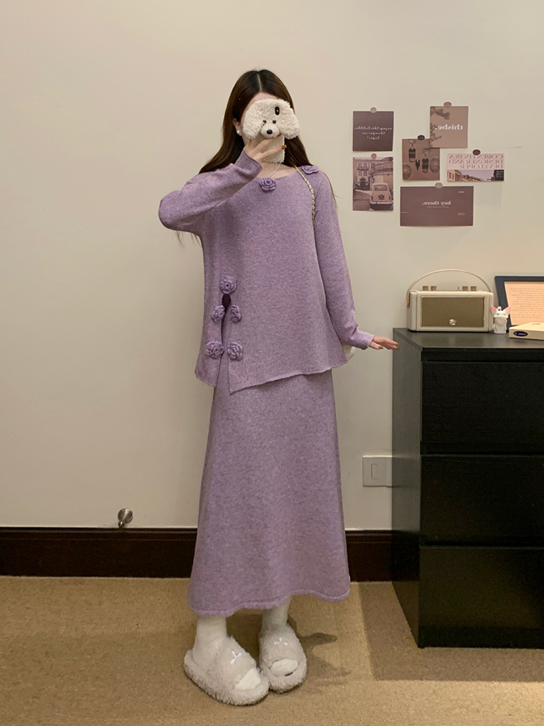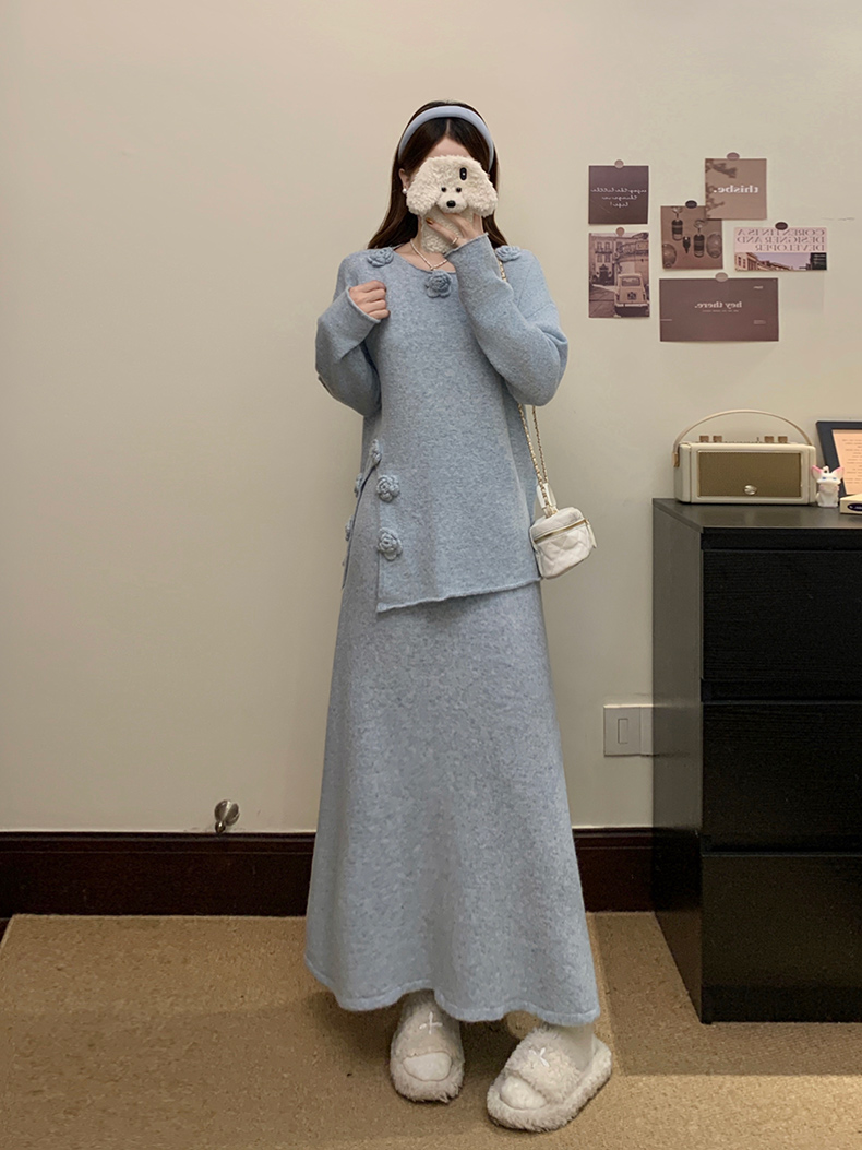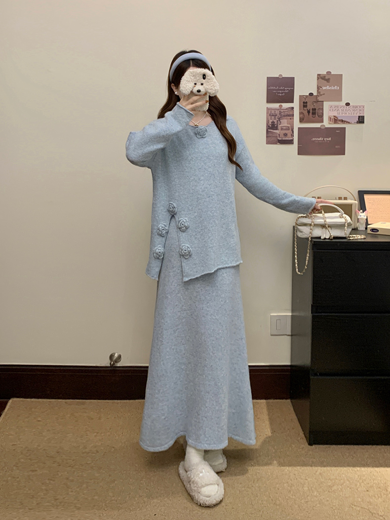 实拍大码秋冬法式温柔风设计感立体花朵针织软糯毛衣+半身裙套装