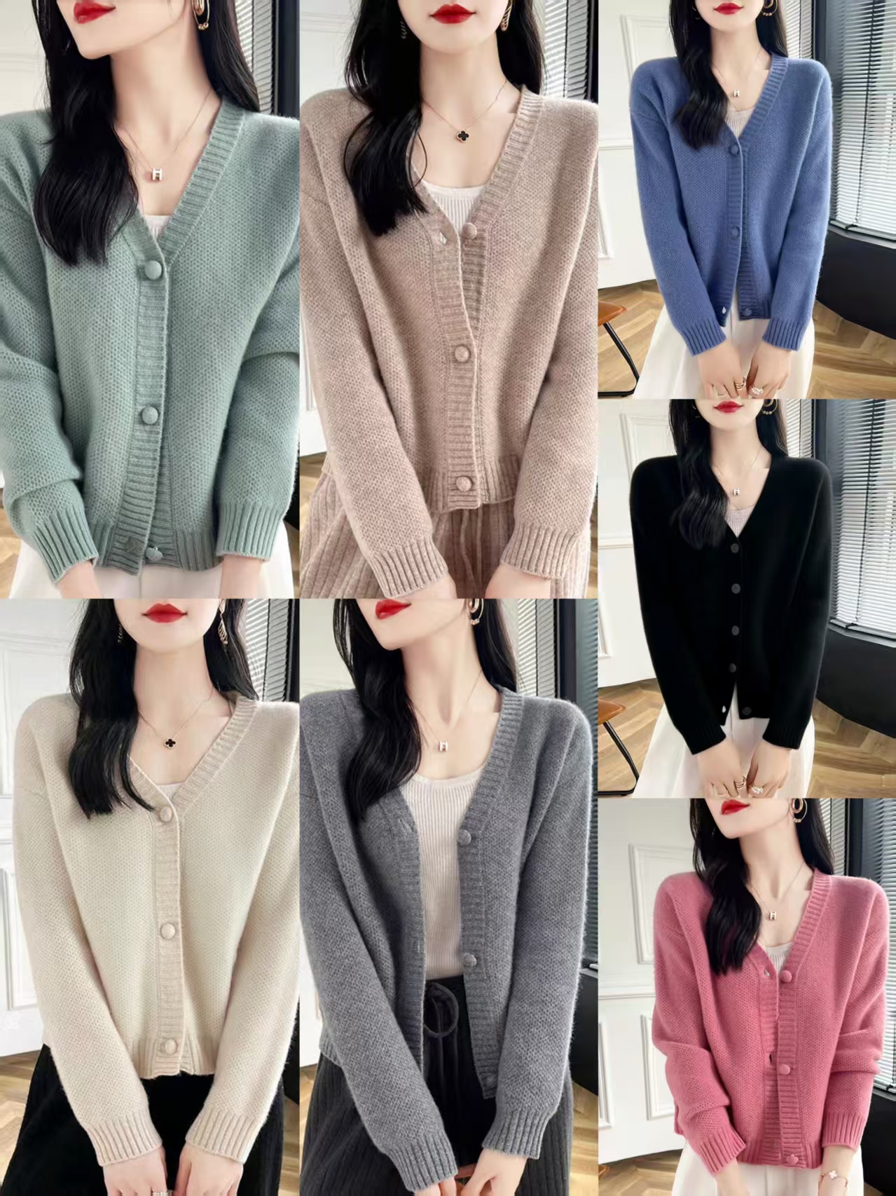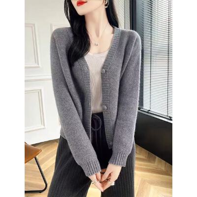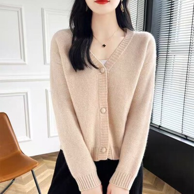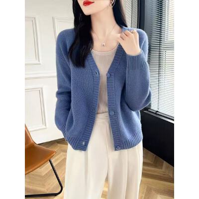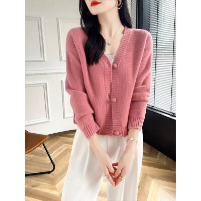 春秋装短款针织纯色羊绒V领开衫女韩版百搭毛衣外套长袖外搭上衣