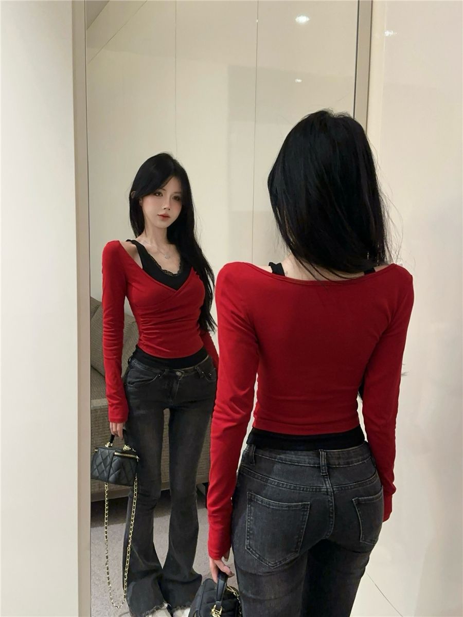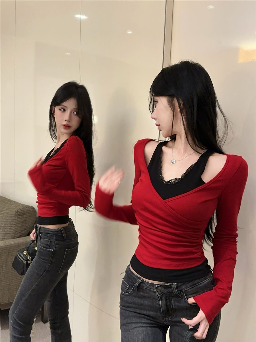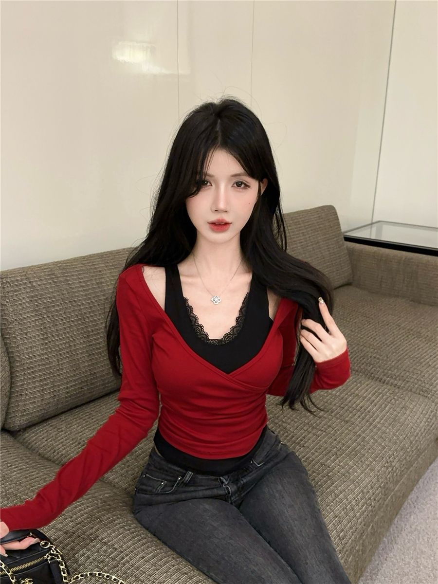 蕾丝假两件打底衫女秋冬季2025新款红色内搭短款V领纯欲长袖上衣
