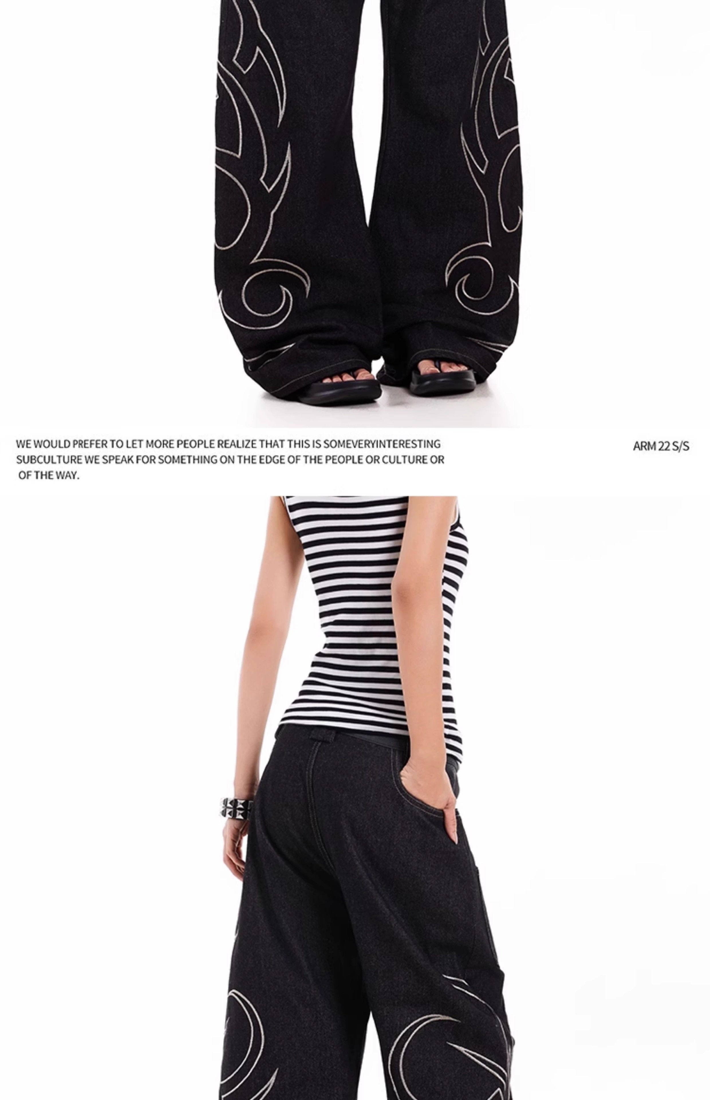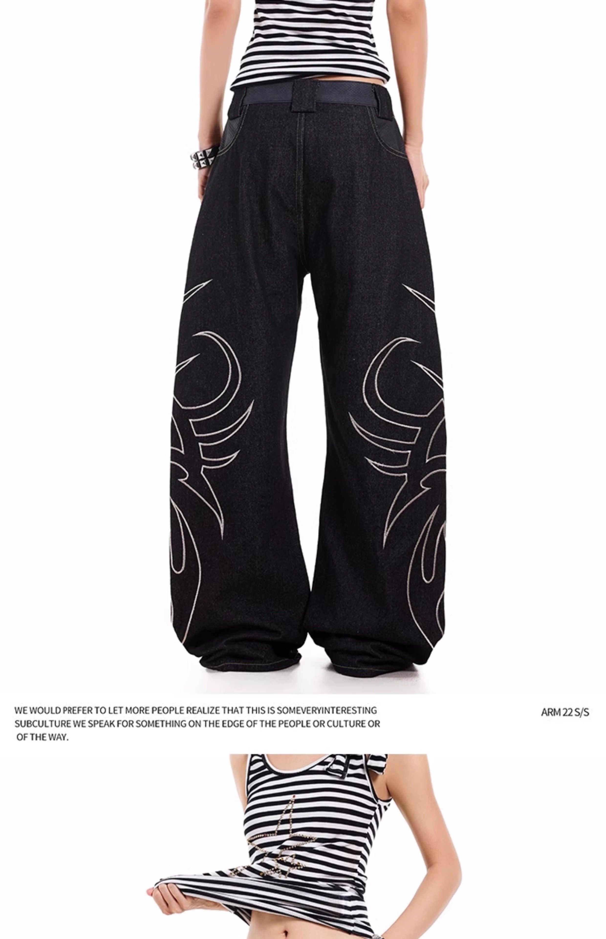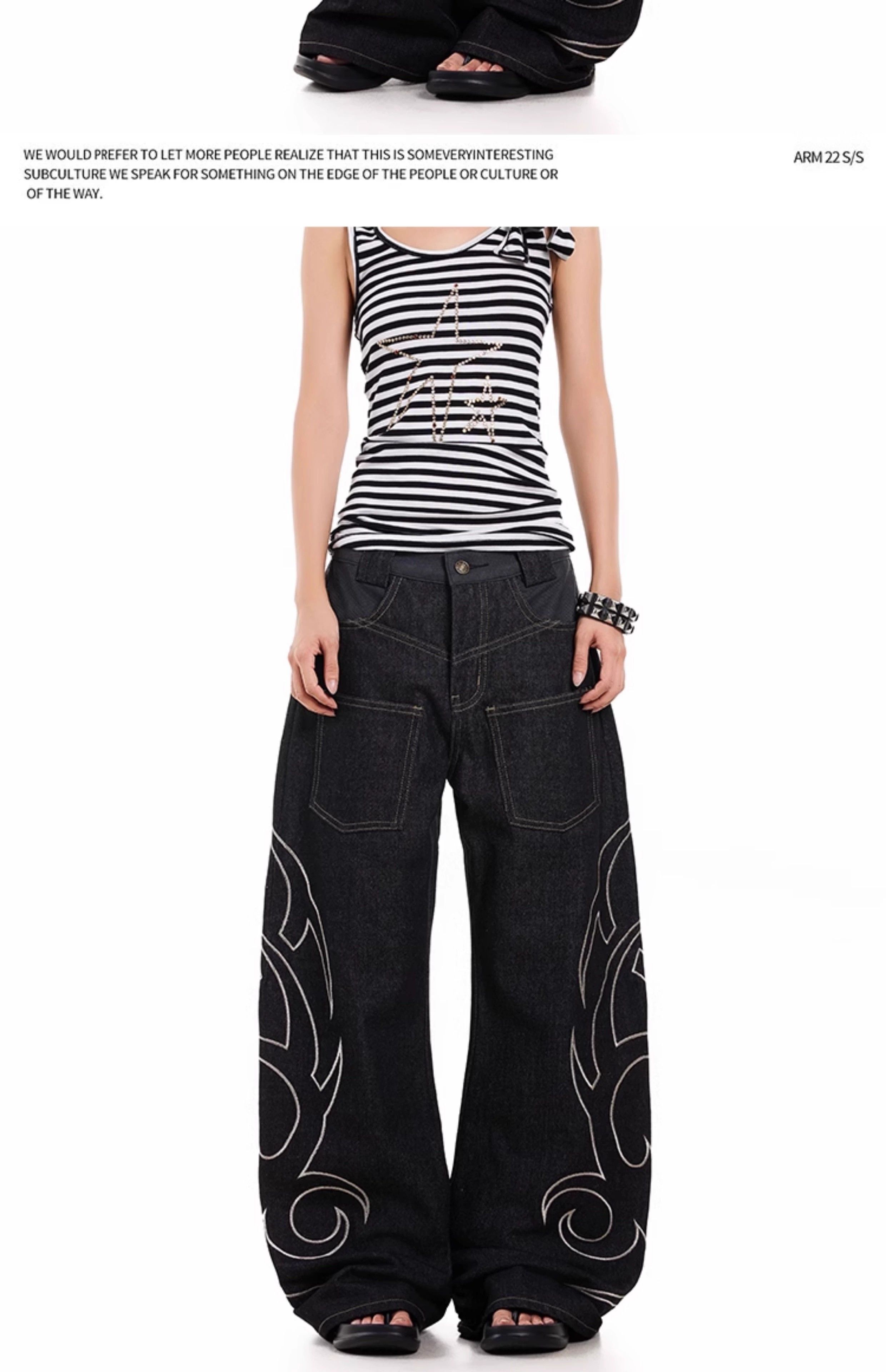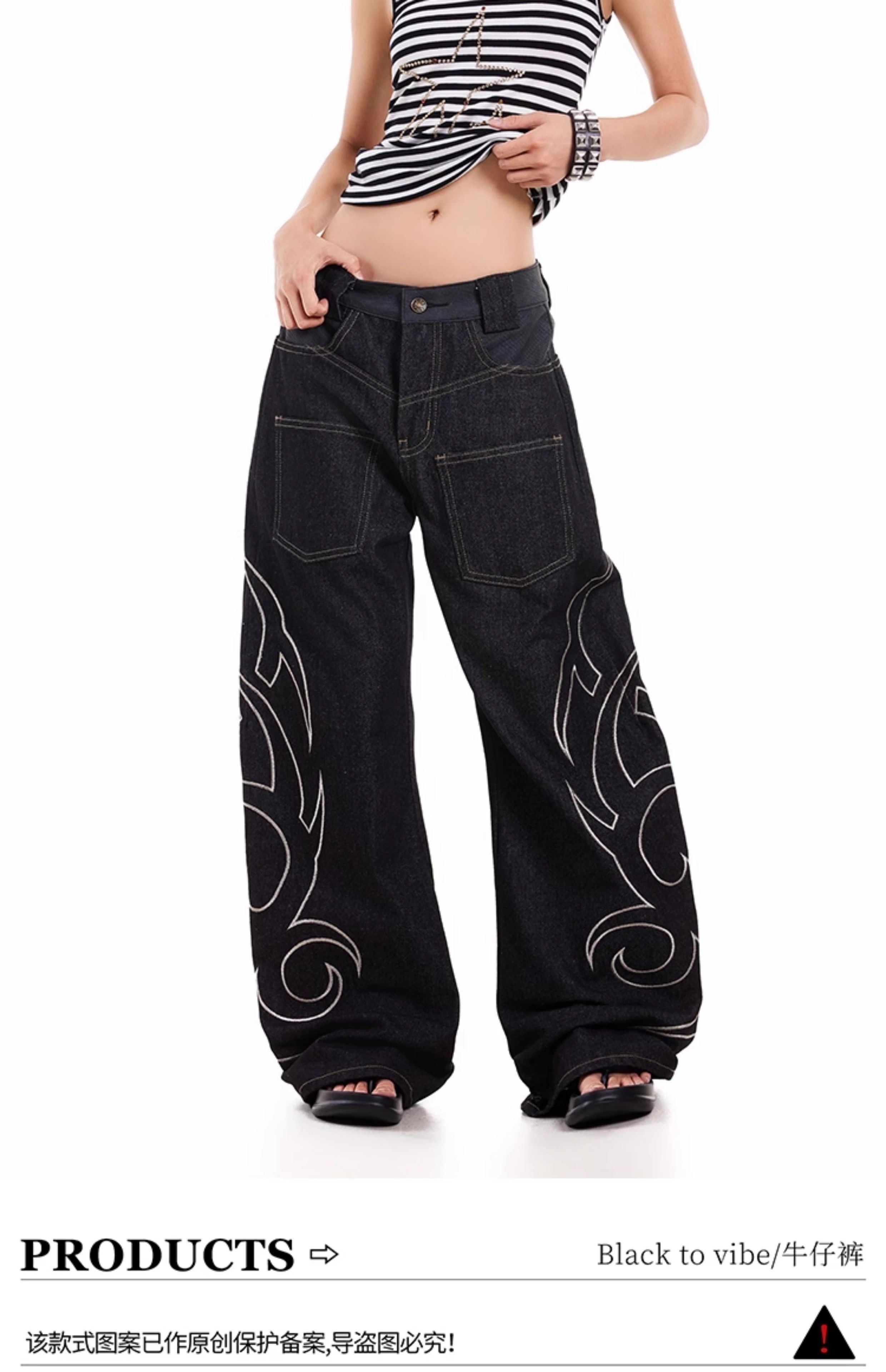 蛇皮拼接原牛美式图腾印花弯刀牛仔裤反口袋宽松休闲阔腿长裤