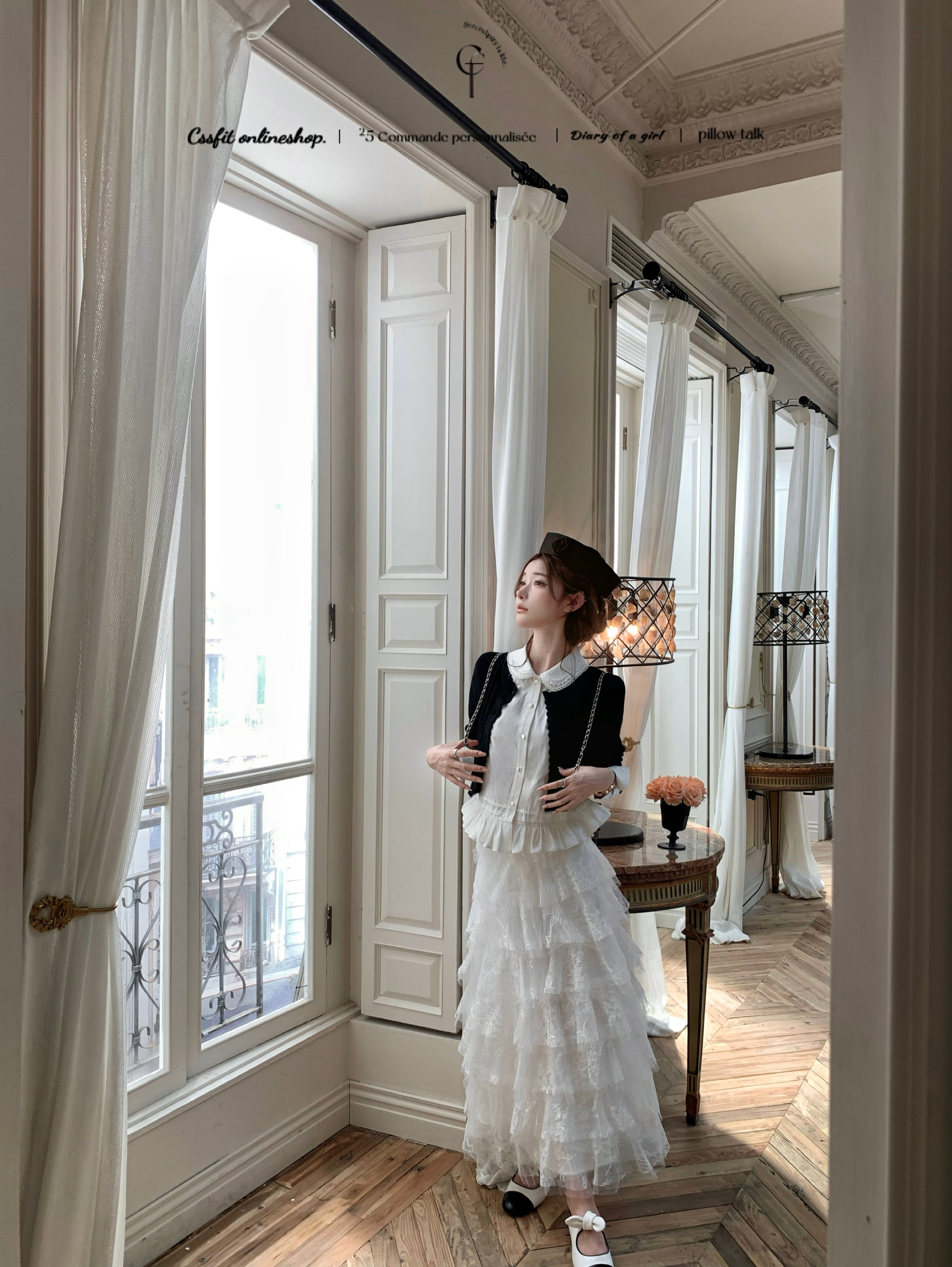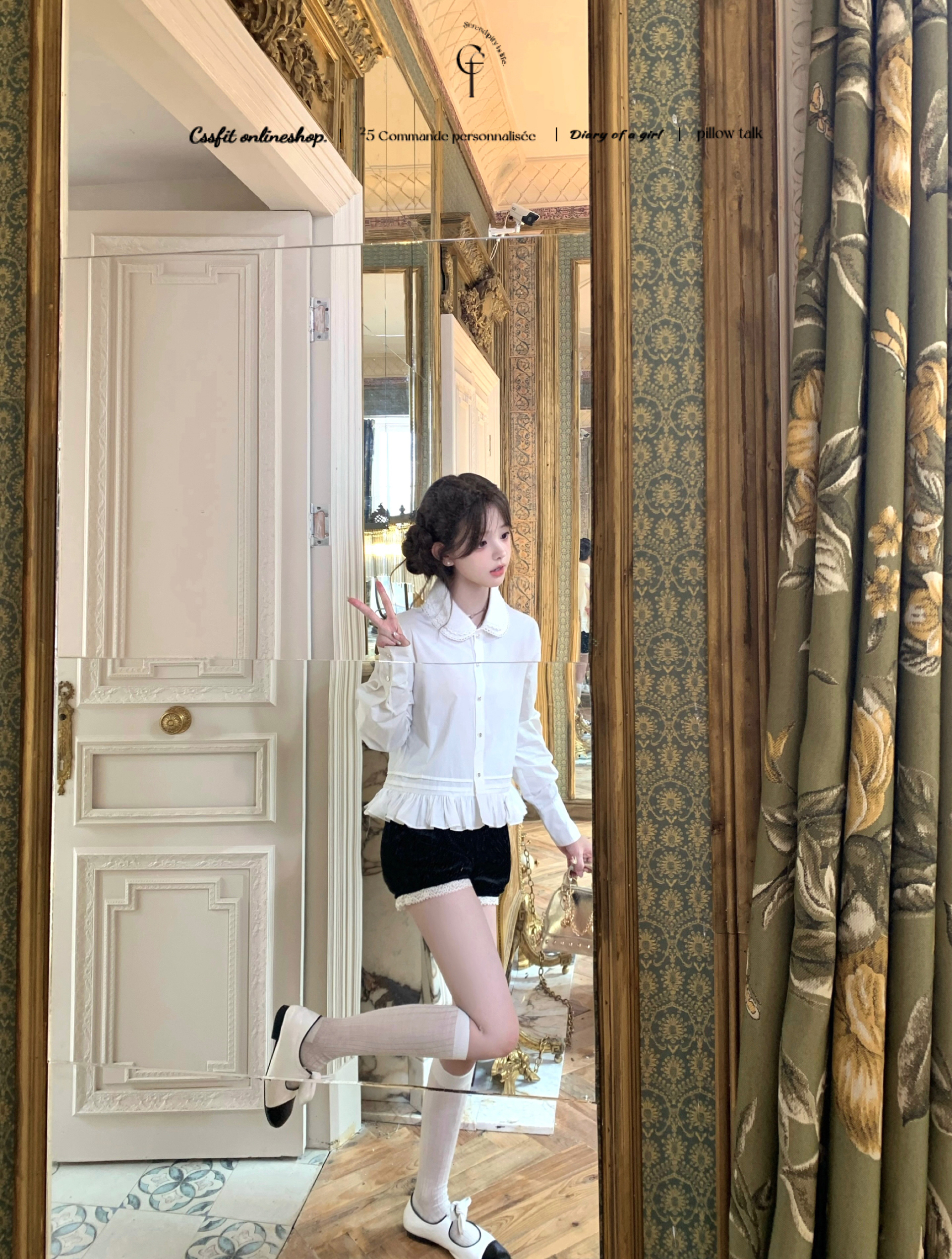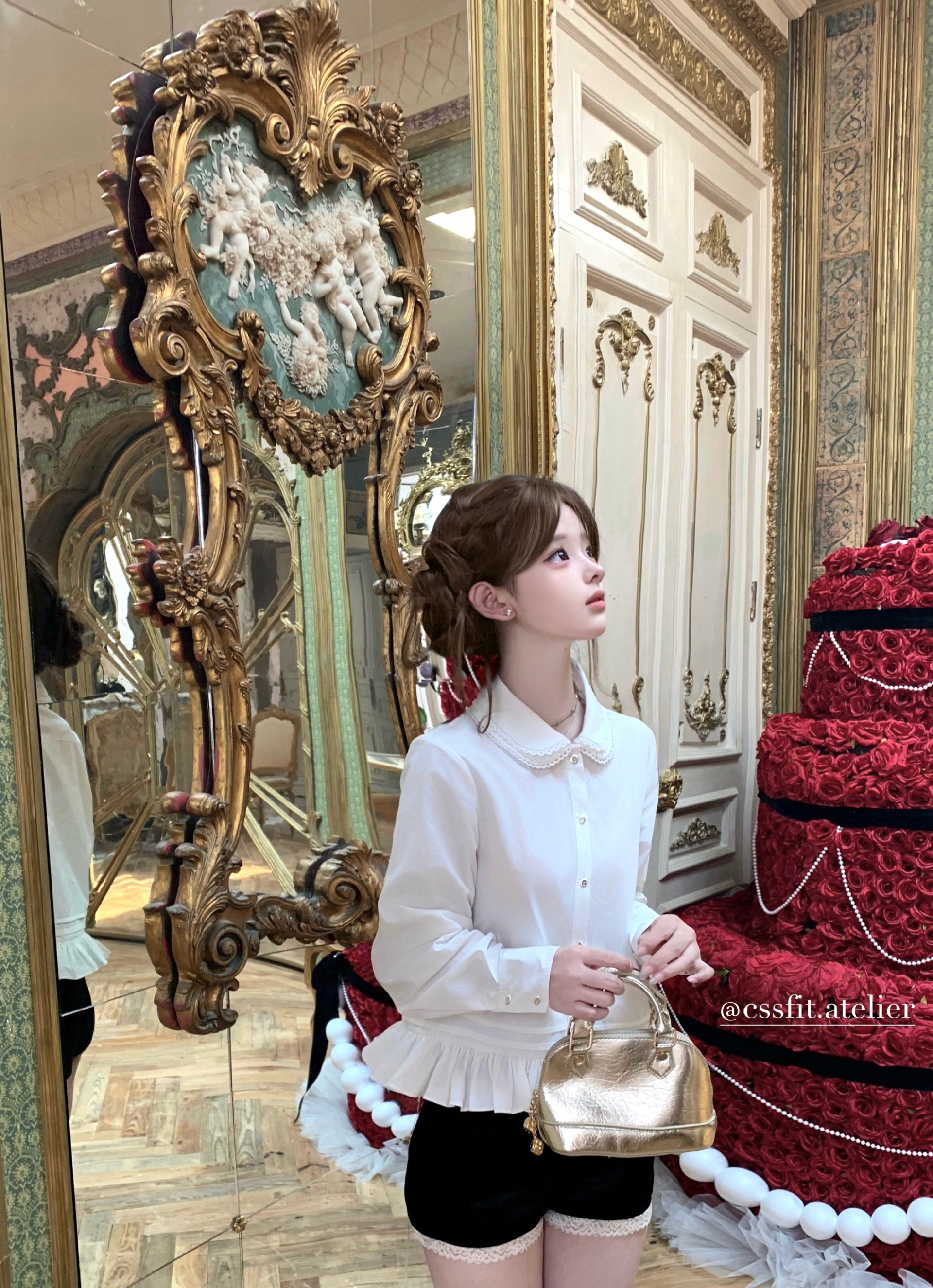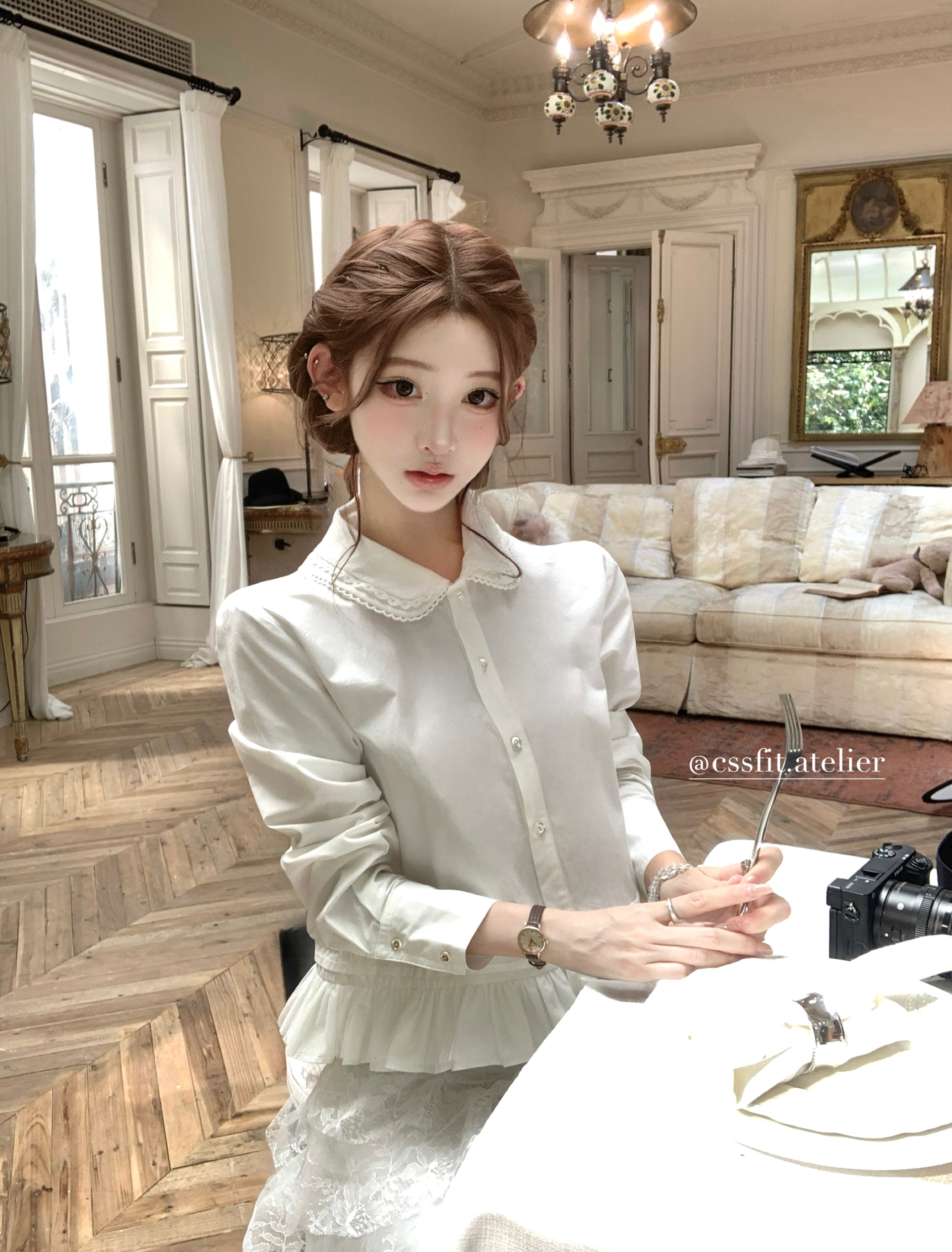 迟伞伞25/fw 绢羽笔尖 小卓花边拼纱下摆刺绣领纯棉白衬衫上衣