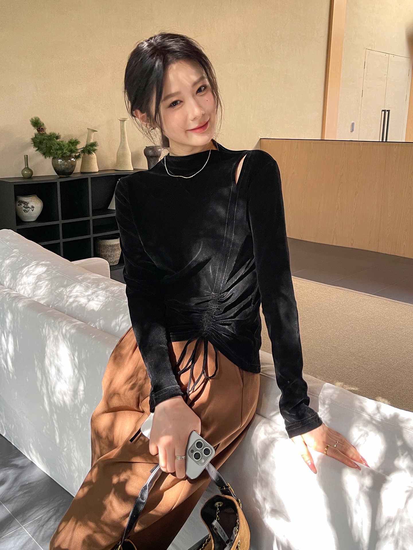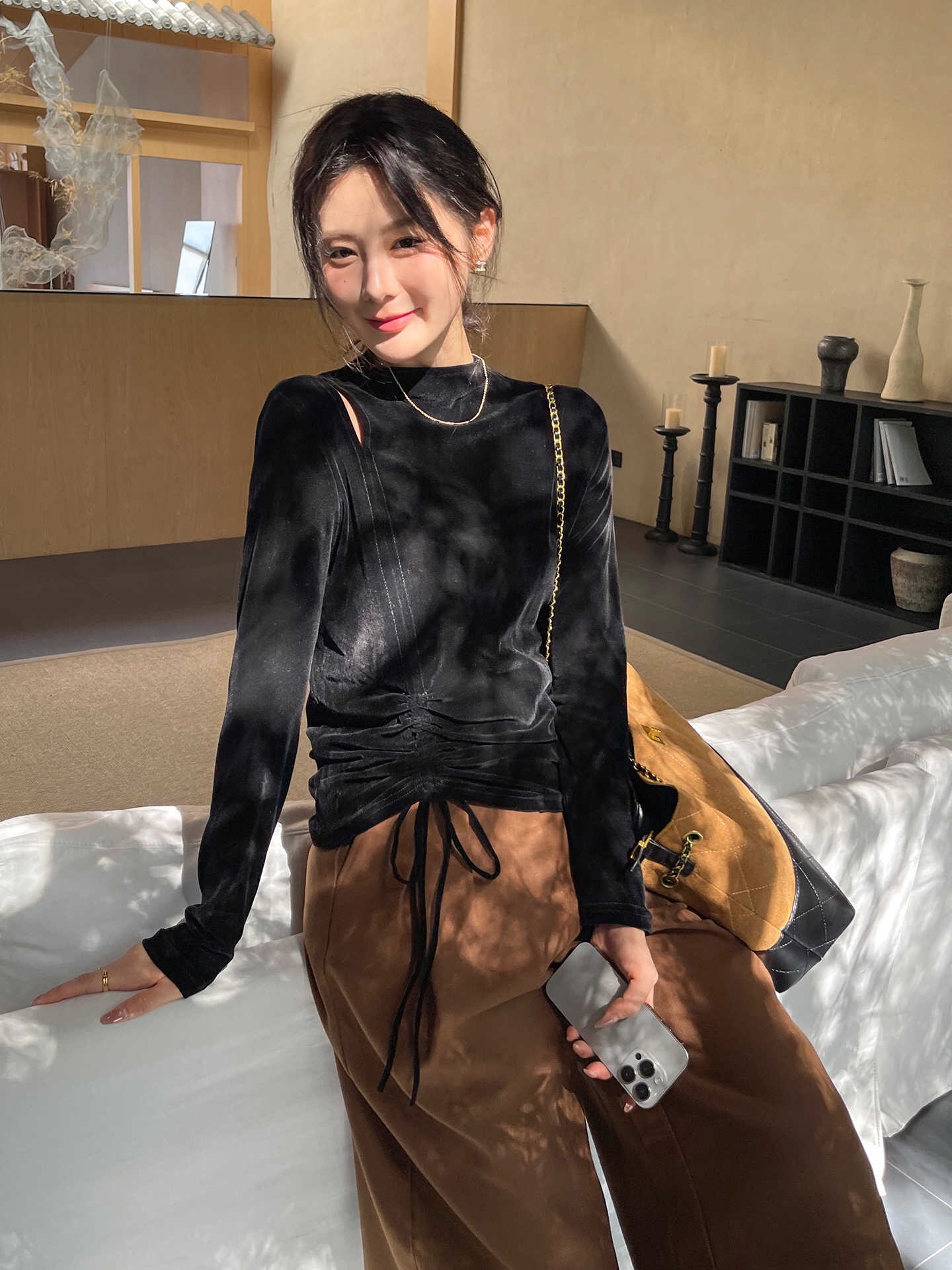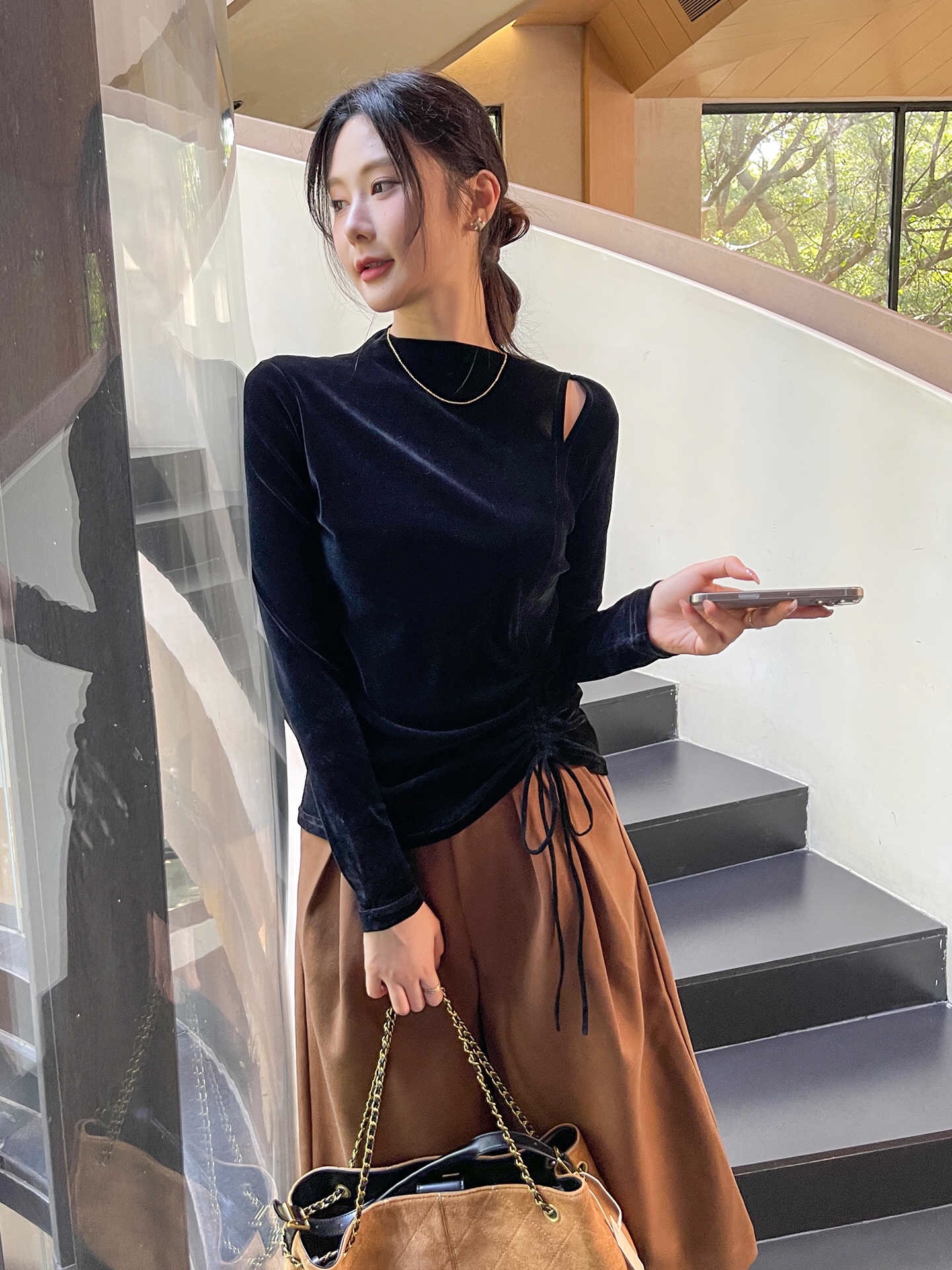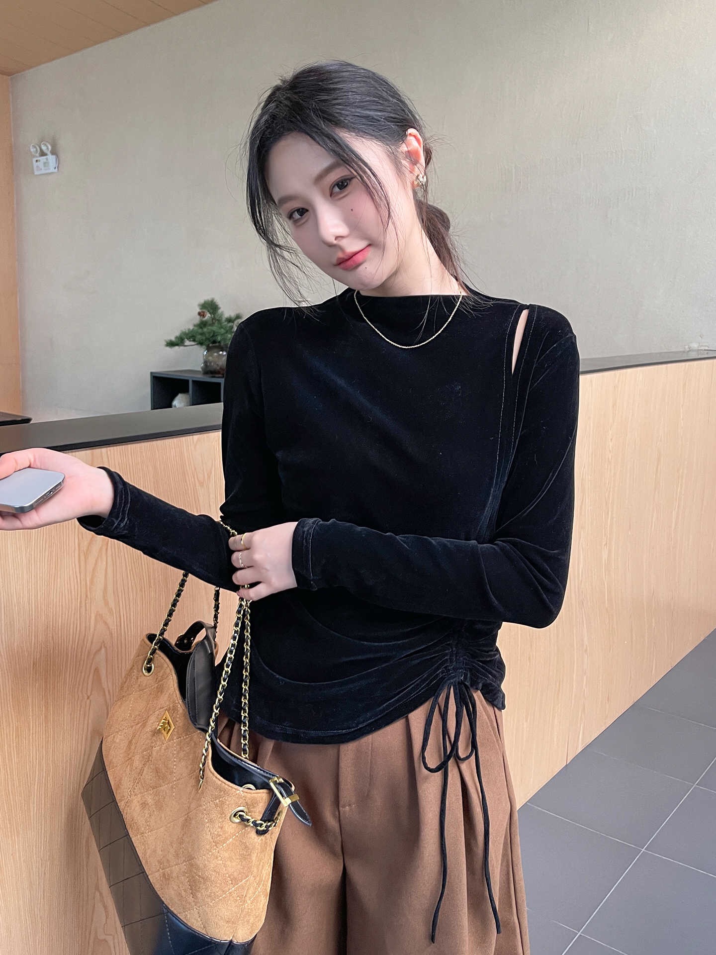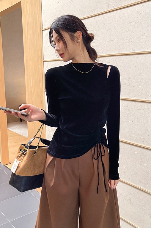 半高领镂空丝绒黑色打底衫女2025新款春秋不规则长袖t恤内搭上衣