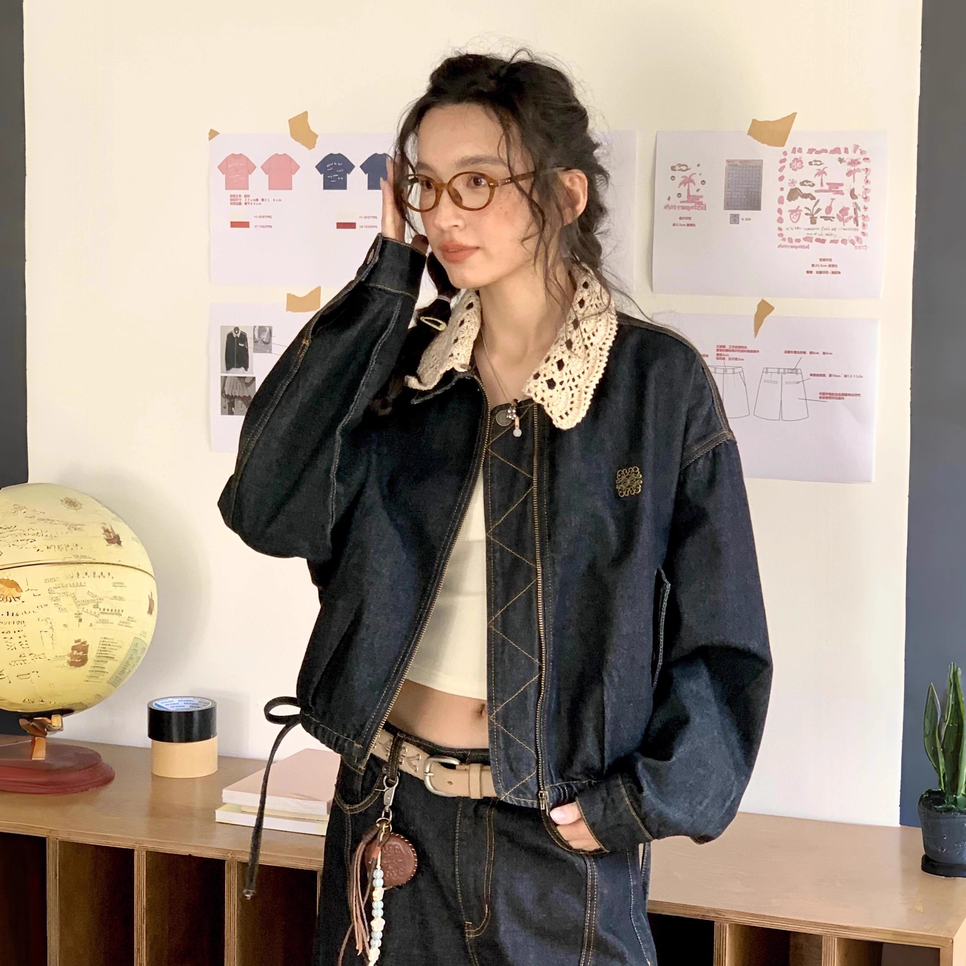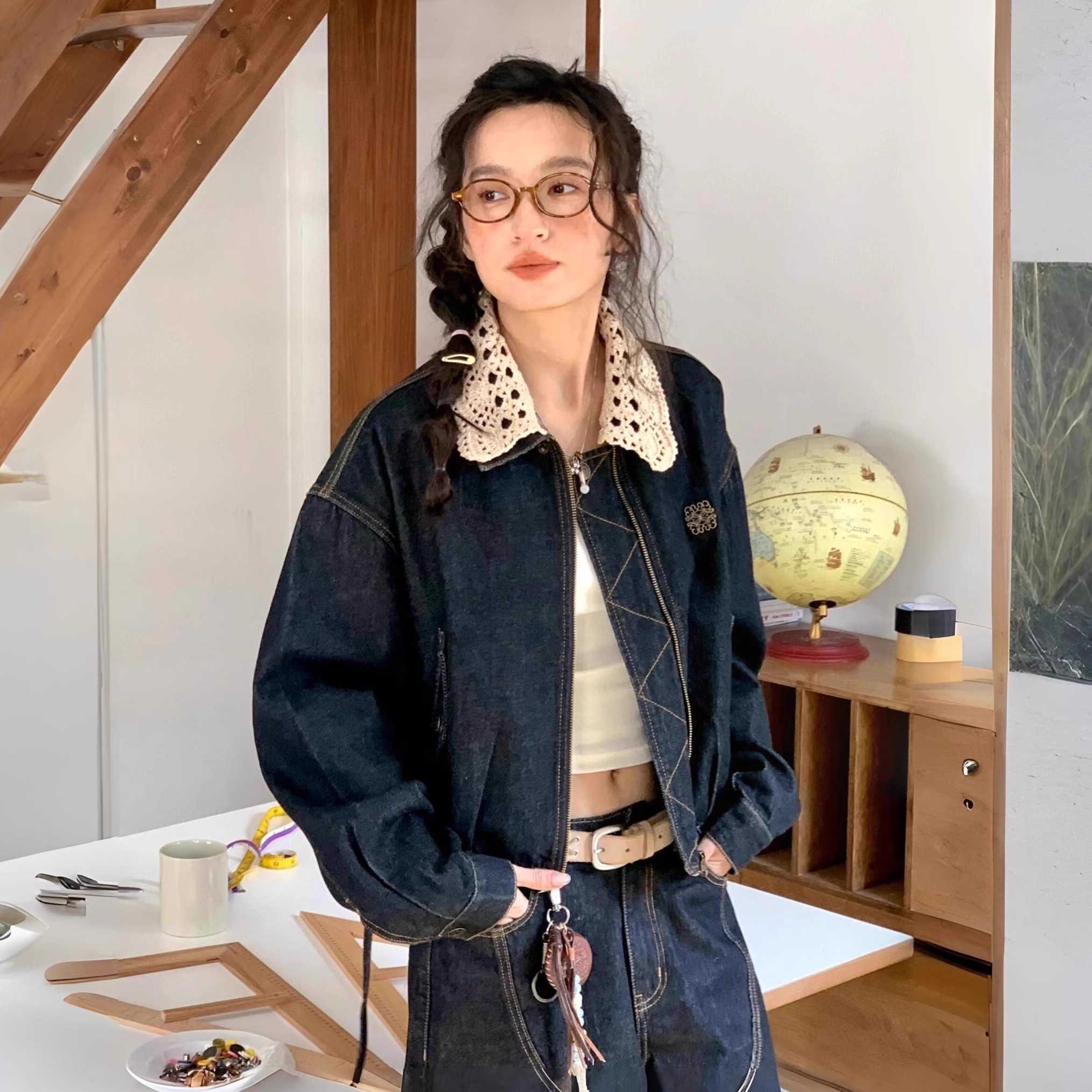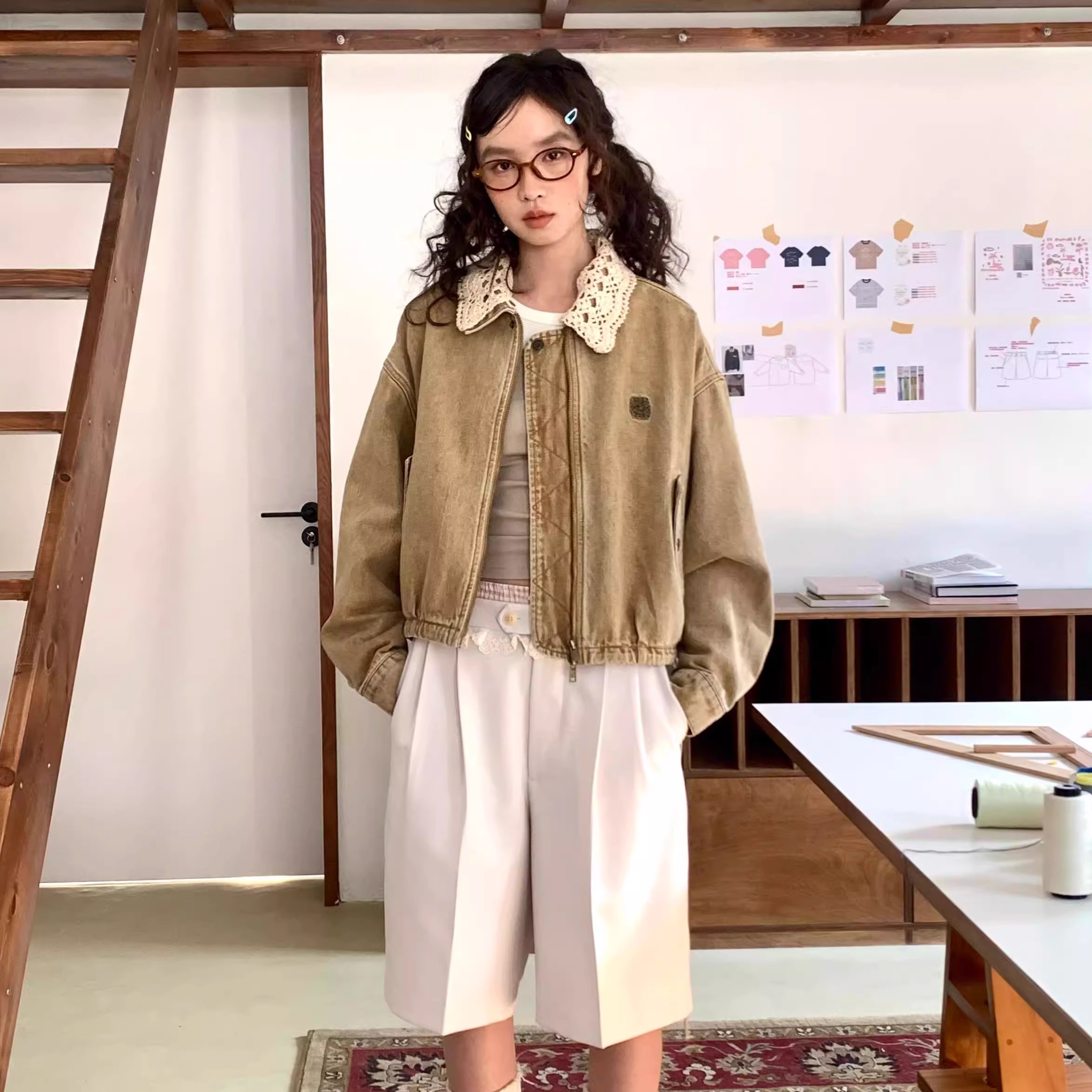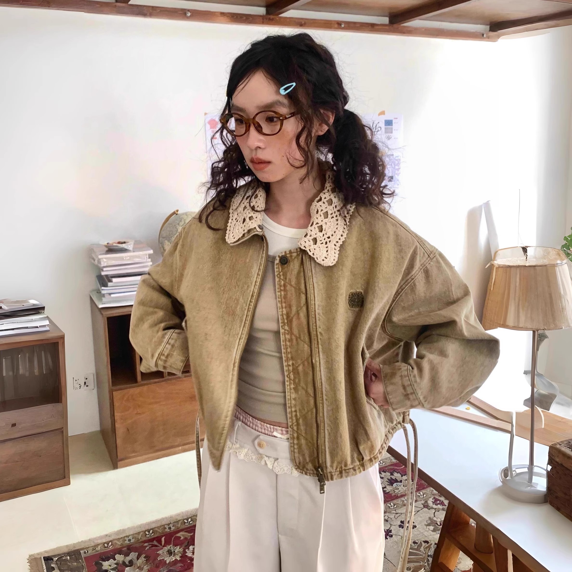R59 Lace复古卡其千金酷飒风短款夹克外套女秋小个子宽松水洗牛仔