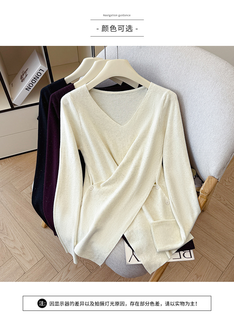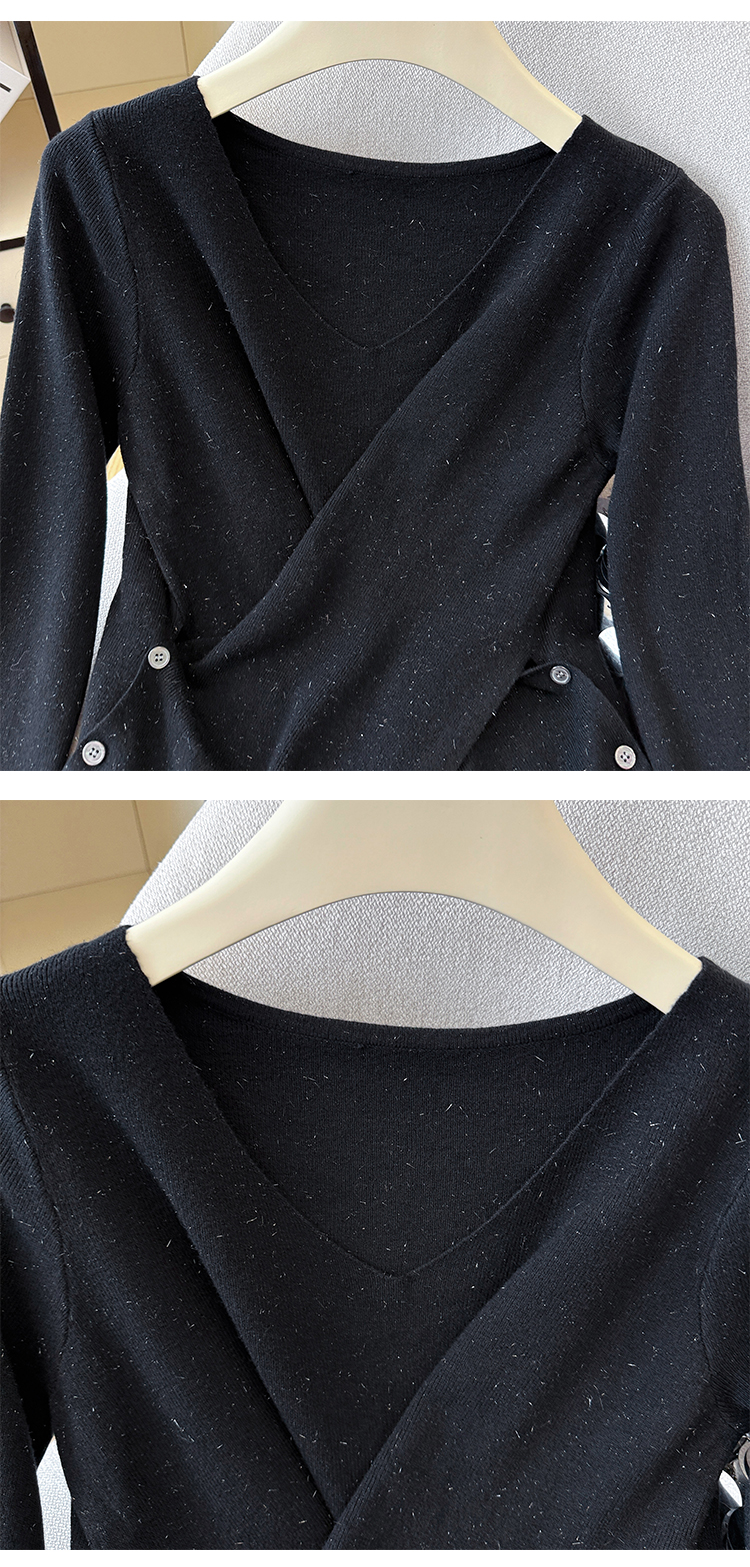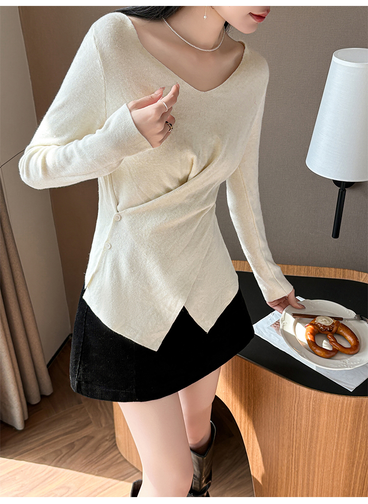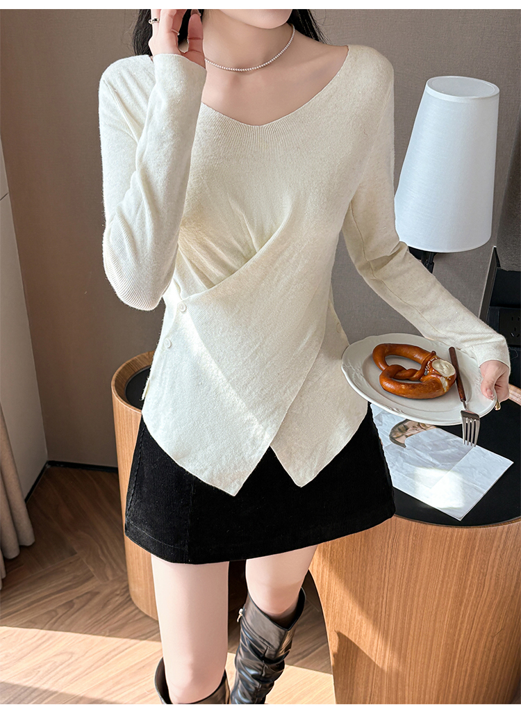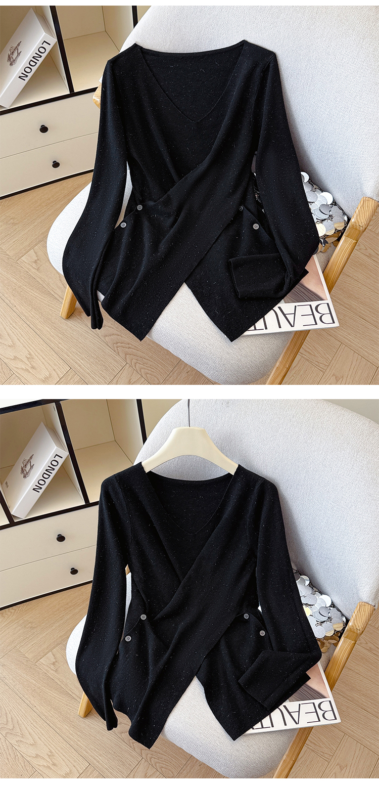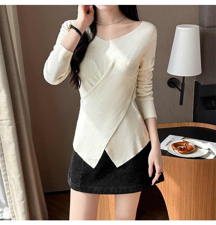 有货秋冬亮丝V领不规则打底衫女设计感褶皱含羊毛上衣长袖针织衫