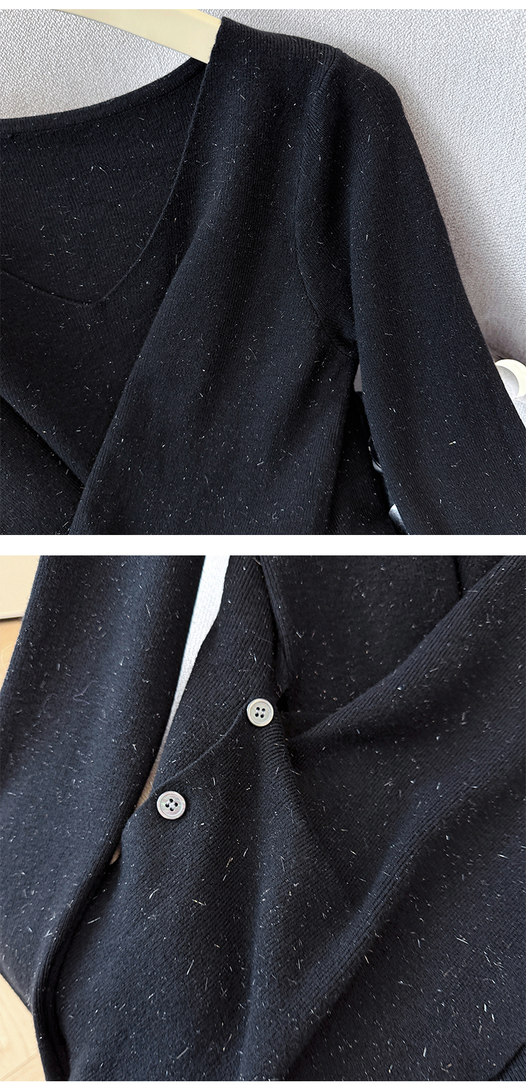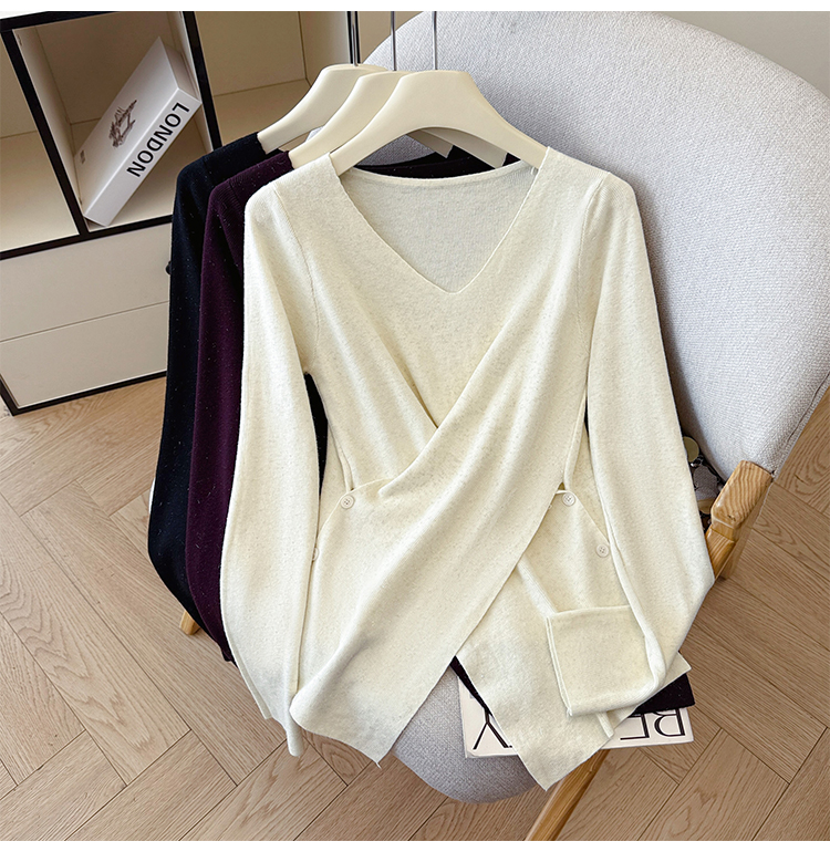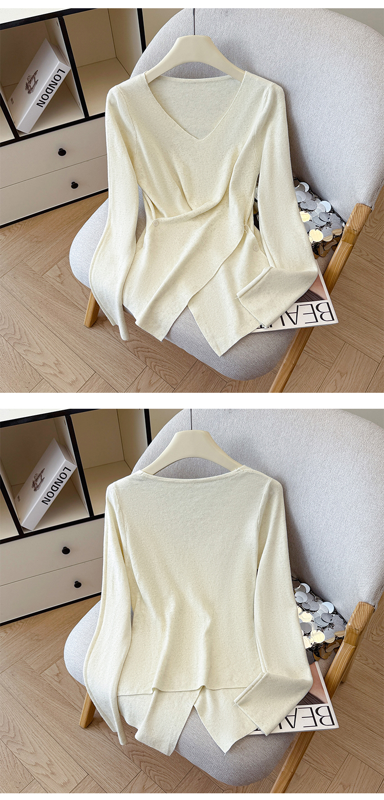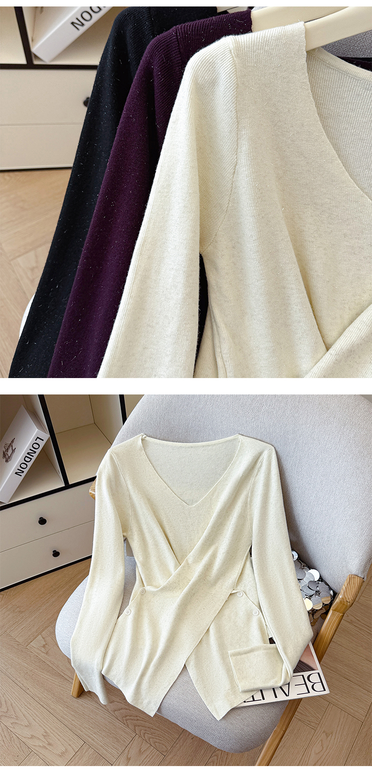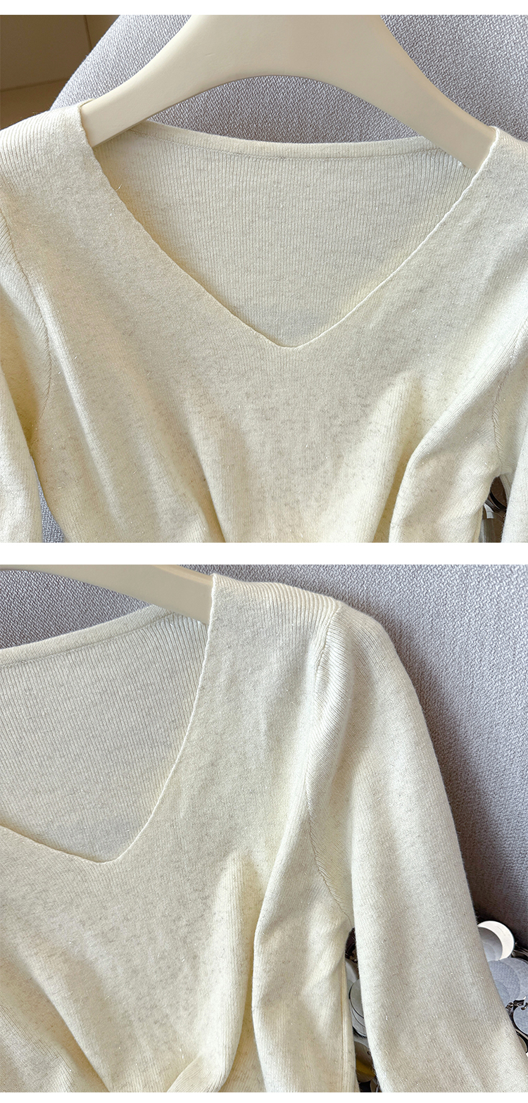 有货秋冬亮丝V领不规则打底衫女设计感褶皱含羊毛上衣长袖针织衫
