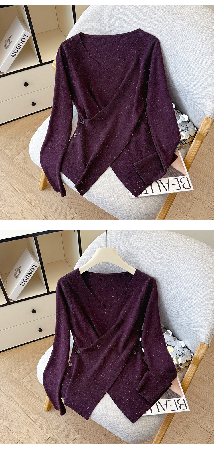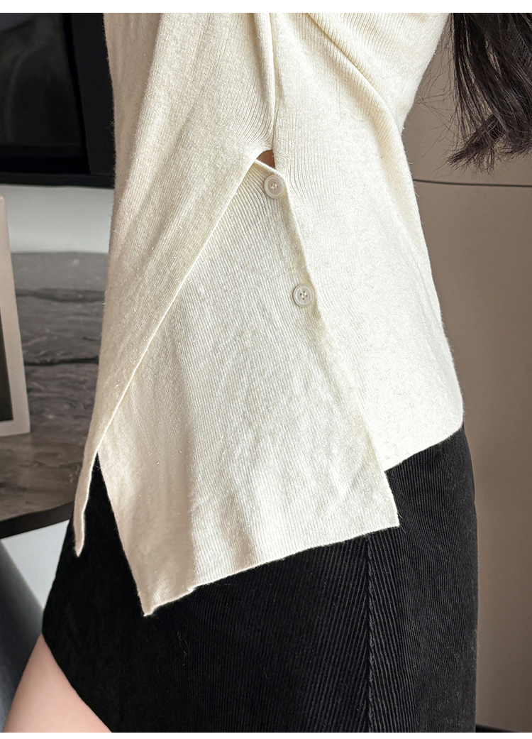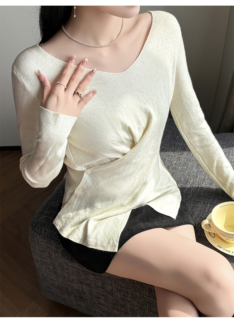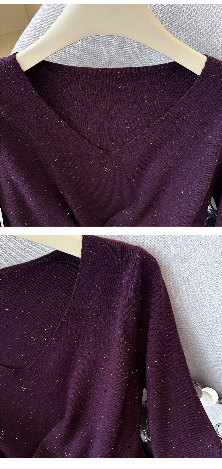 有货秋冬亮丝V领不规则打底衫女设计感褶皱含羊毛上衣长袖针织衫