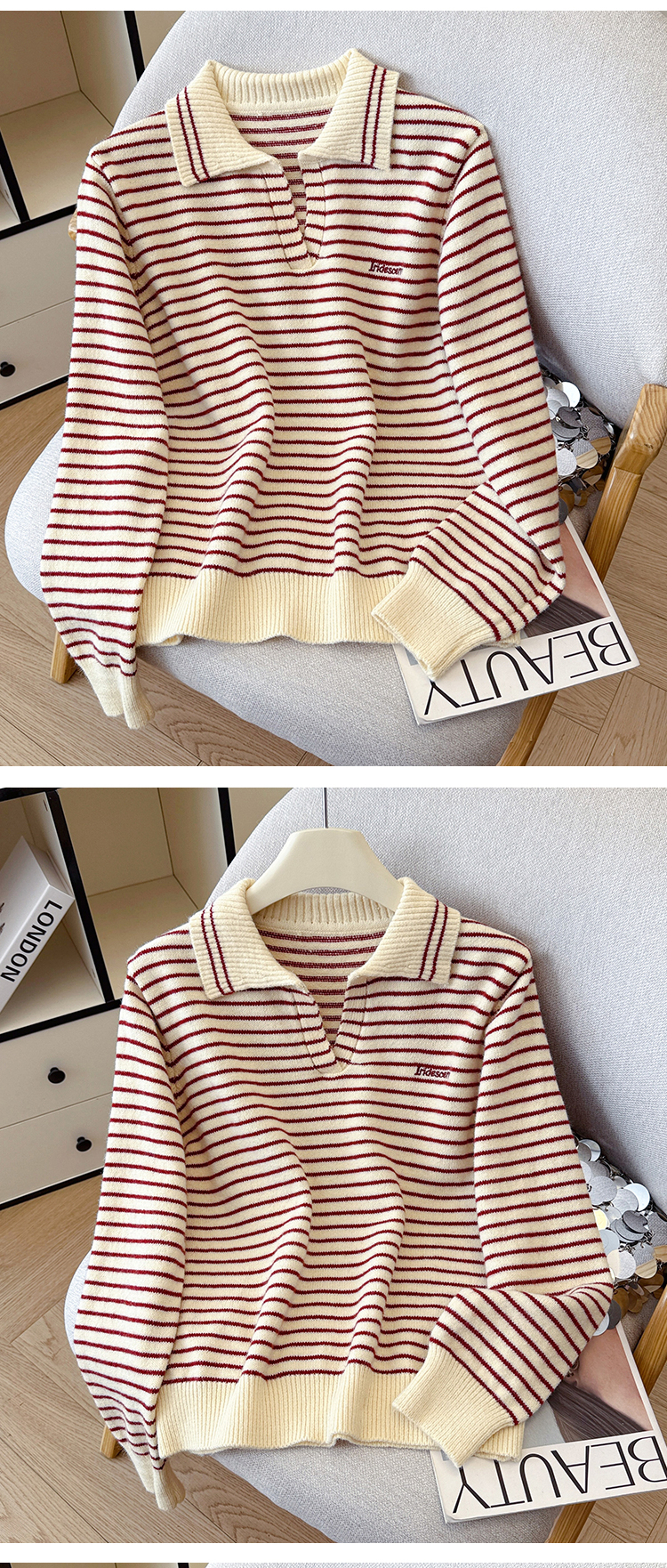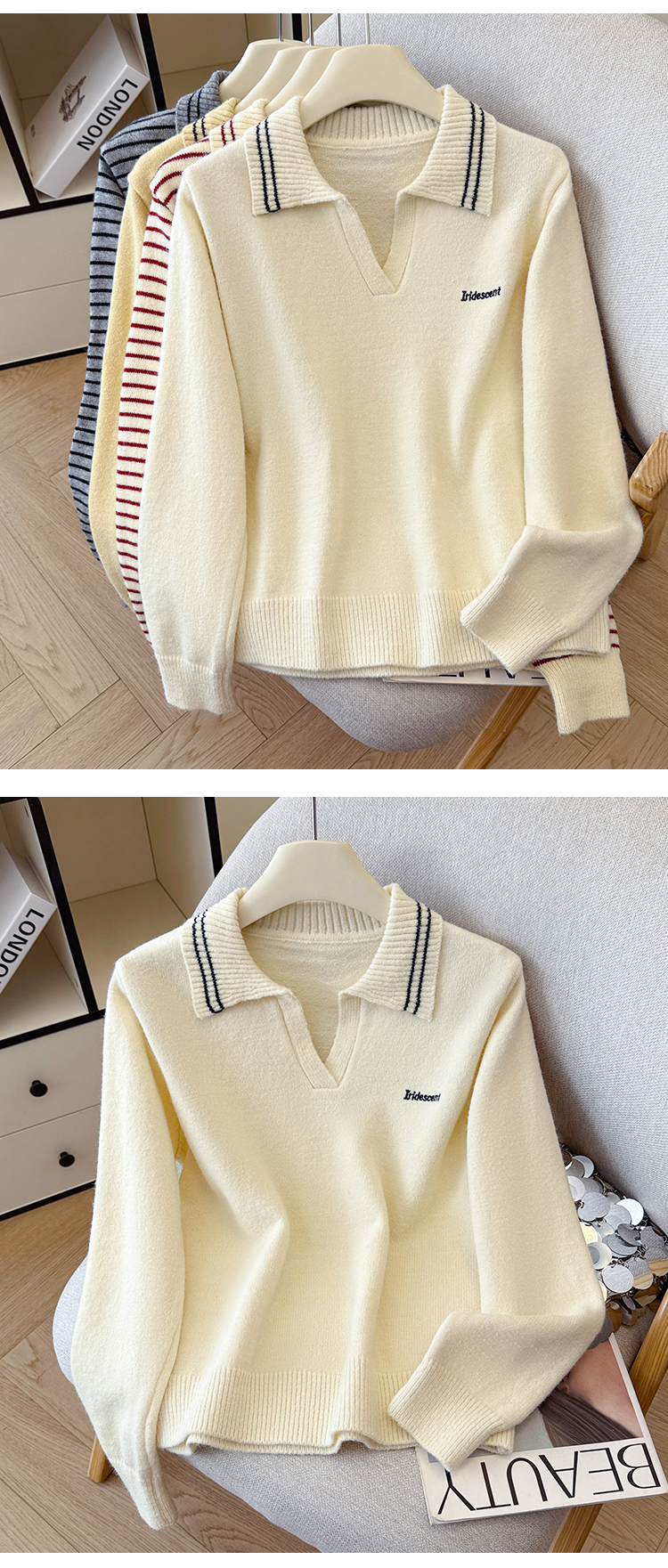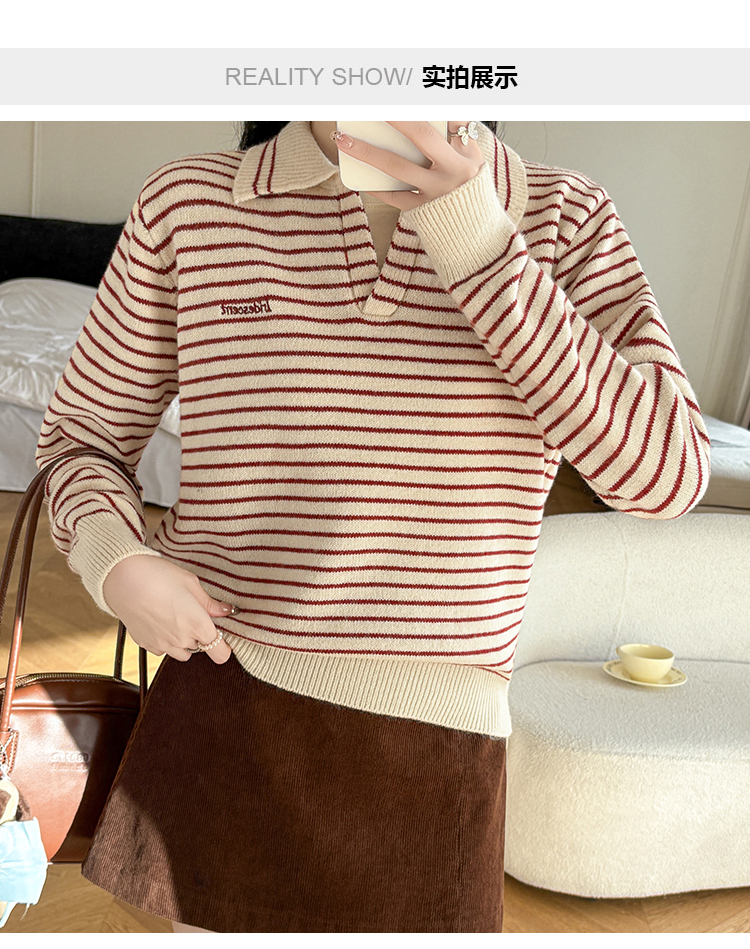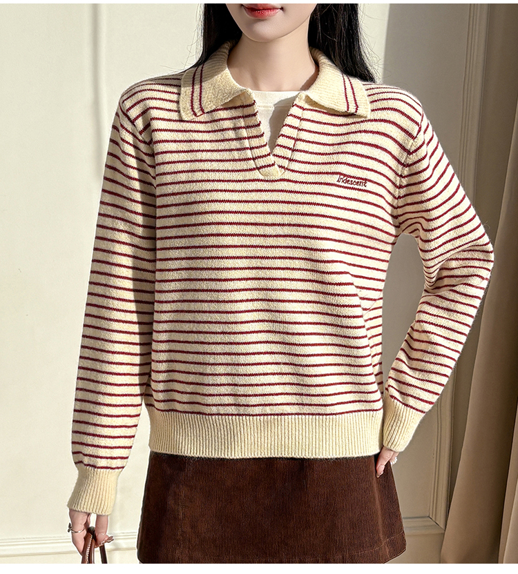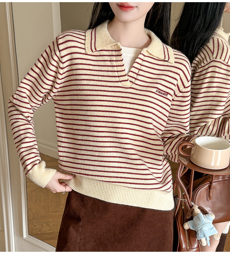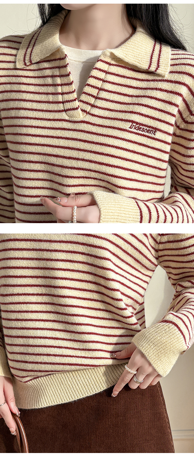 有货秋冬新款设计感刺绣polo半开领学院风条纹毛衣套头针织衫女