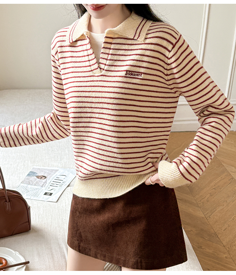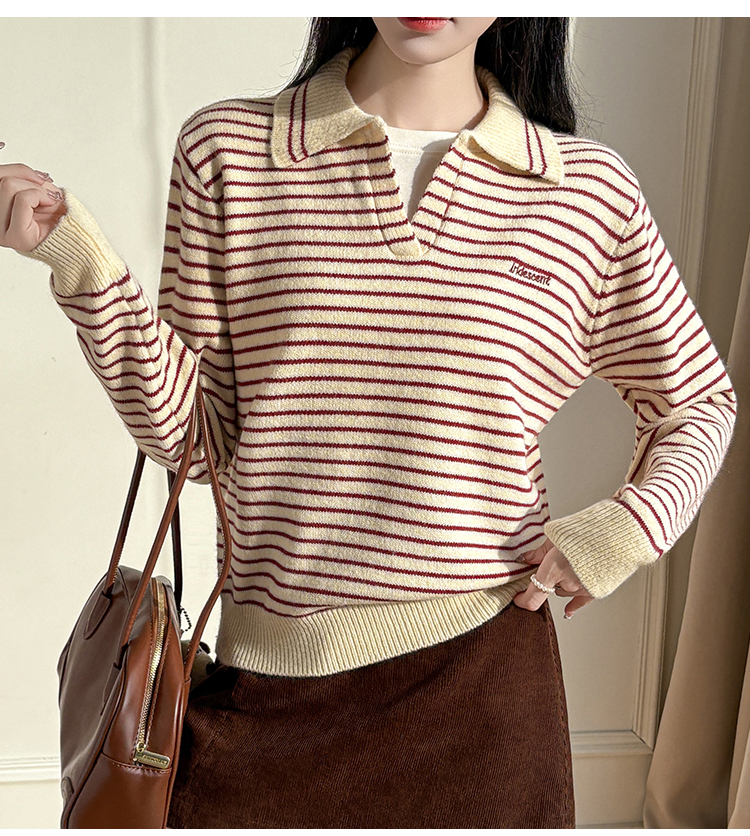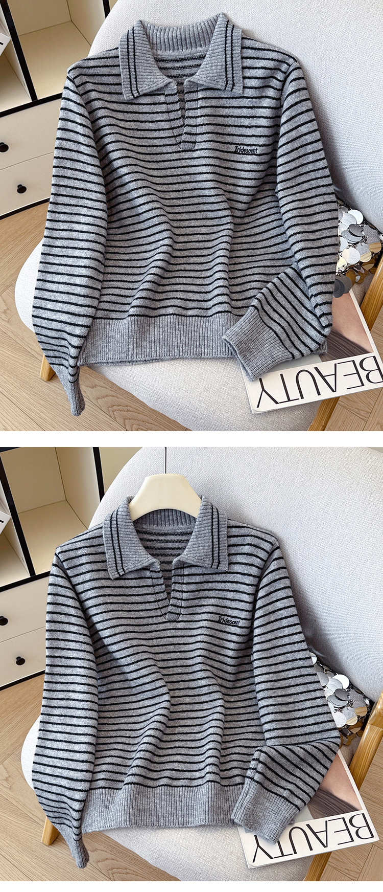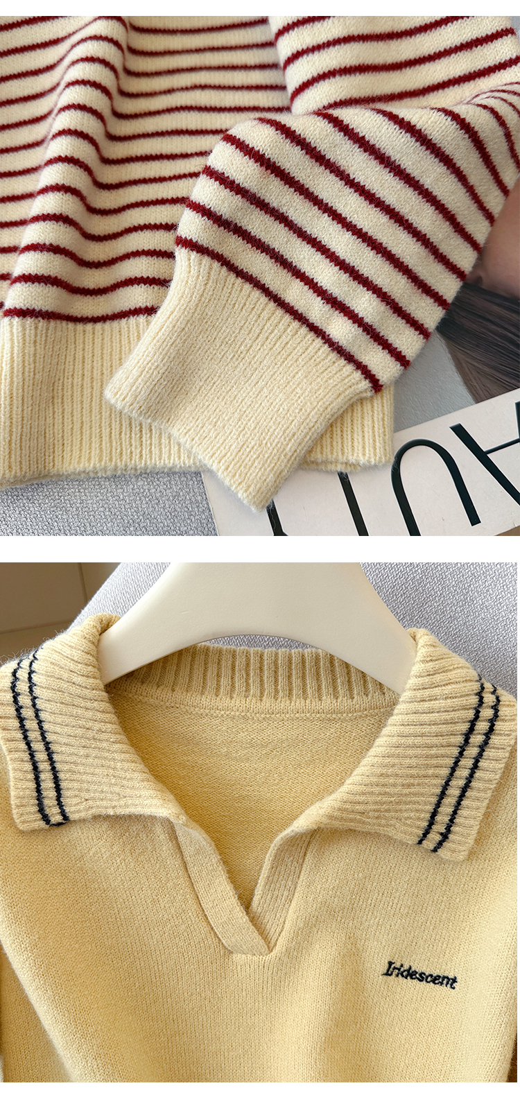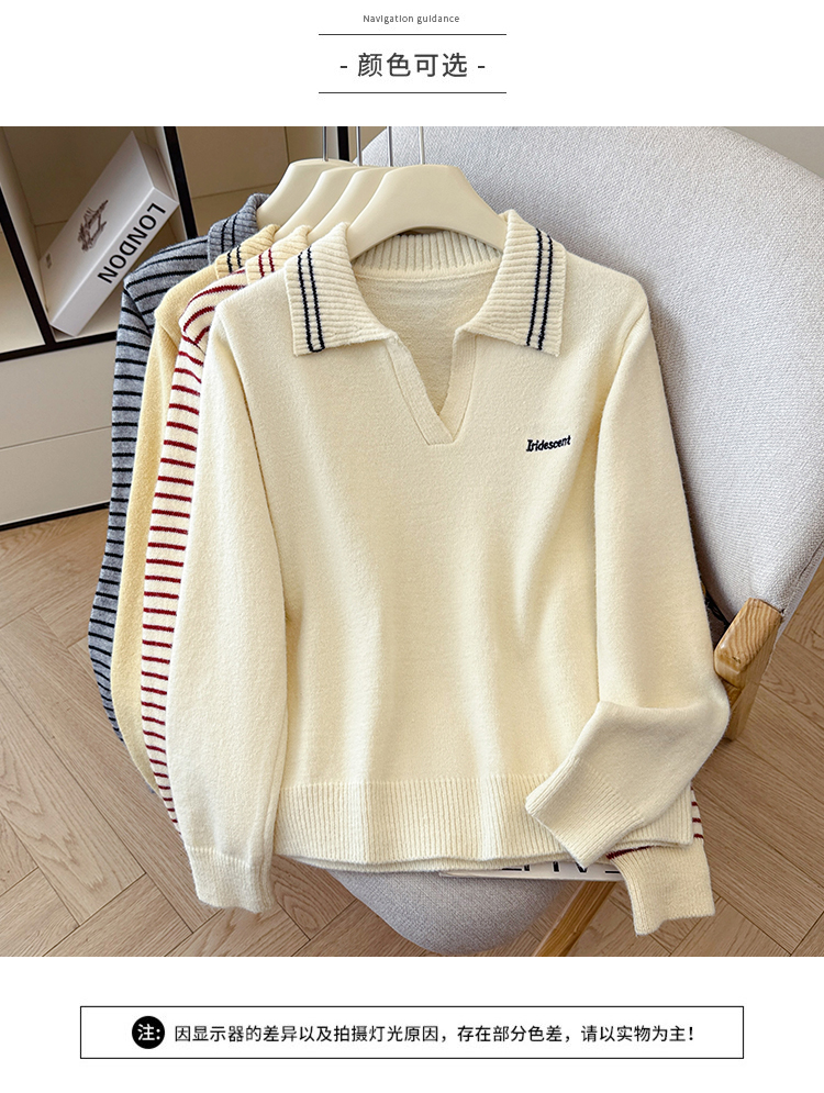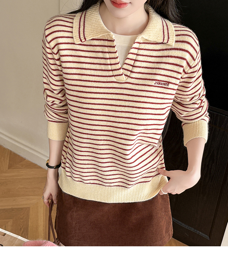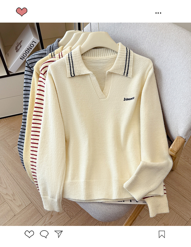 有货秋冬新款设计感刺绣polo半开领学院风条纹毛衣套头针织衫女