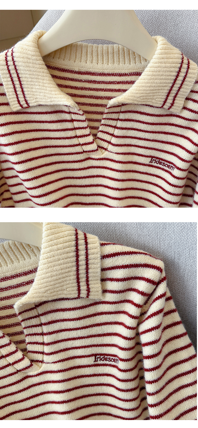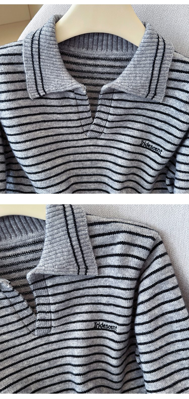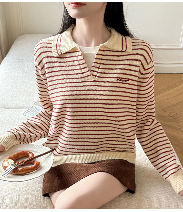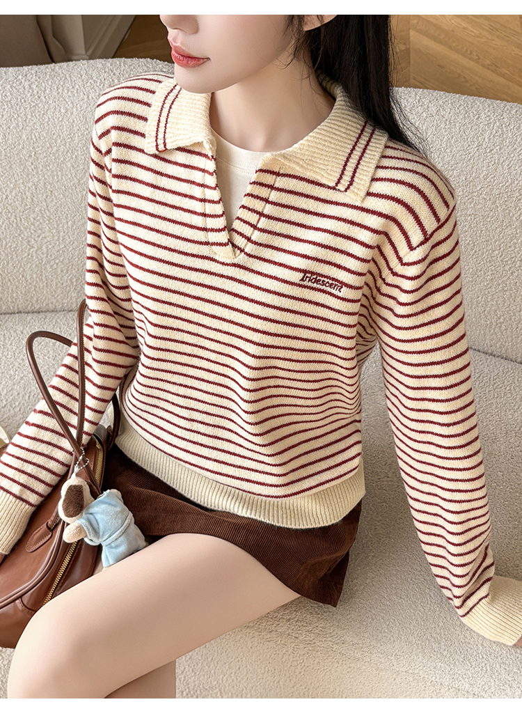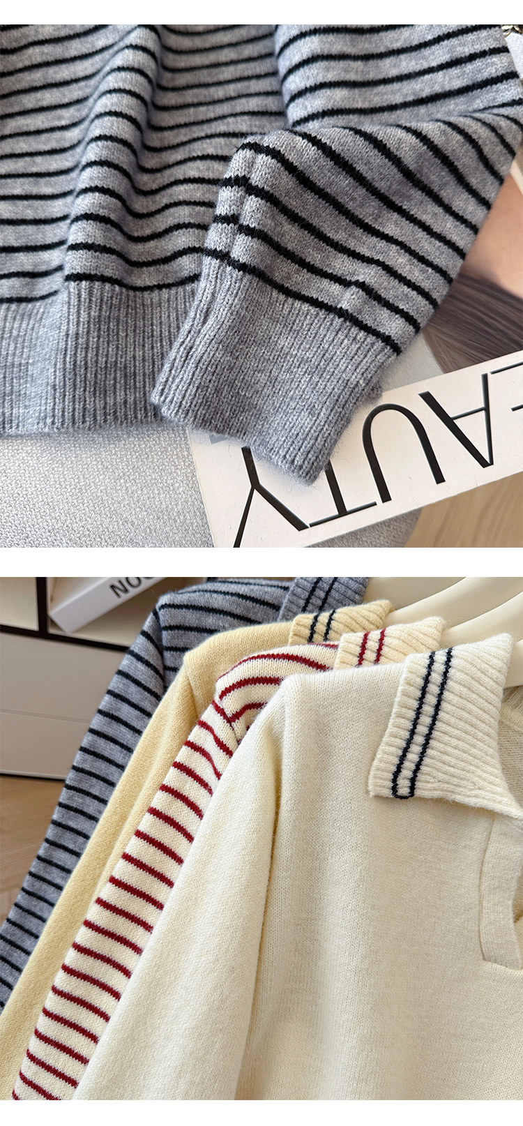 有货秋冬新款设计感刺绣polo半开领学院风条纹毛衣套头针织衫女