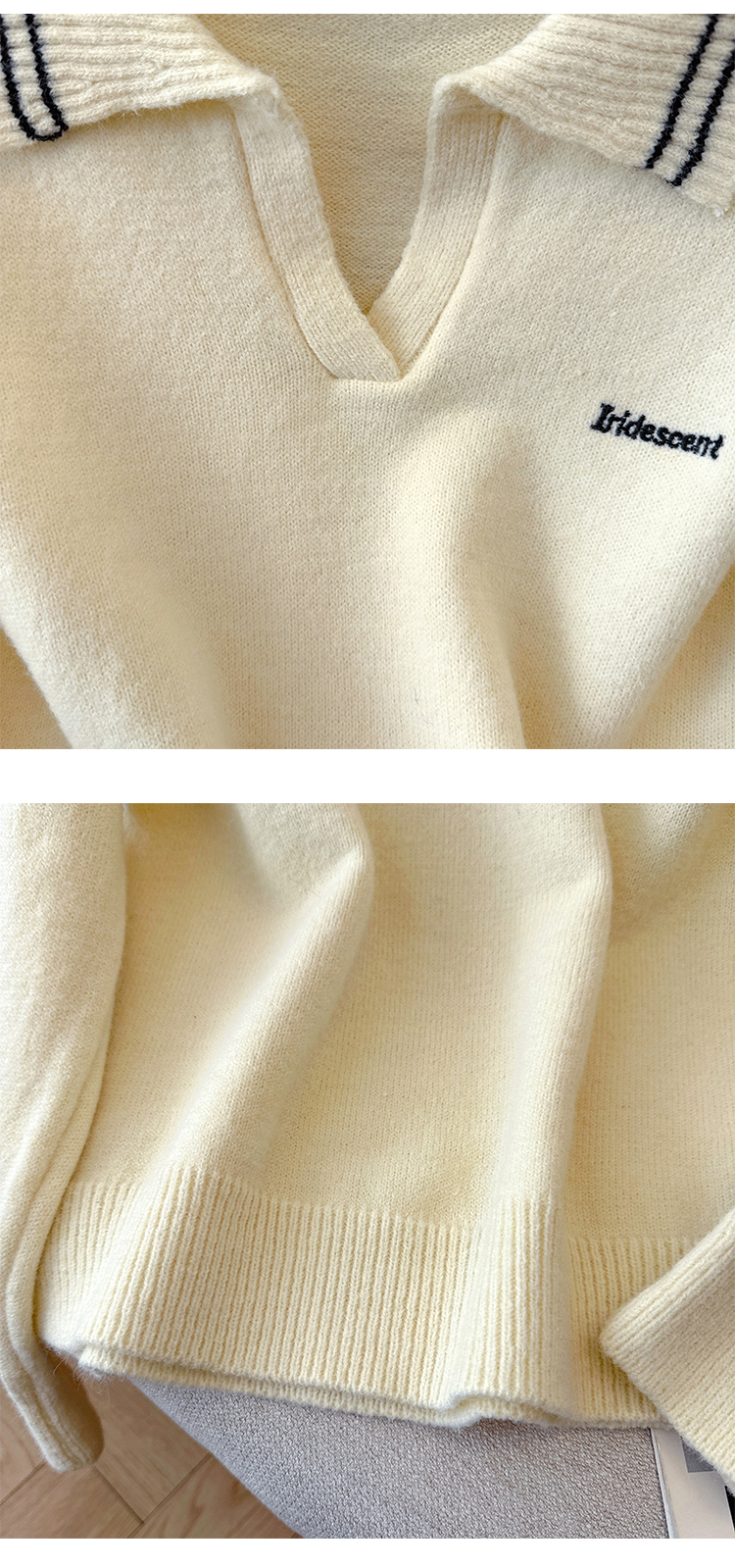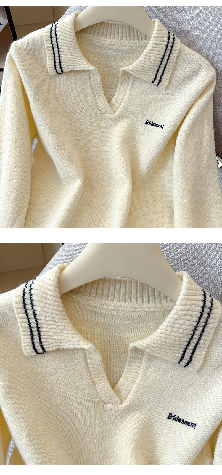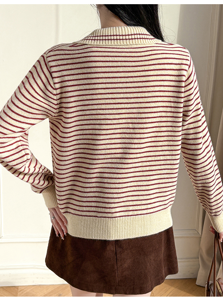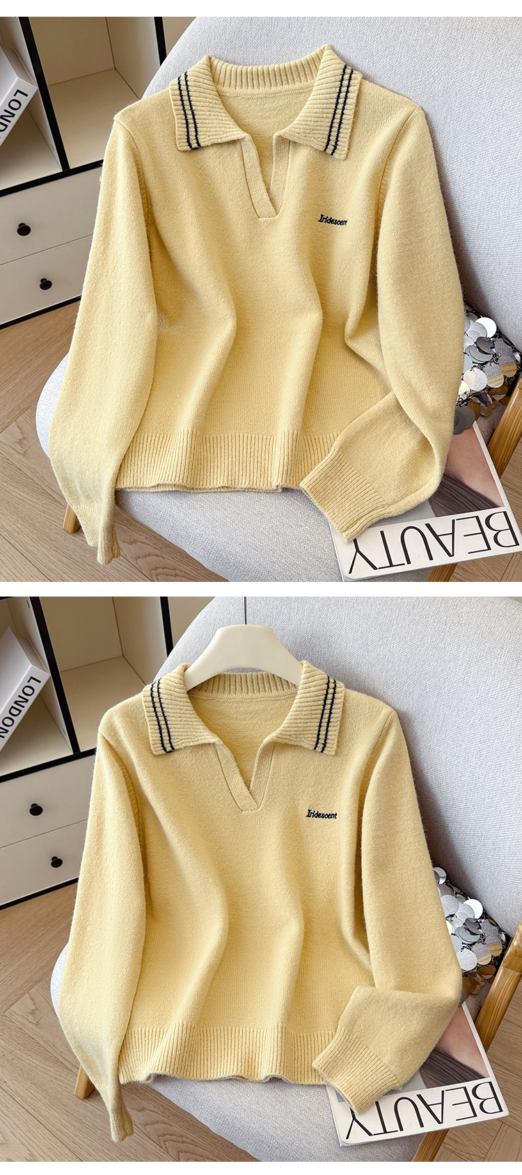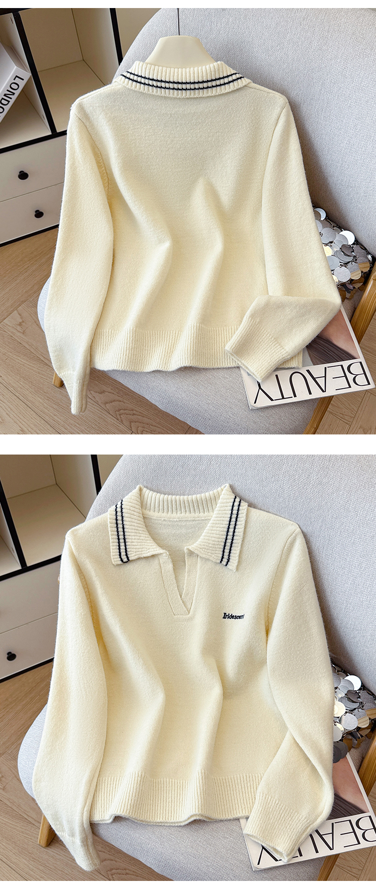 有货秋冬新款设计感刺绣polo半开领学院风条纹毛衣套头针织衫女