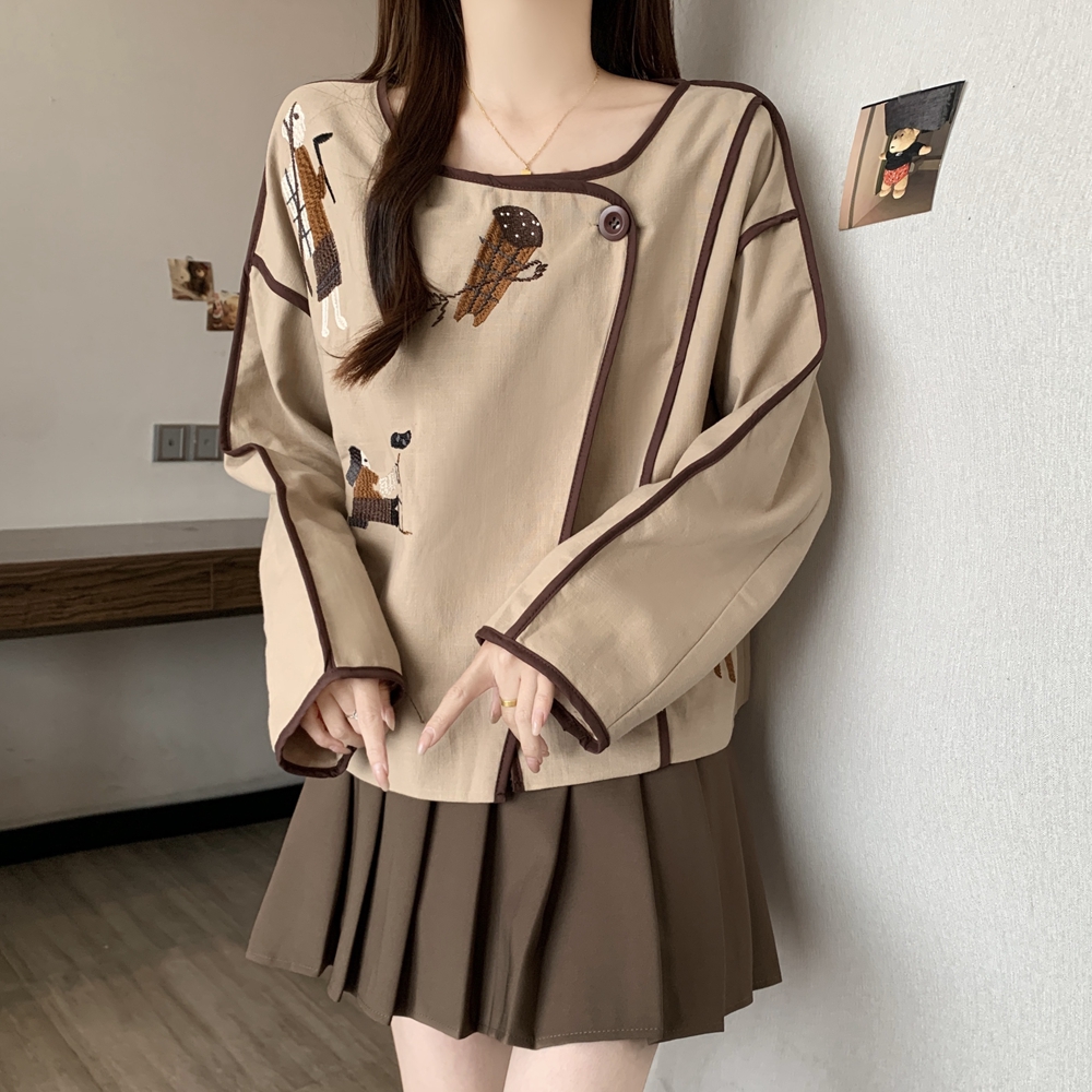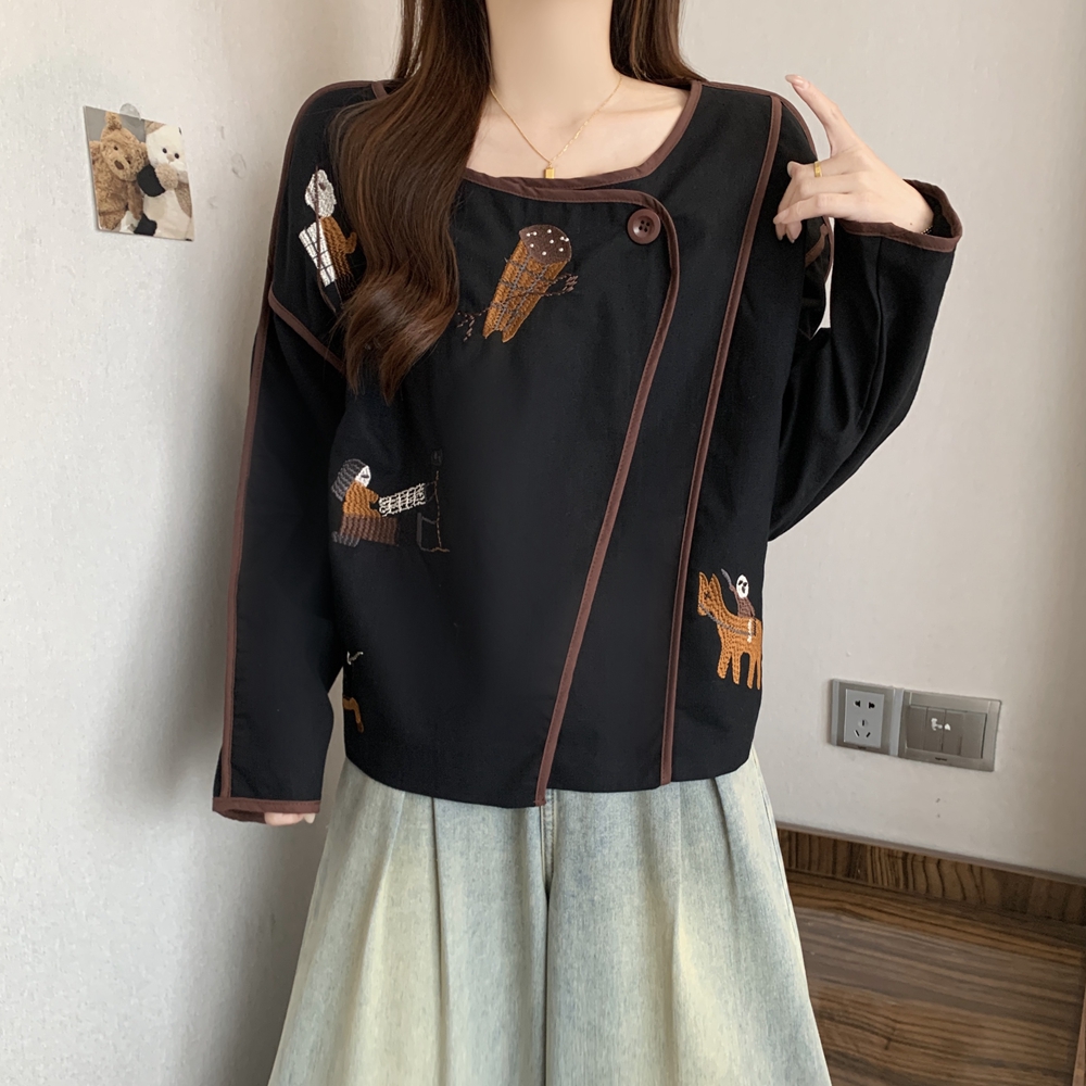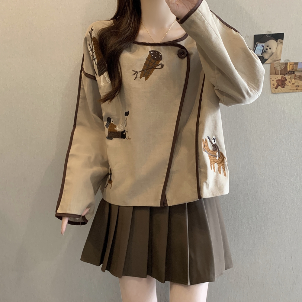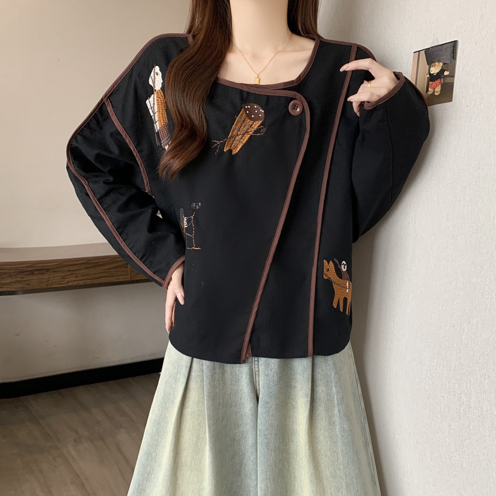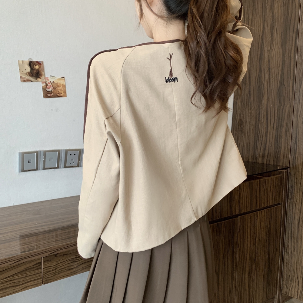 实拍秋装新款高端亚麻重工刺绣圆领短款外套宽松休闲夹克上衣