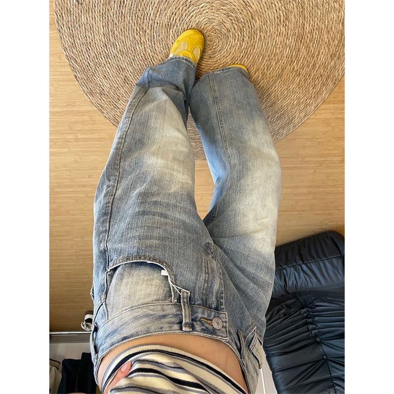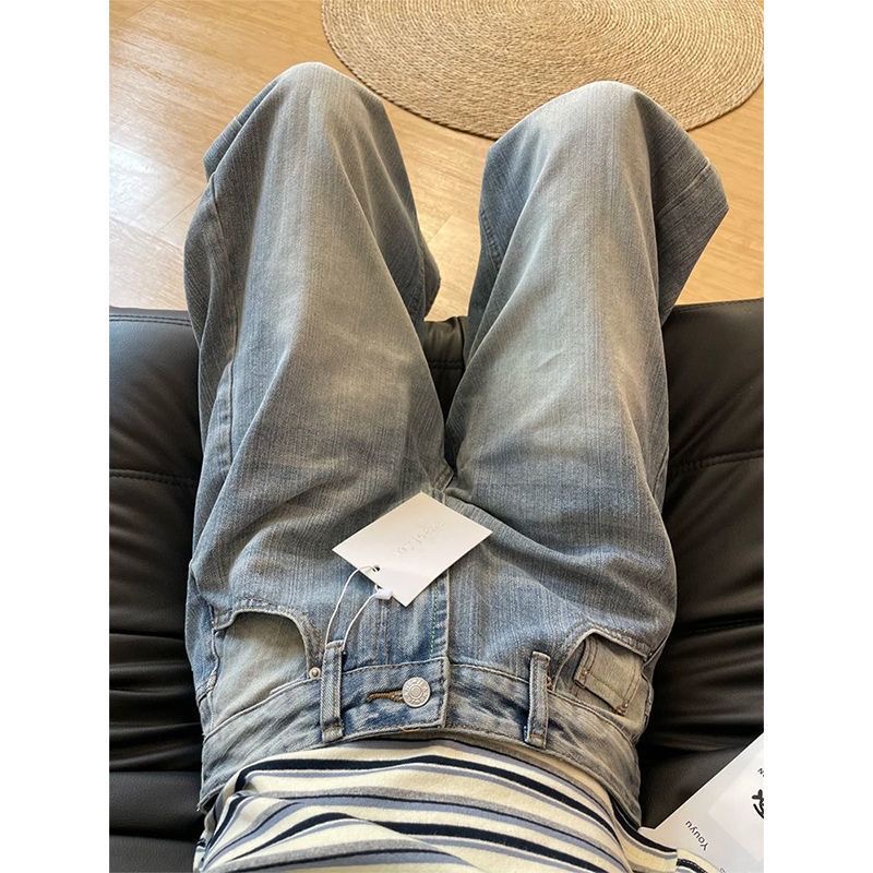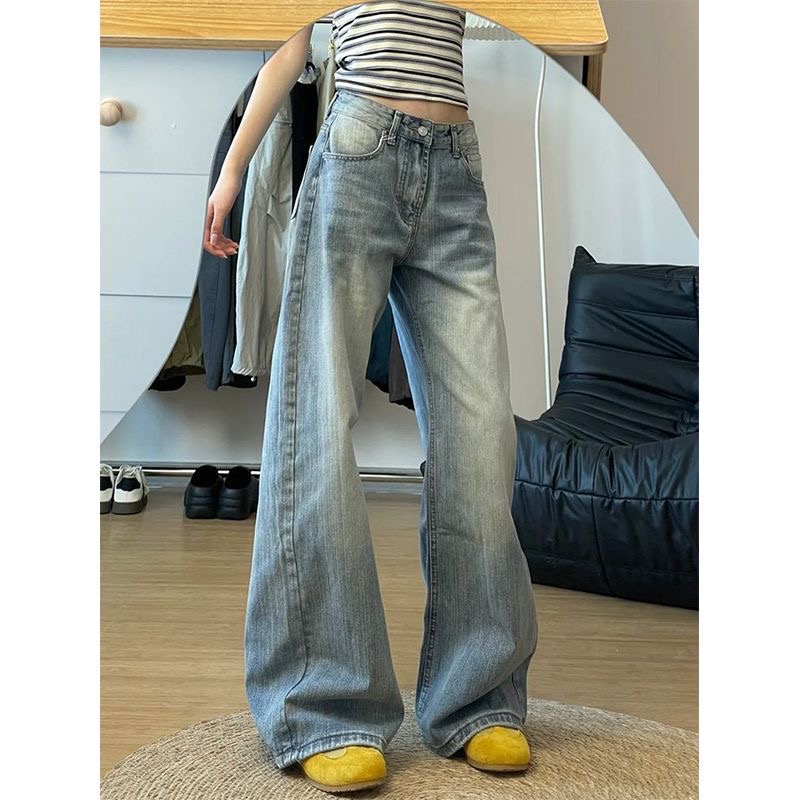 美式复古宽松水洗竹节纹弯刀牛仔裤女2025秋季新款直筒阔腿长裤子