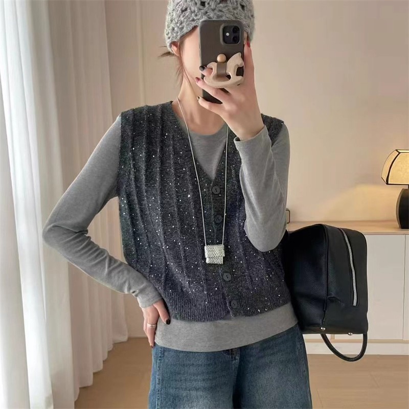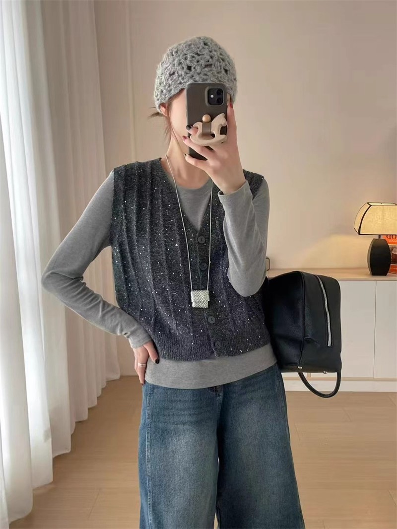 纯色V领亮片针织马甲背心1867