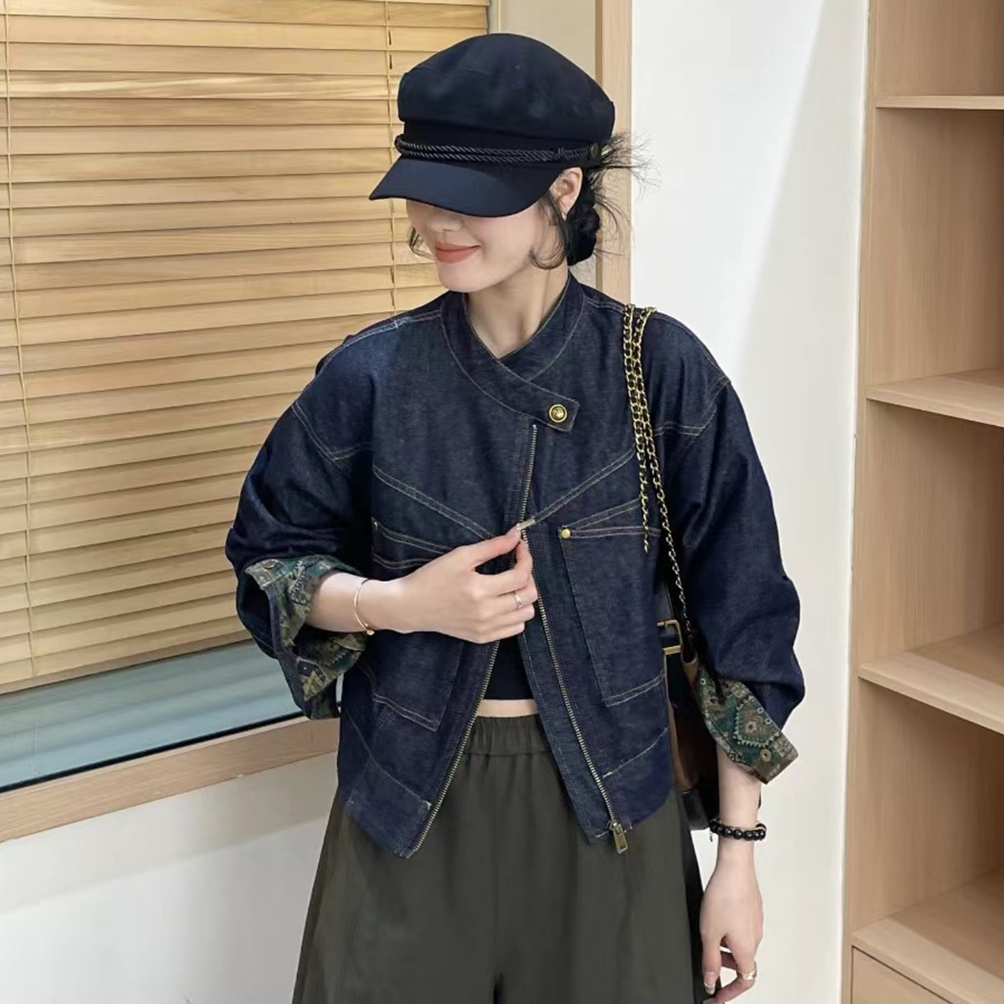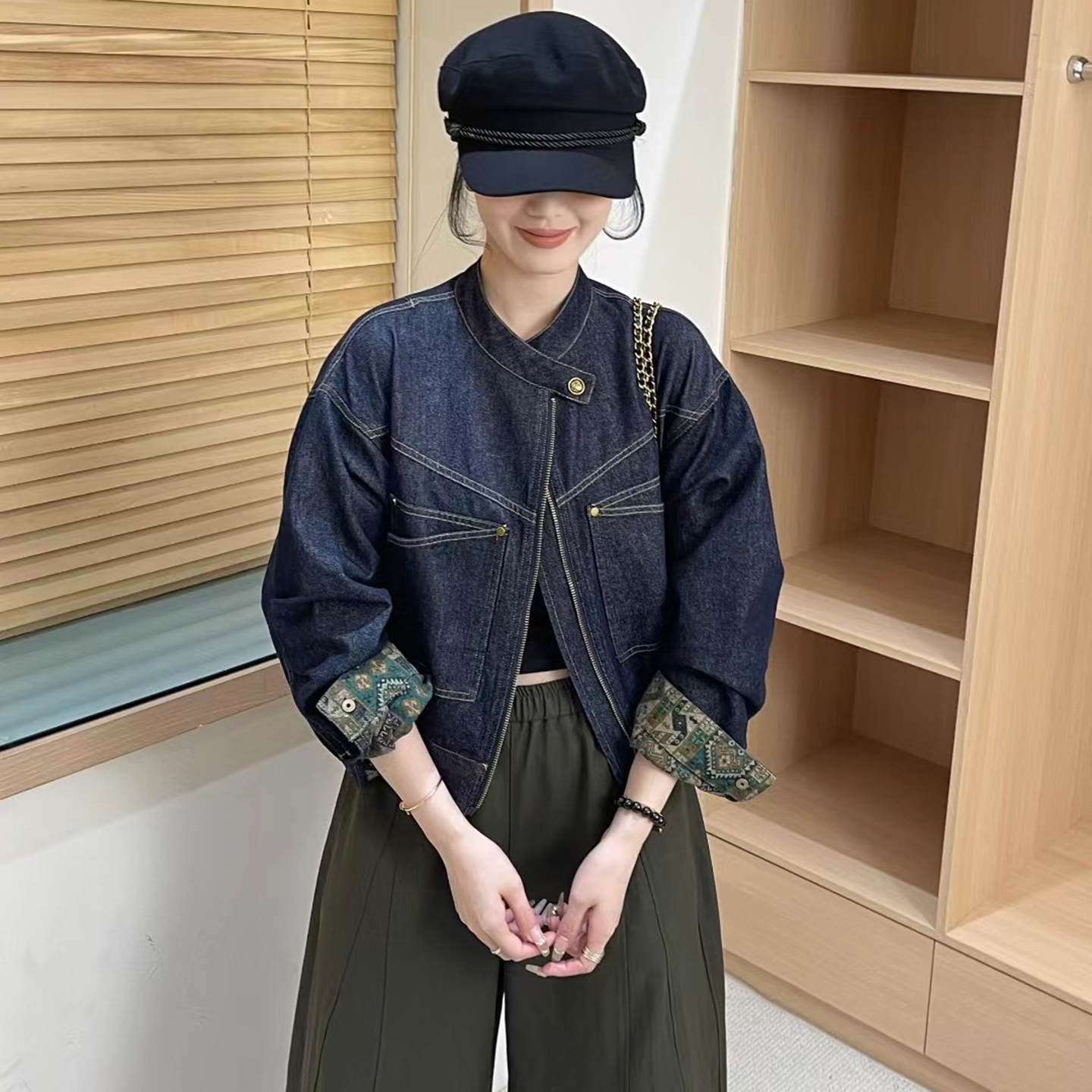 复古立领拉链牛仔短外套女2025秋季新款宽松减龄百搭休闲夹克上衣