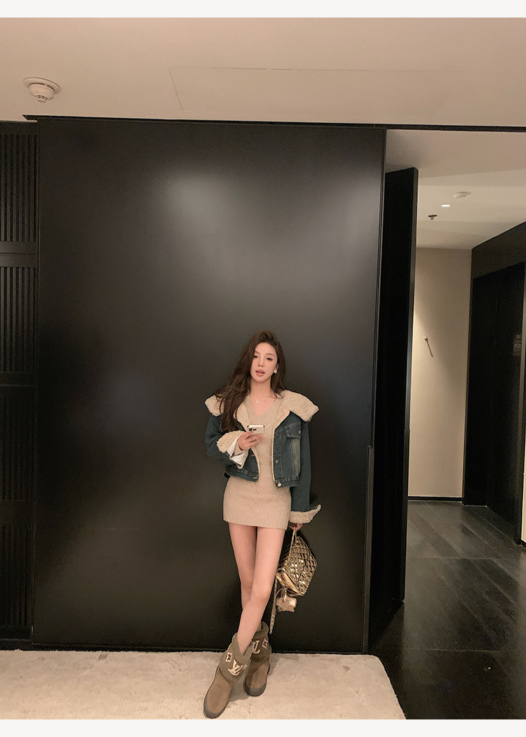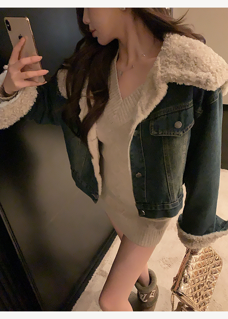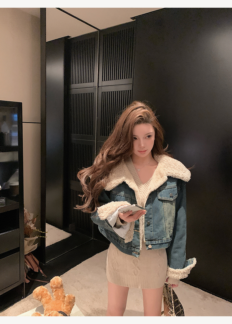 邱肉瑶 翻领羊羔毛加绒牛仔外套女冬季加厚短外套