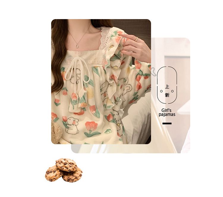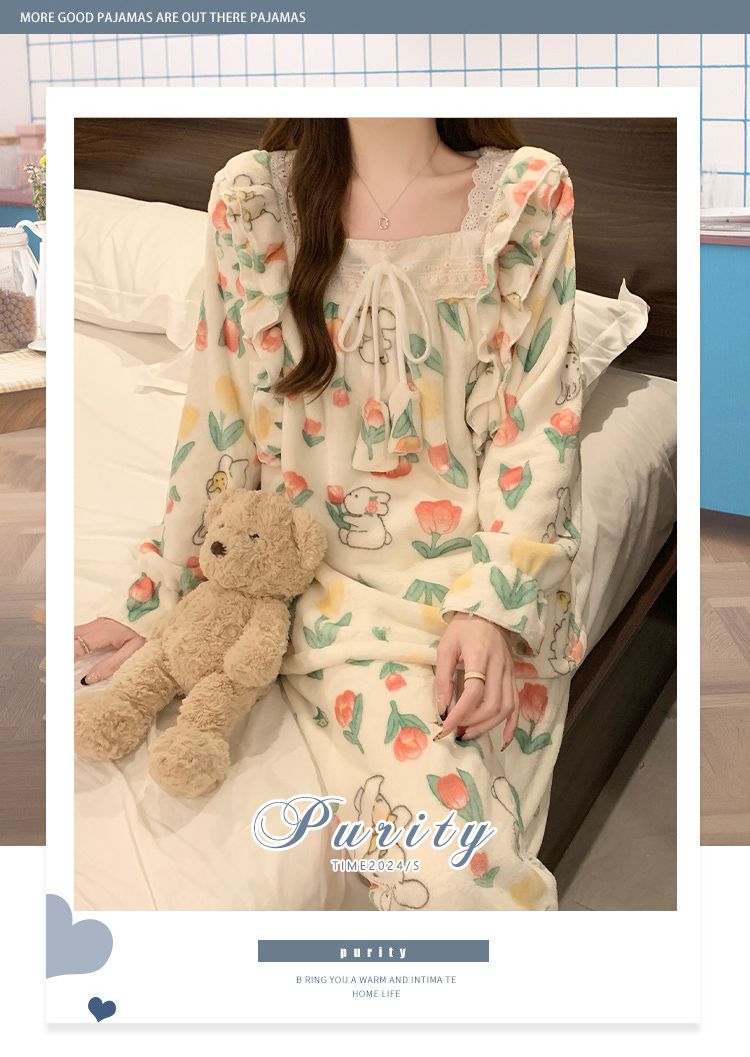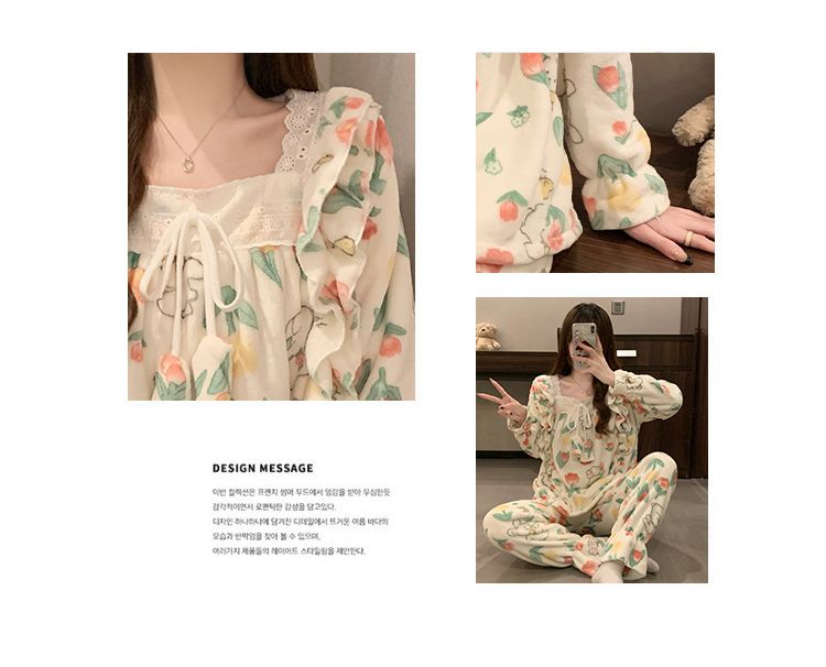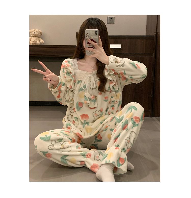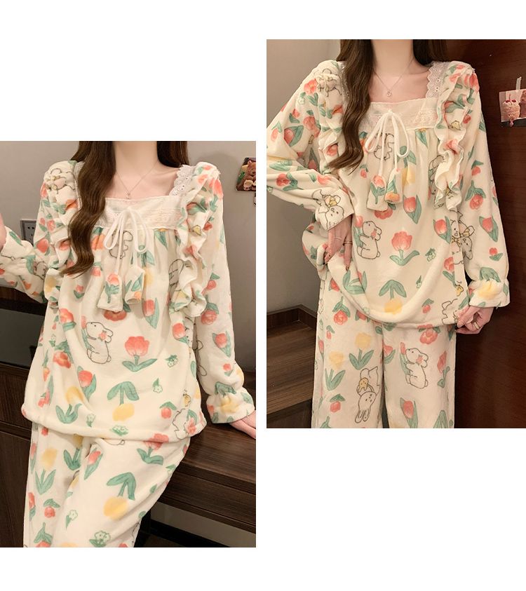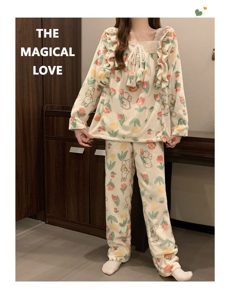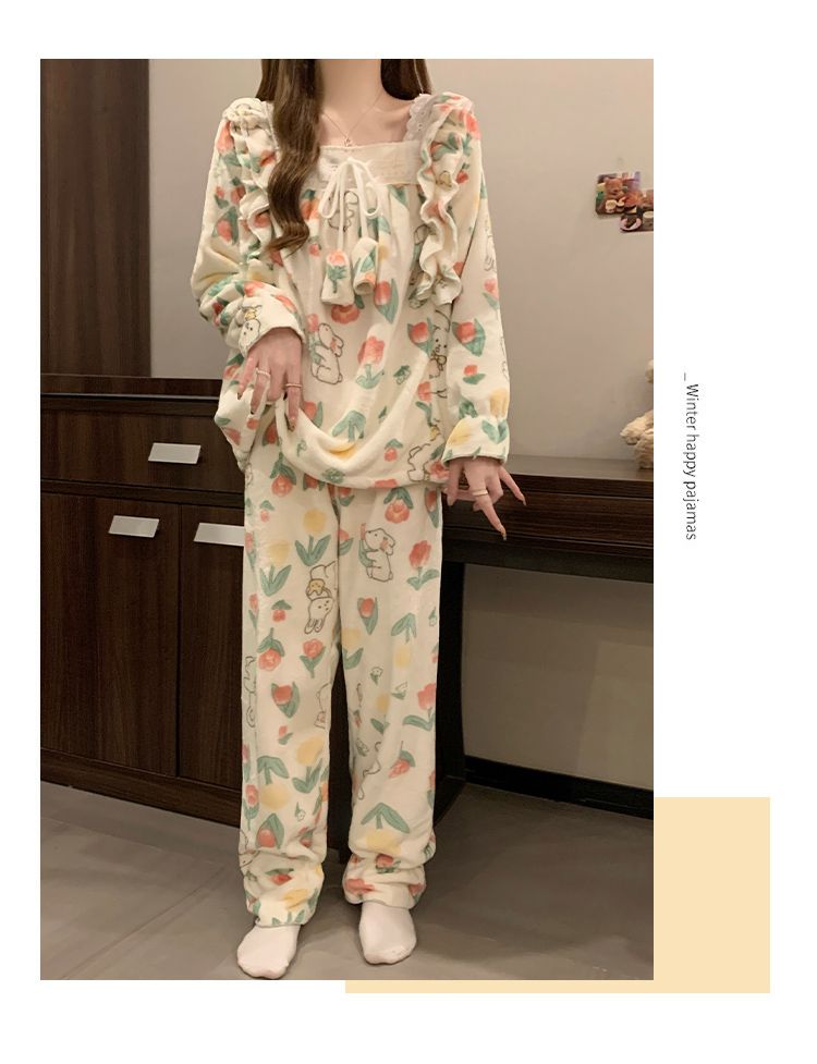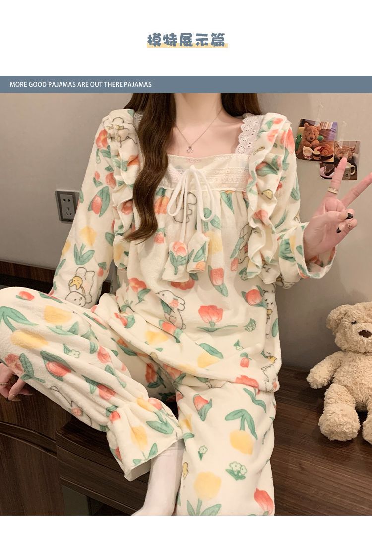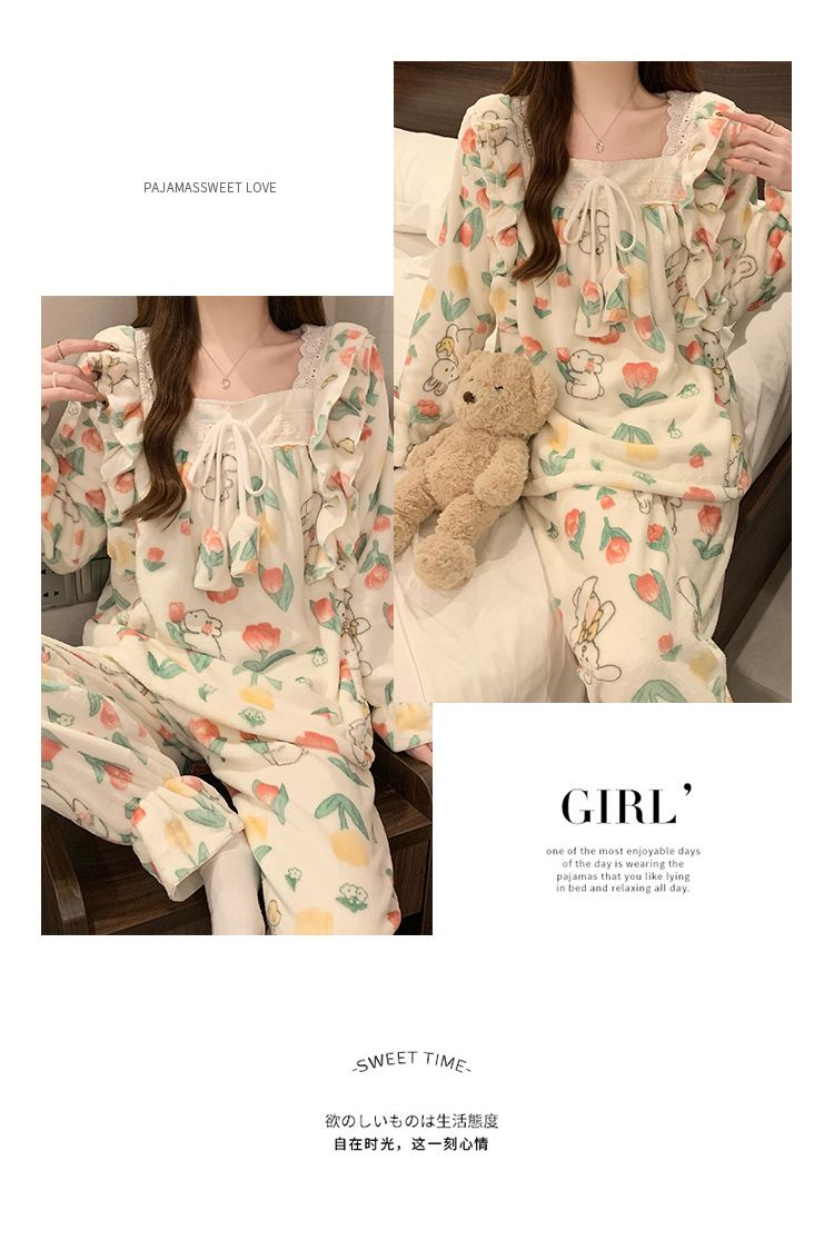 5花型冬季新款法兰绒睡衣女加厚甜美公主风可爱家居服套装