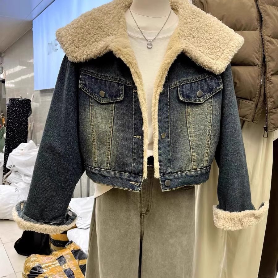 羊羔毛大翻领牛仔棉衣外套女小个子冬季保暖高腰短款加绒夹克棉服