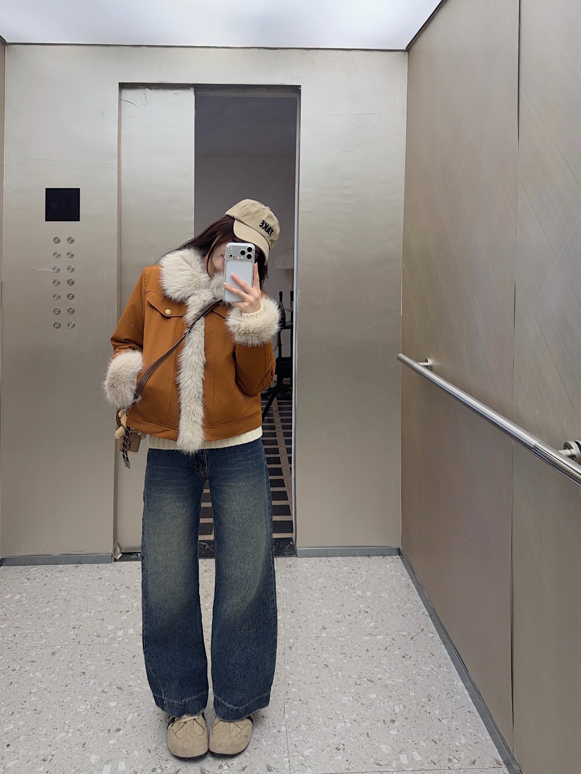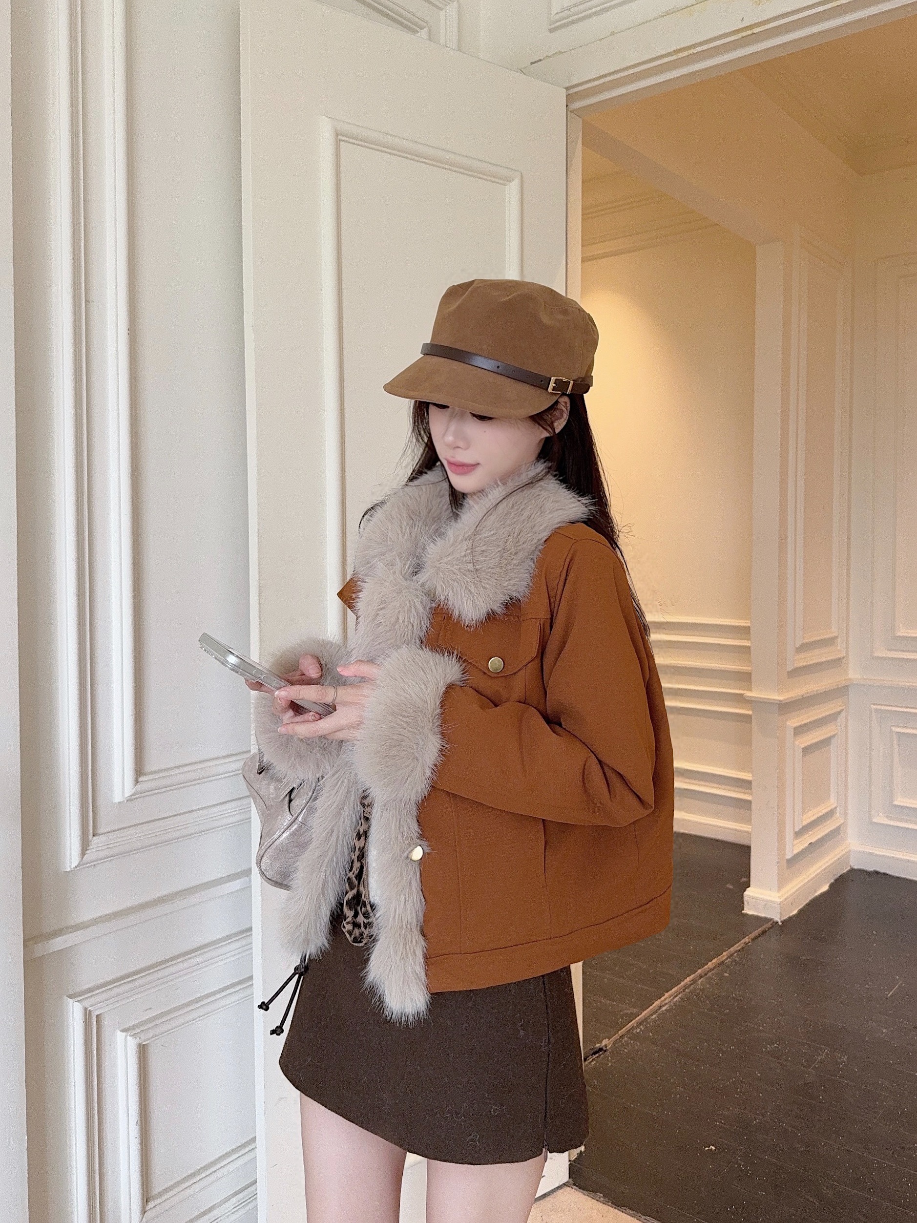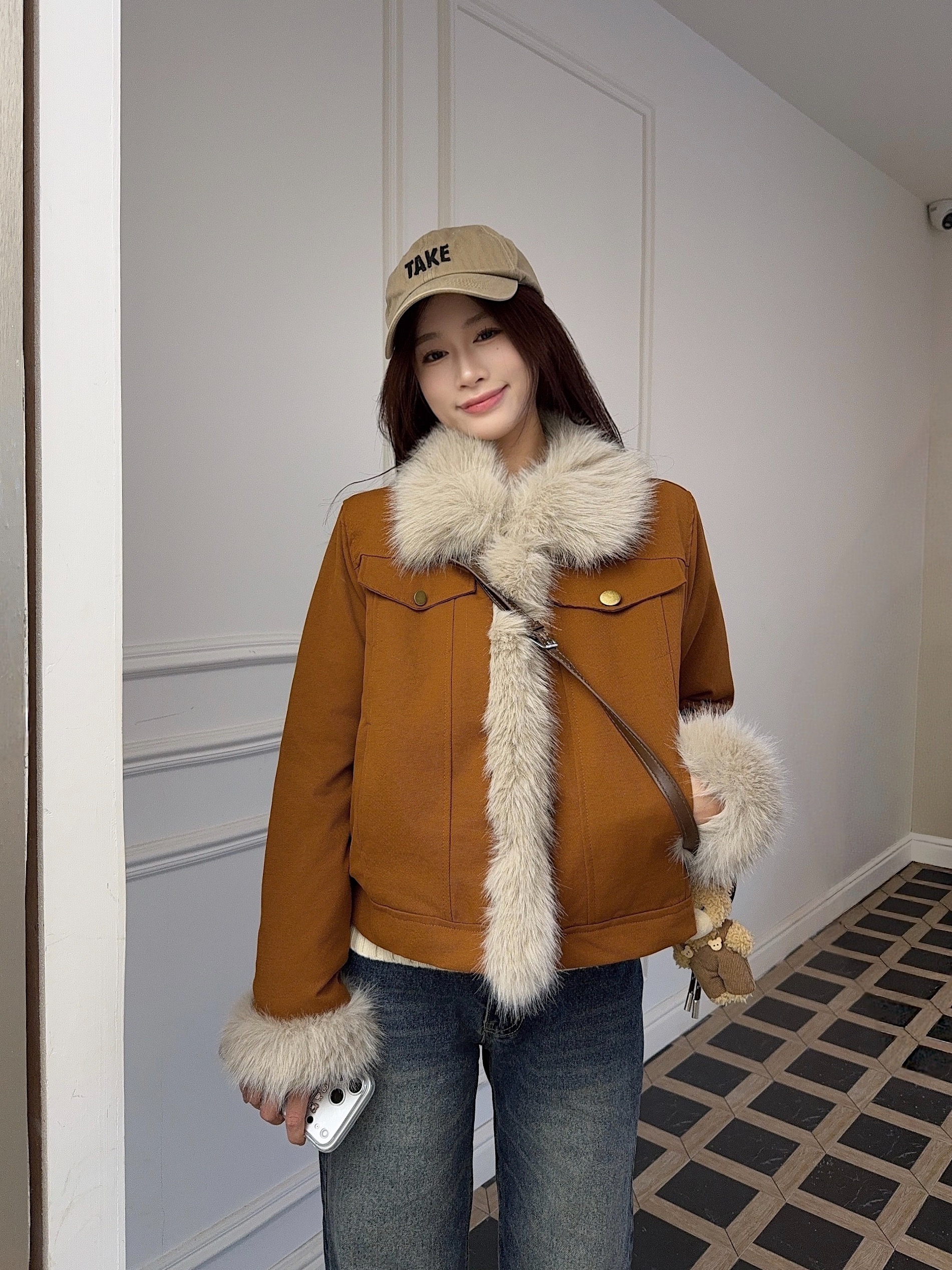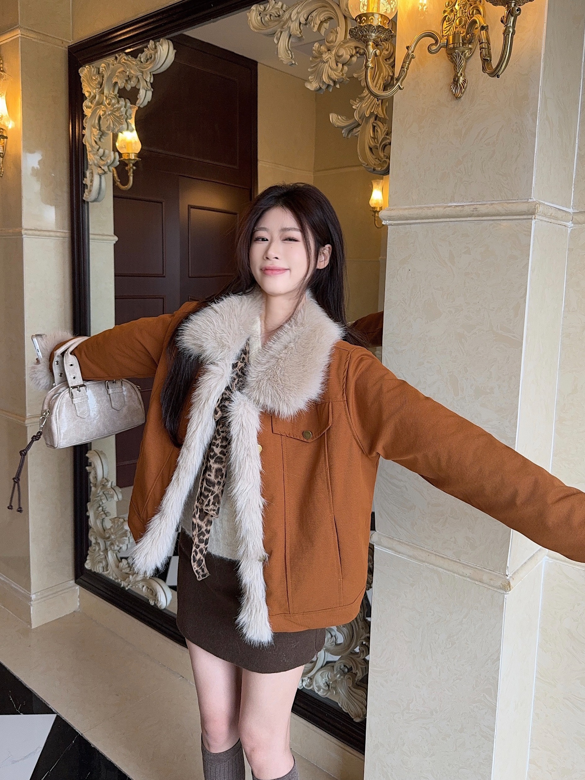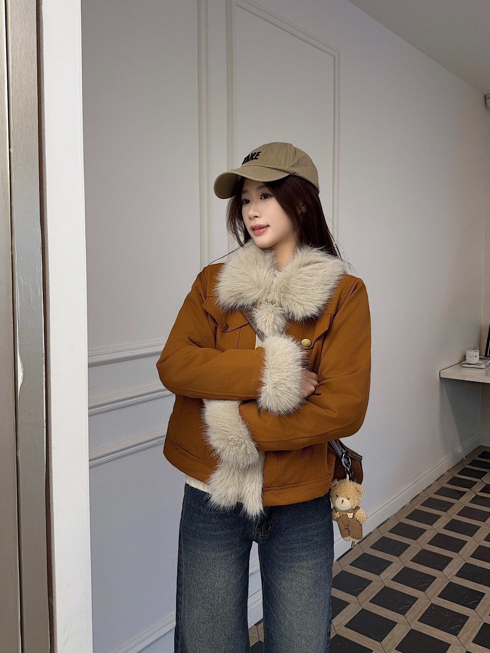 实拍 美拉德复古棕色牛仔外套女秋冬加厚短款拼接毛毛上衣棉服