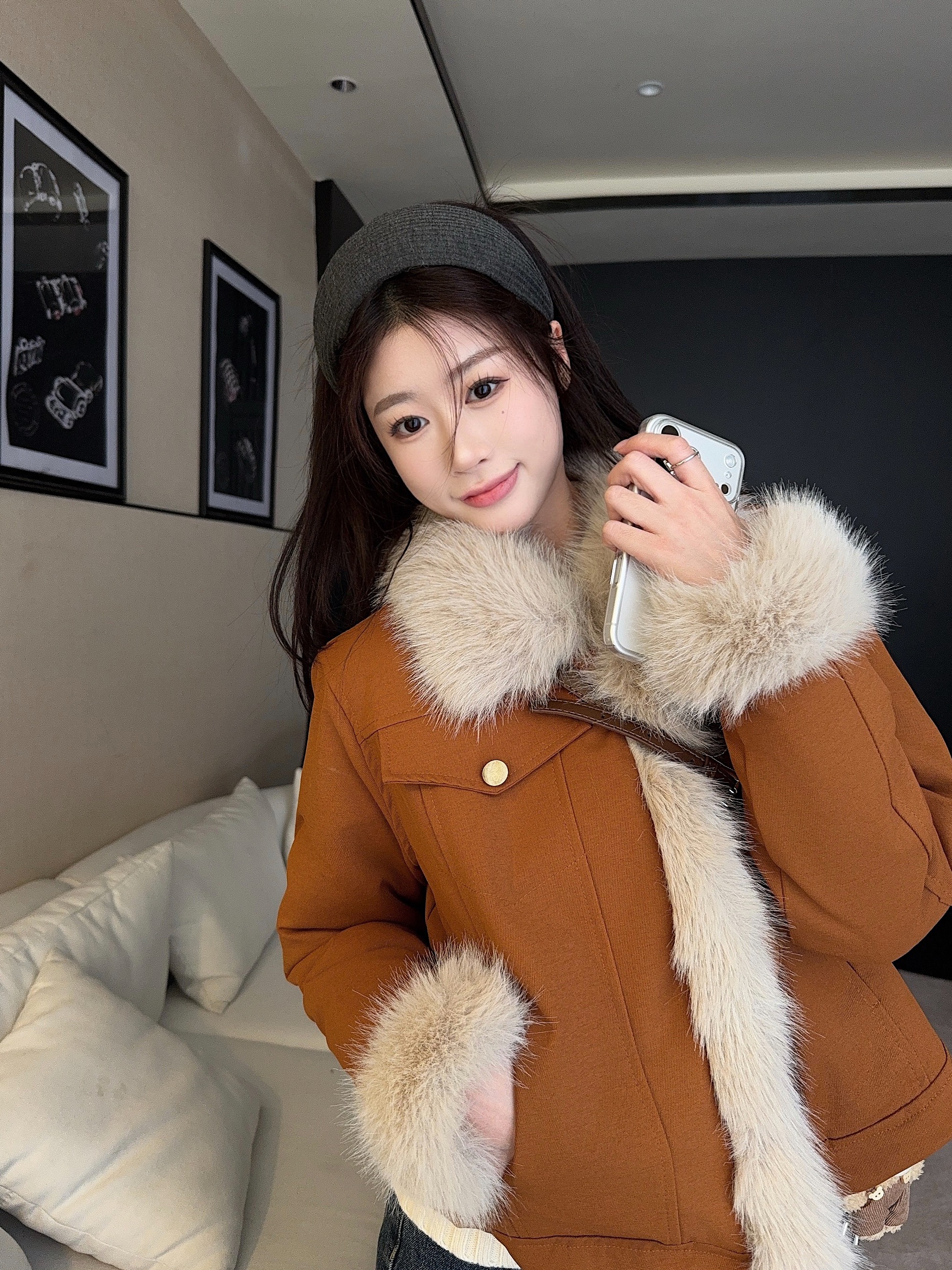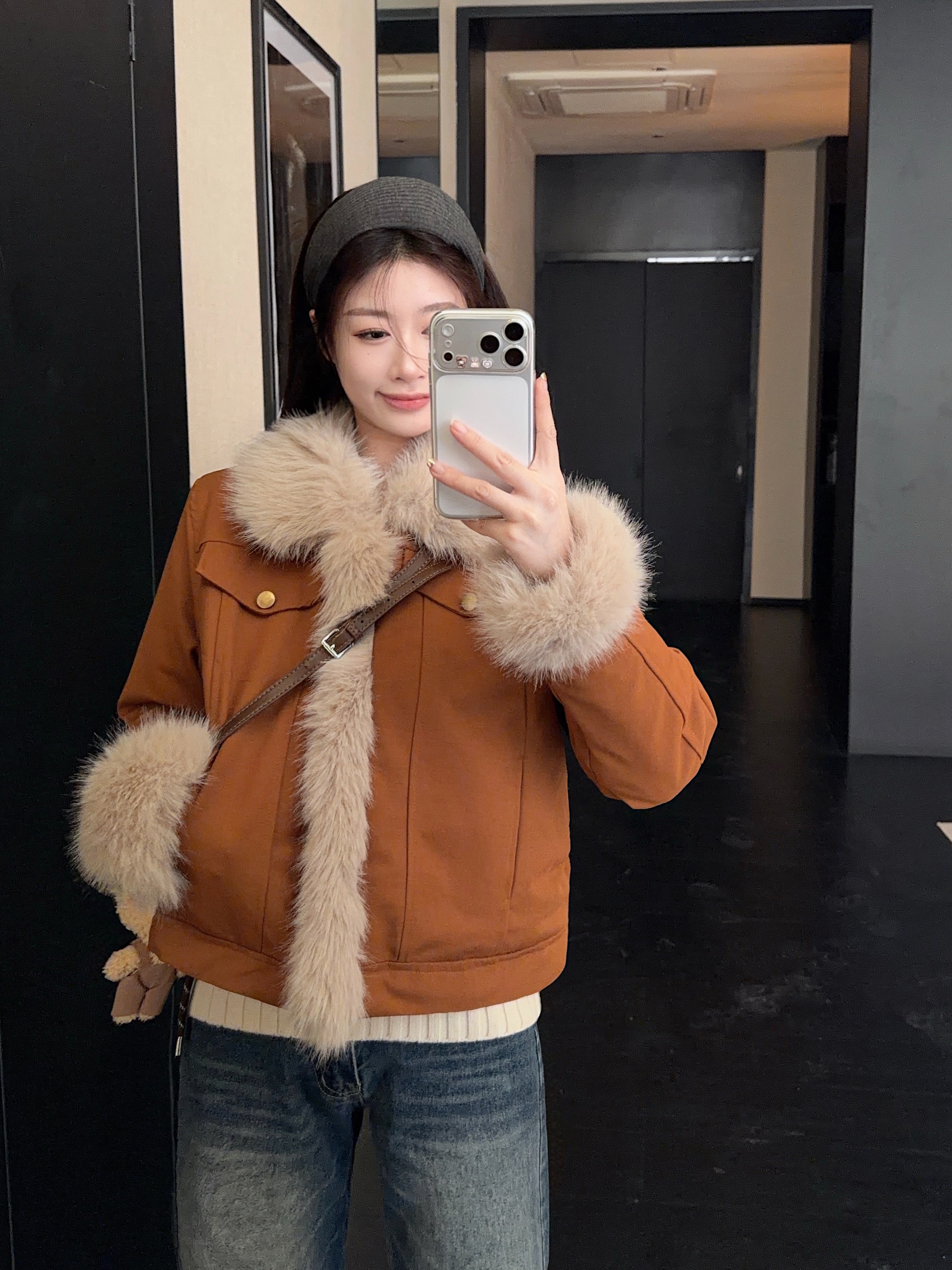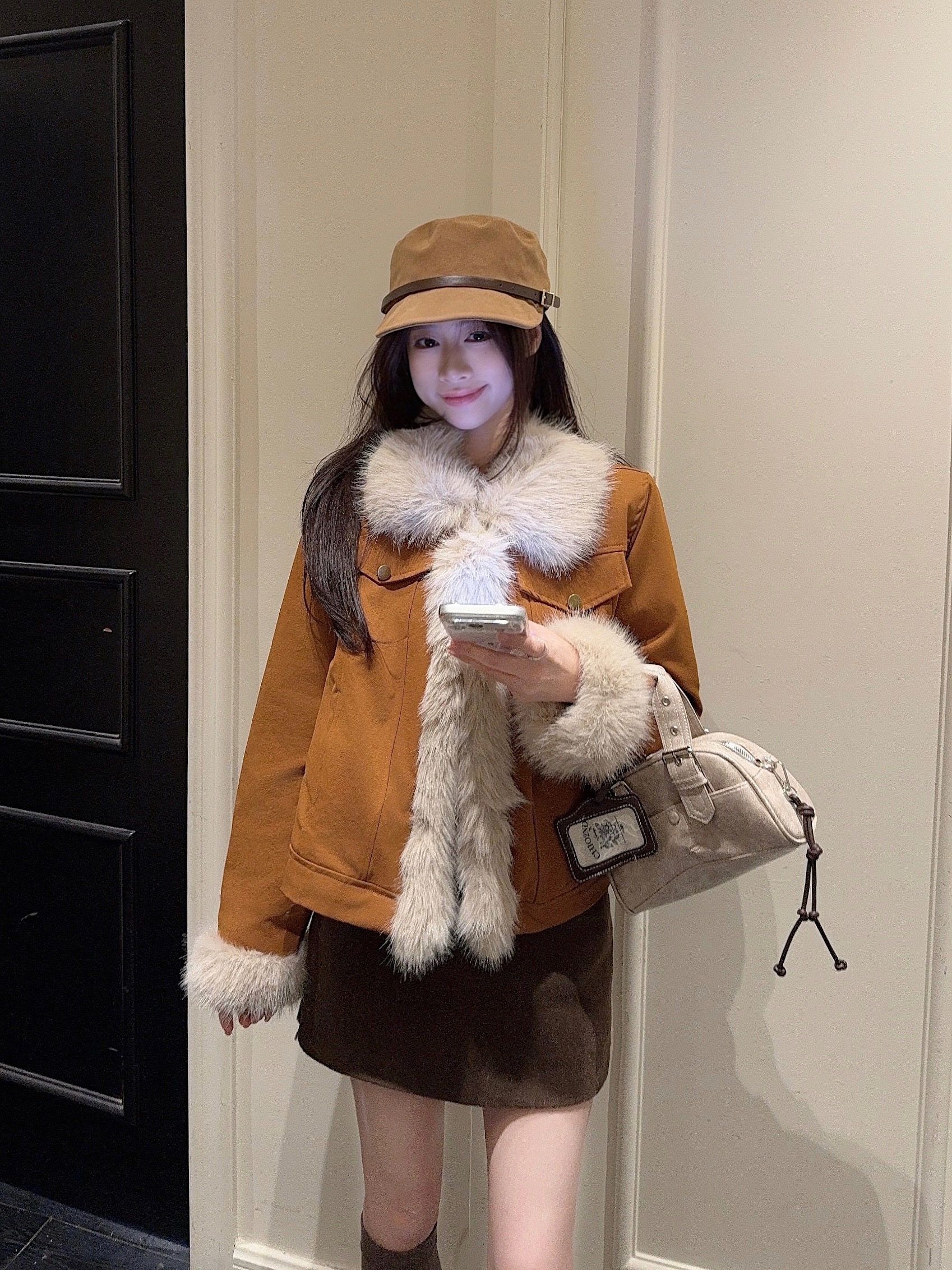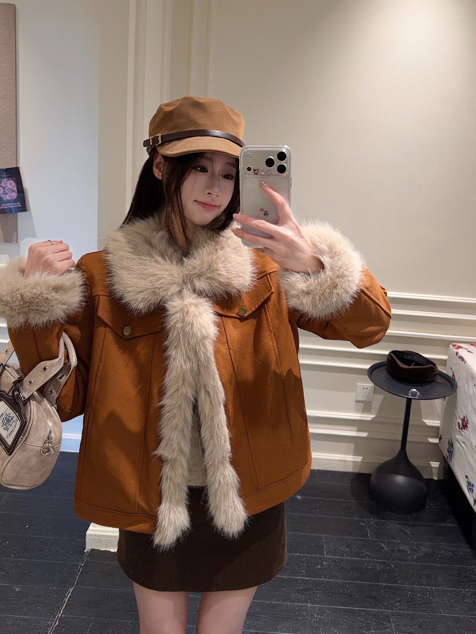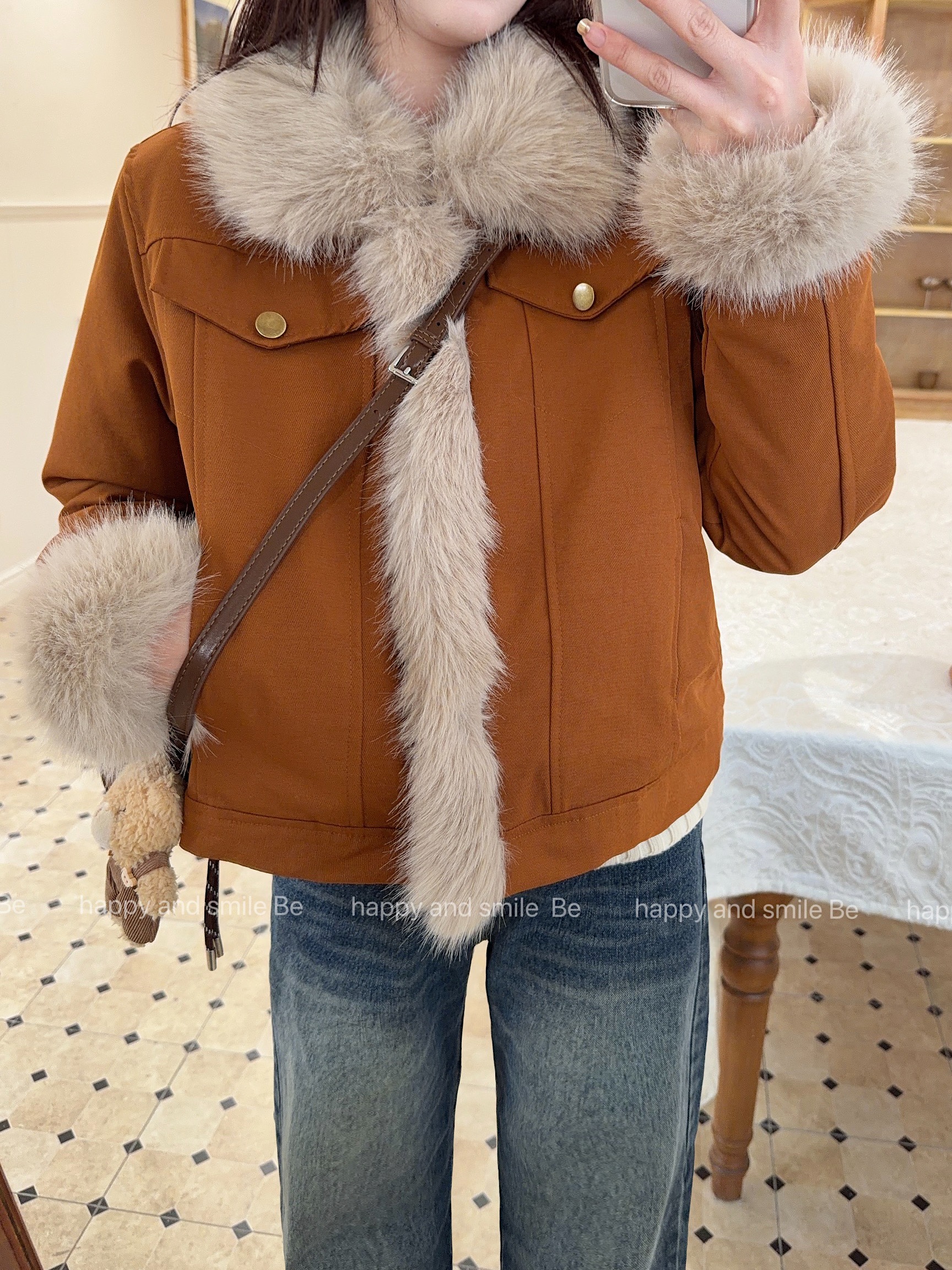 实拍 美拉德复古棕色牛仔外套女秋冬加厚短款拼接毛毛上衣棉服
