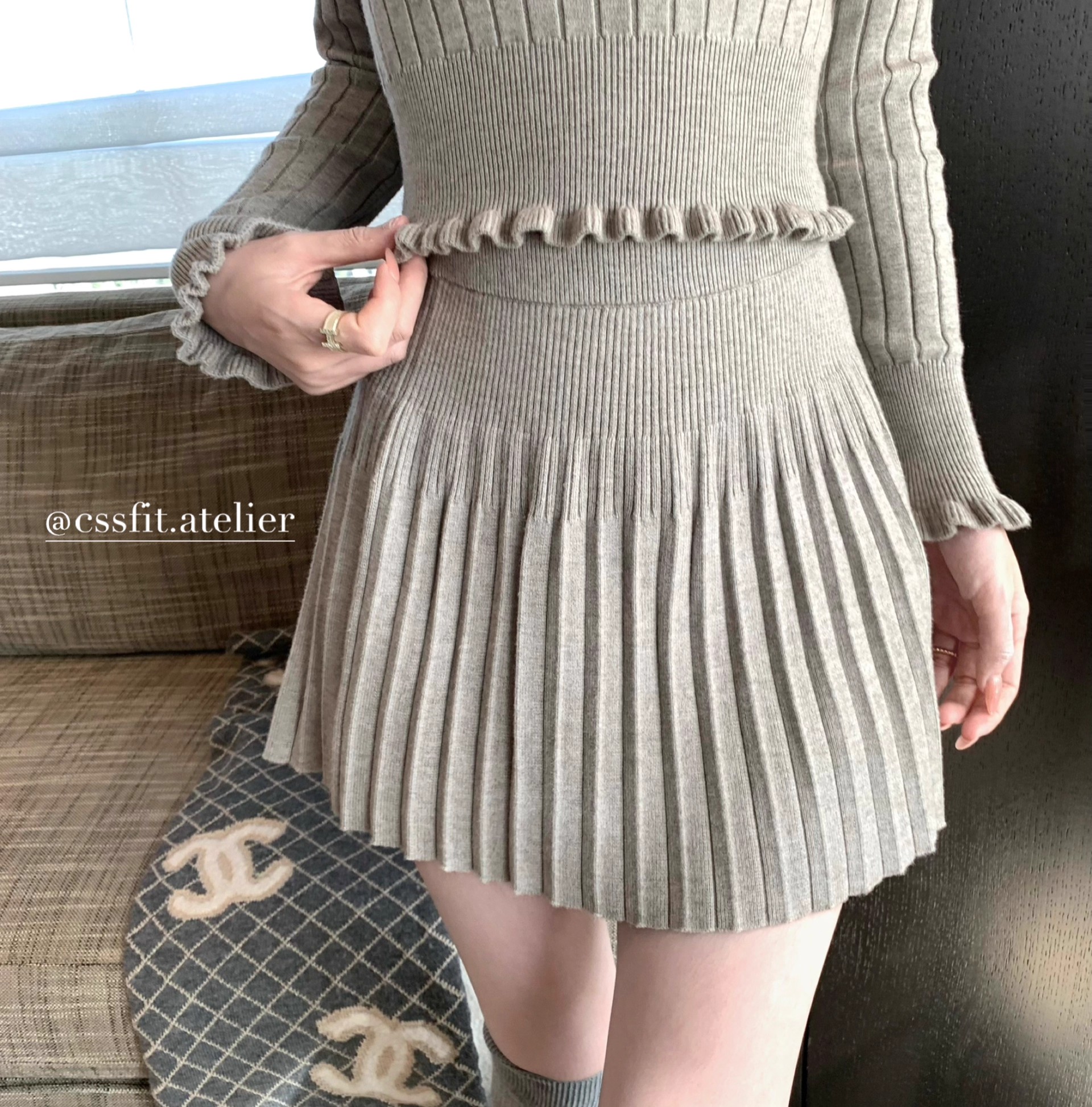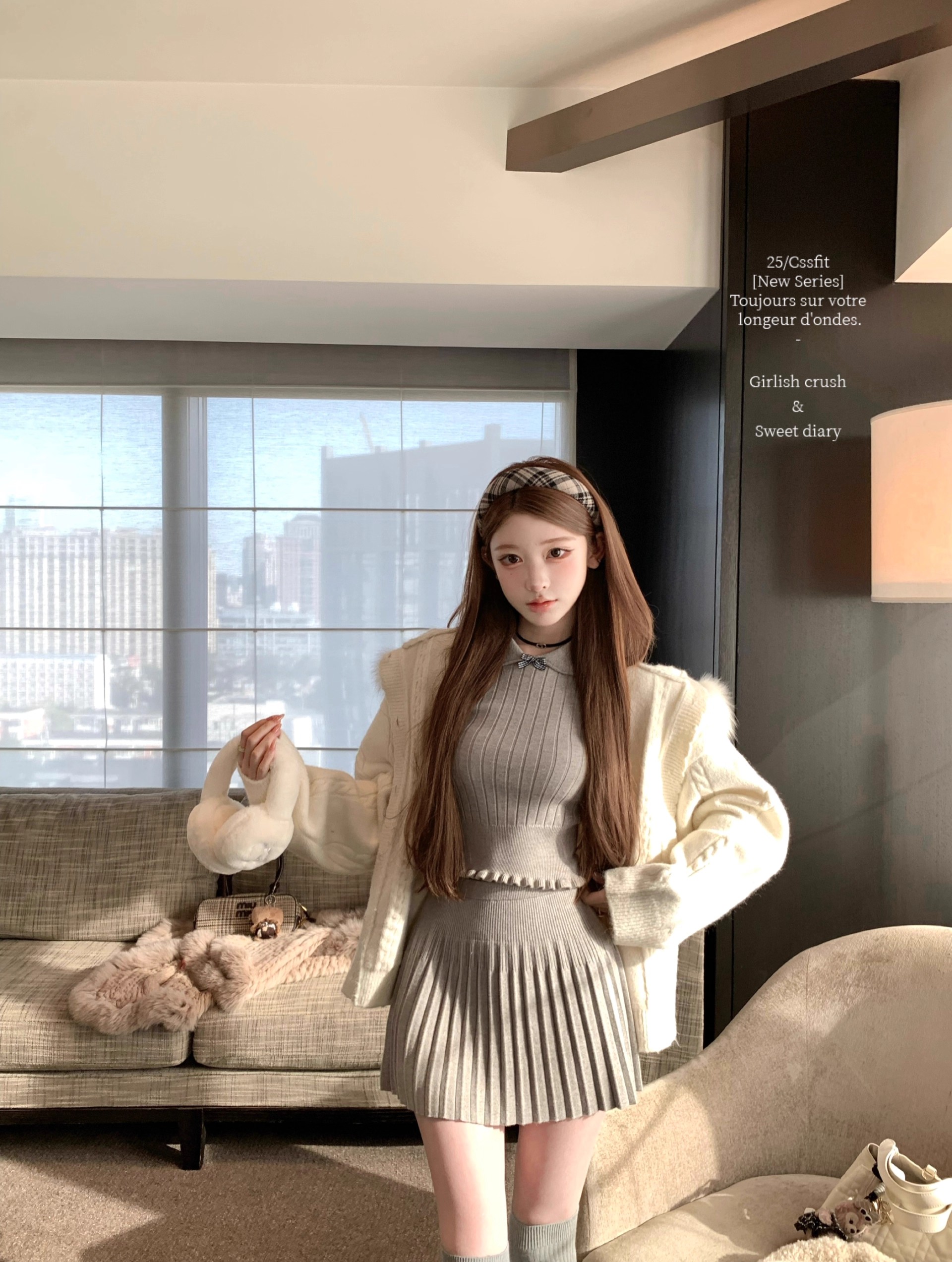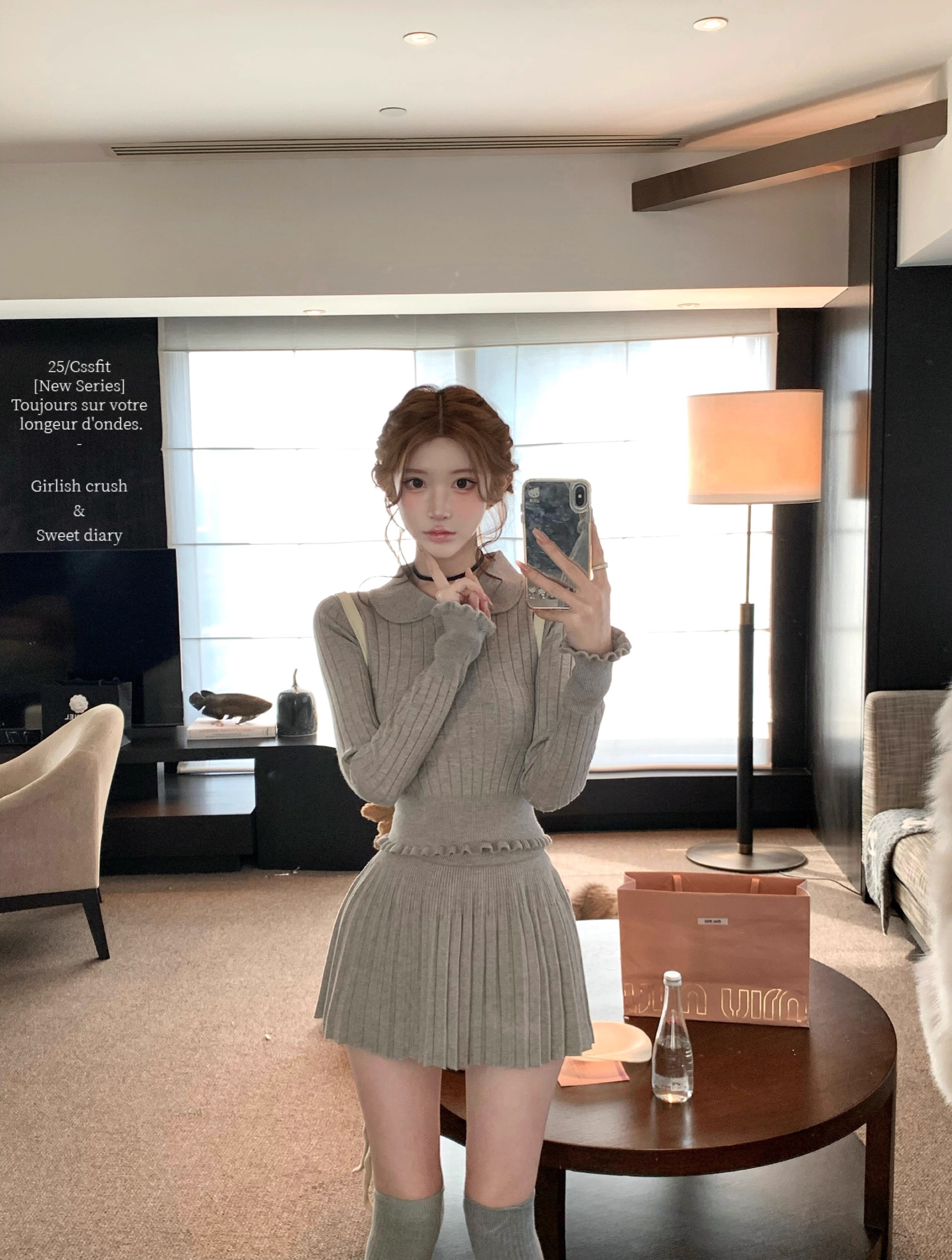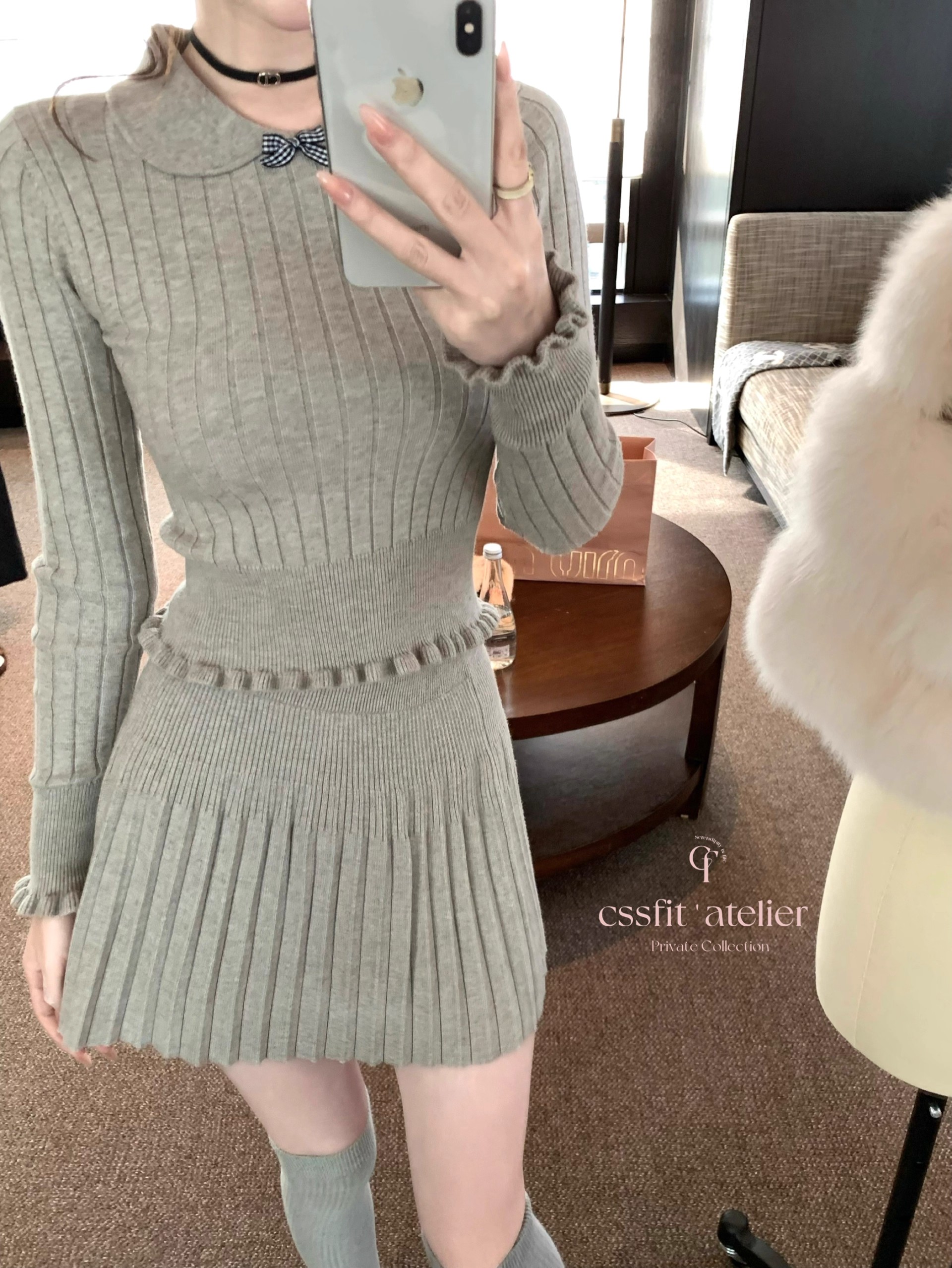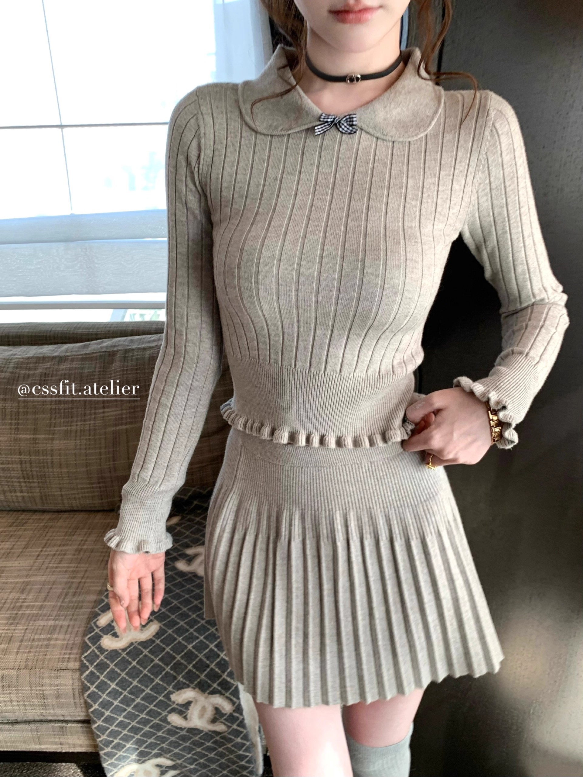 迟伞伞25/fw 灰色风信子 彼得潘领蝴蝶结针织上衣百褶半裙套装