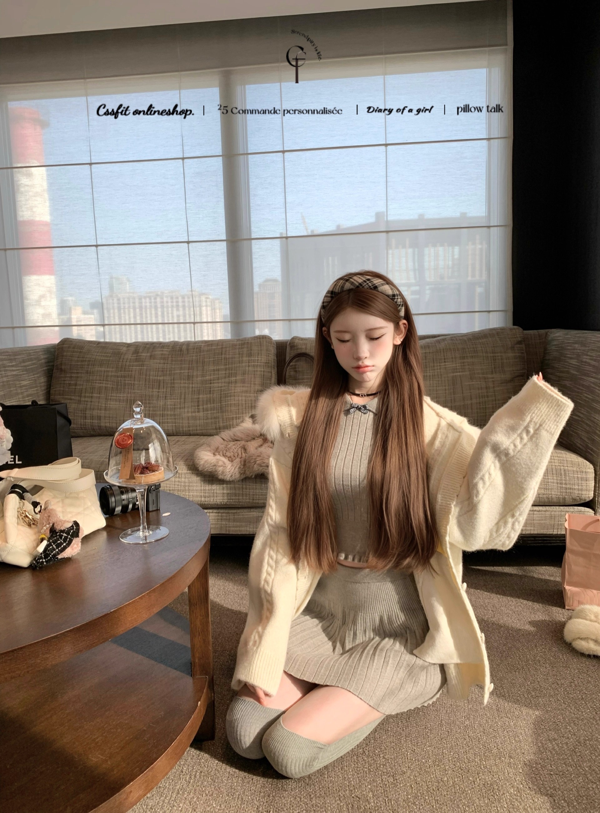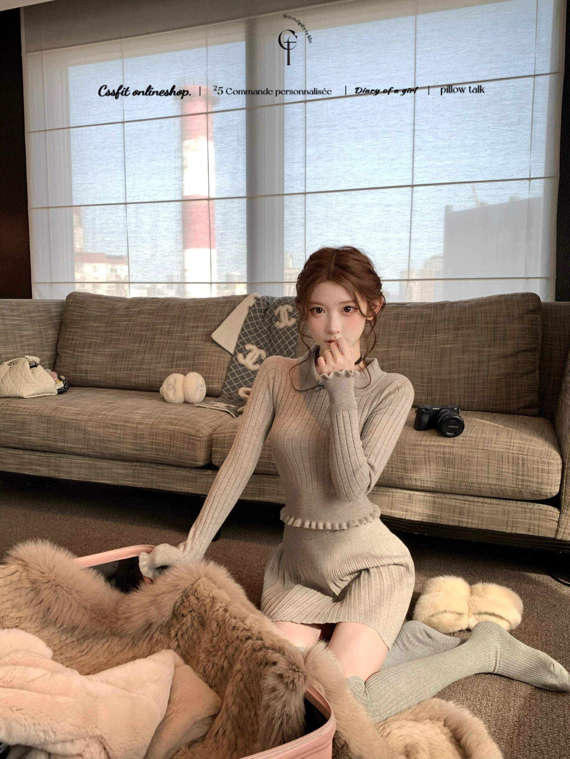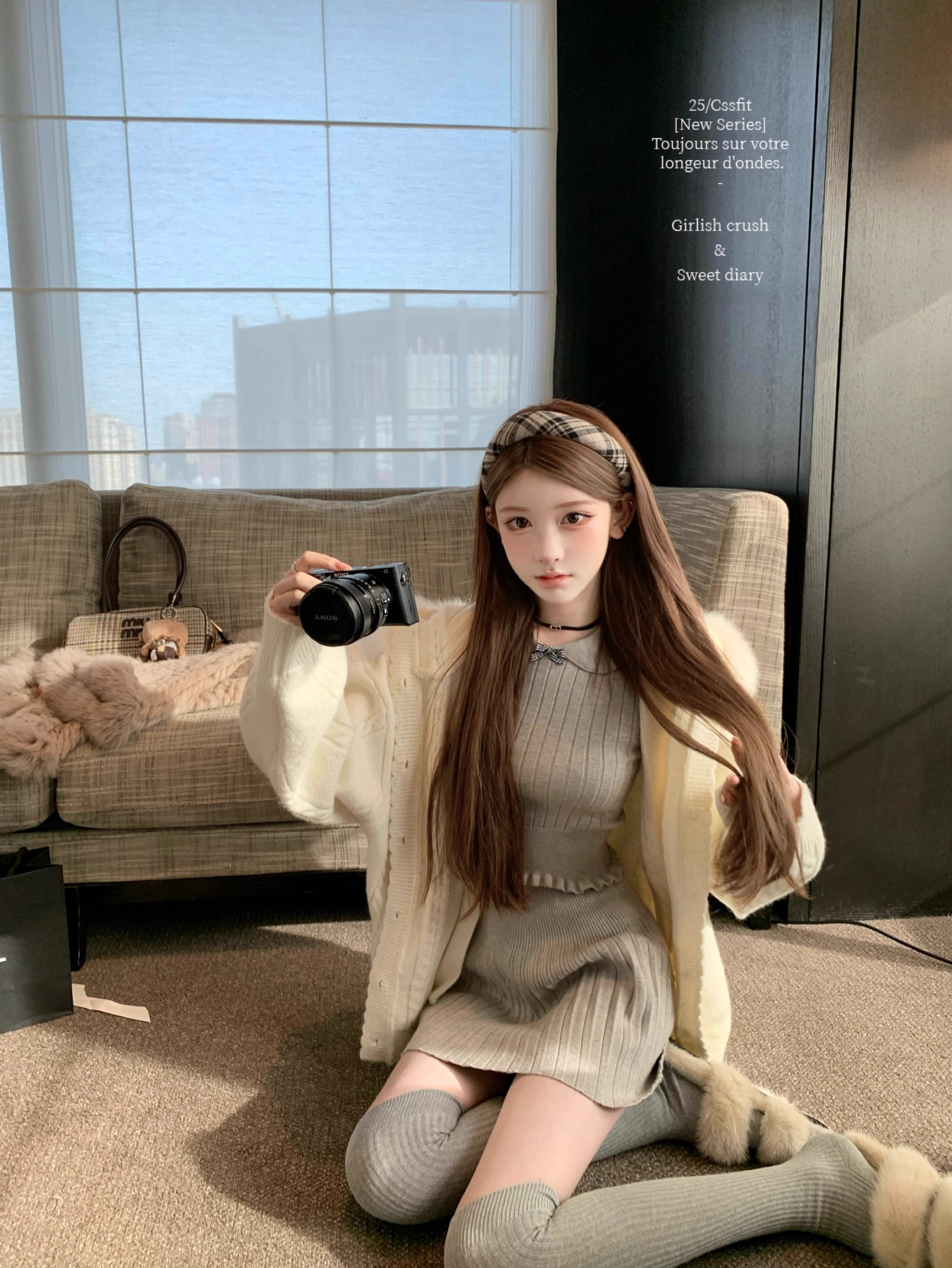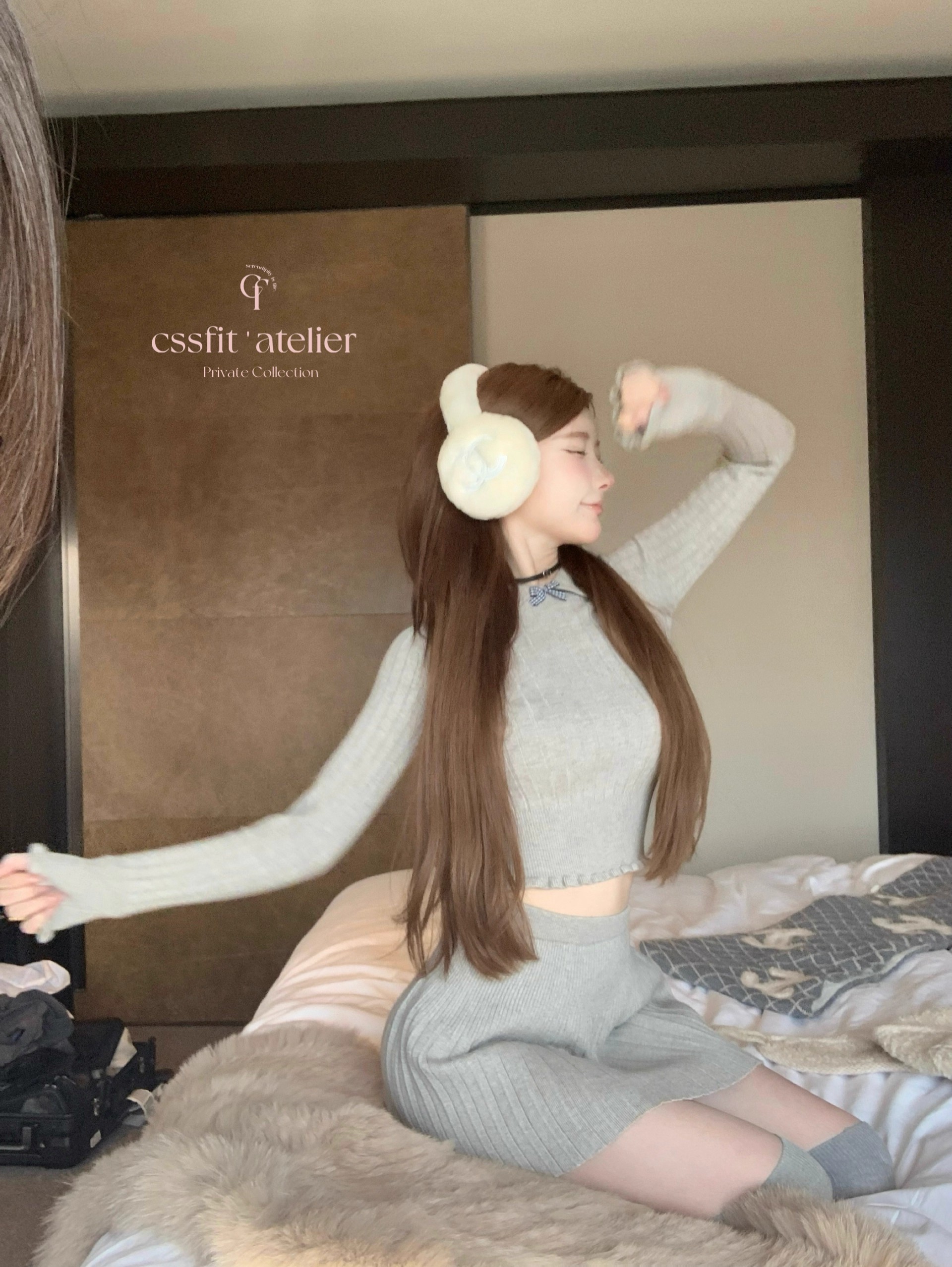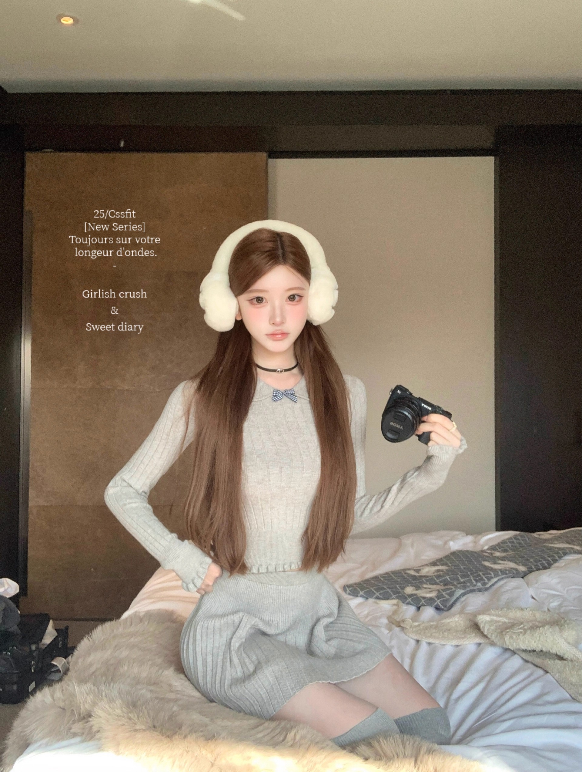 迟伞伞25/fw 灰色风信子 彼得潘领蝴蝶结针织上衣百褶半裙套装