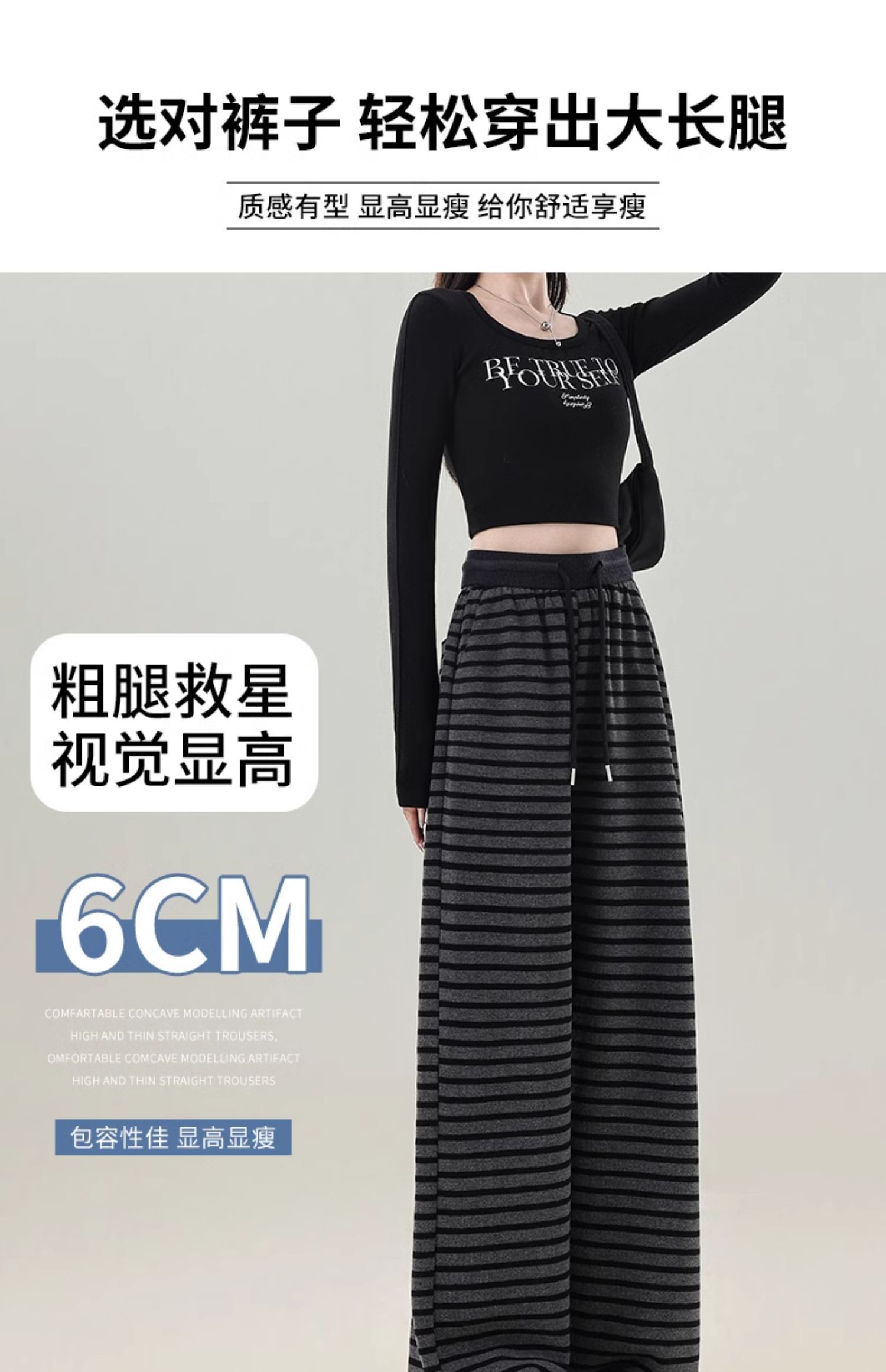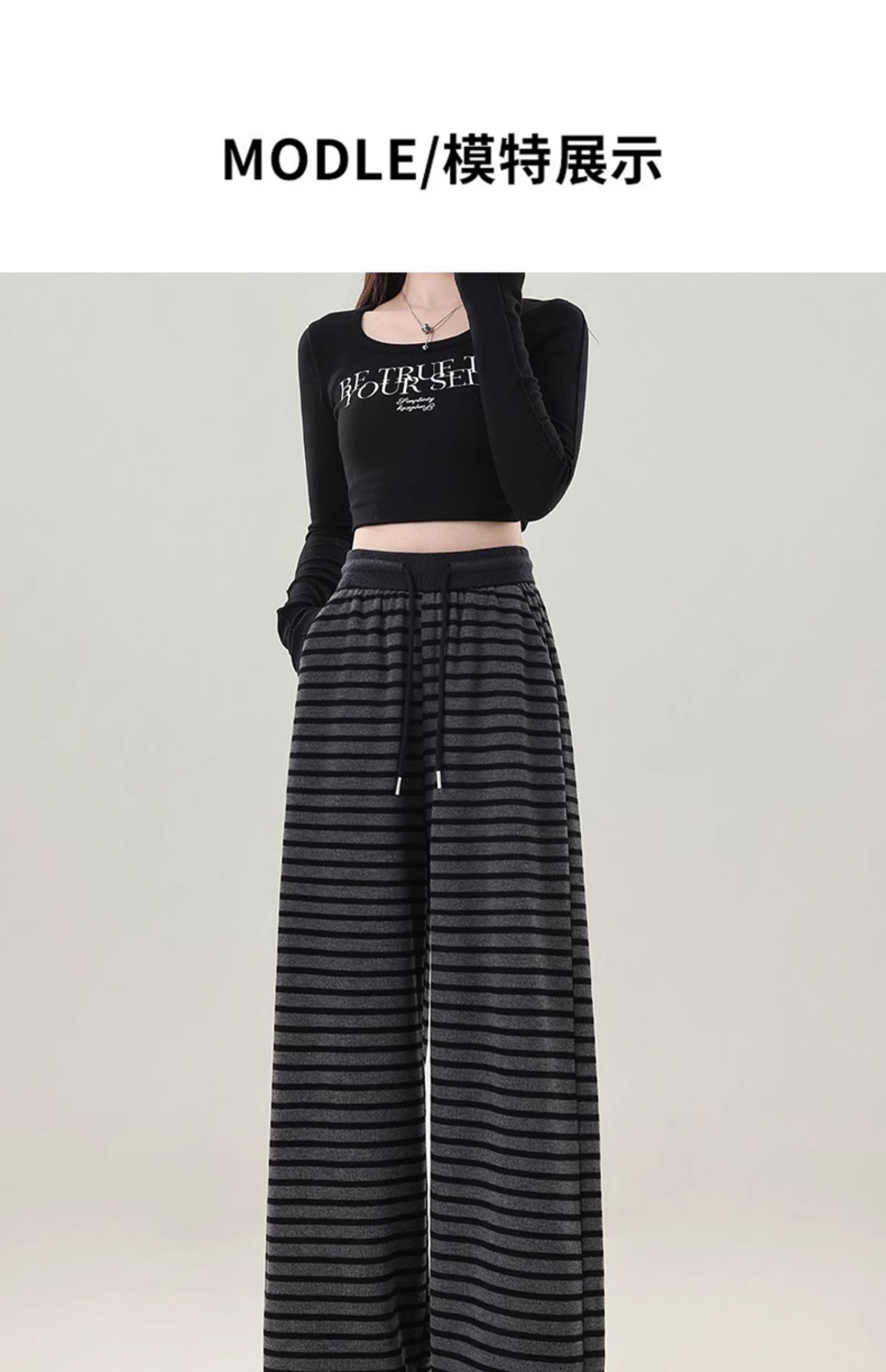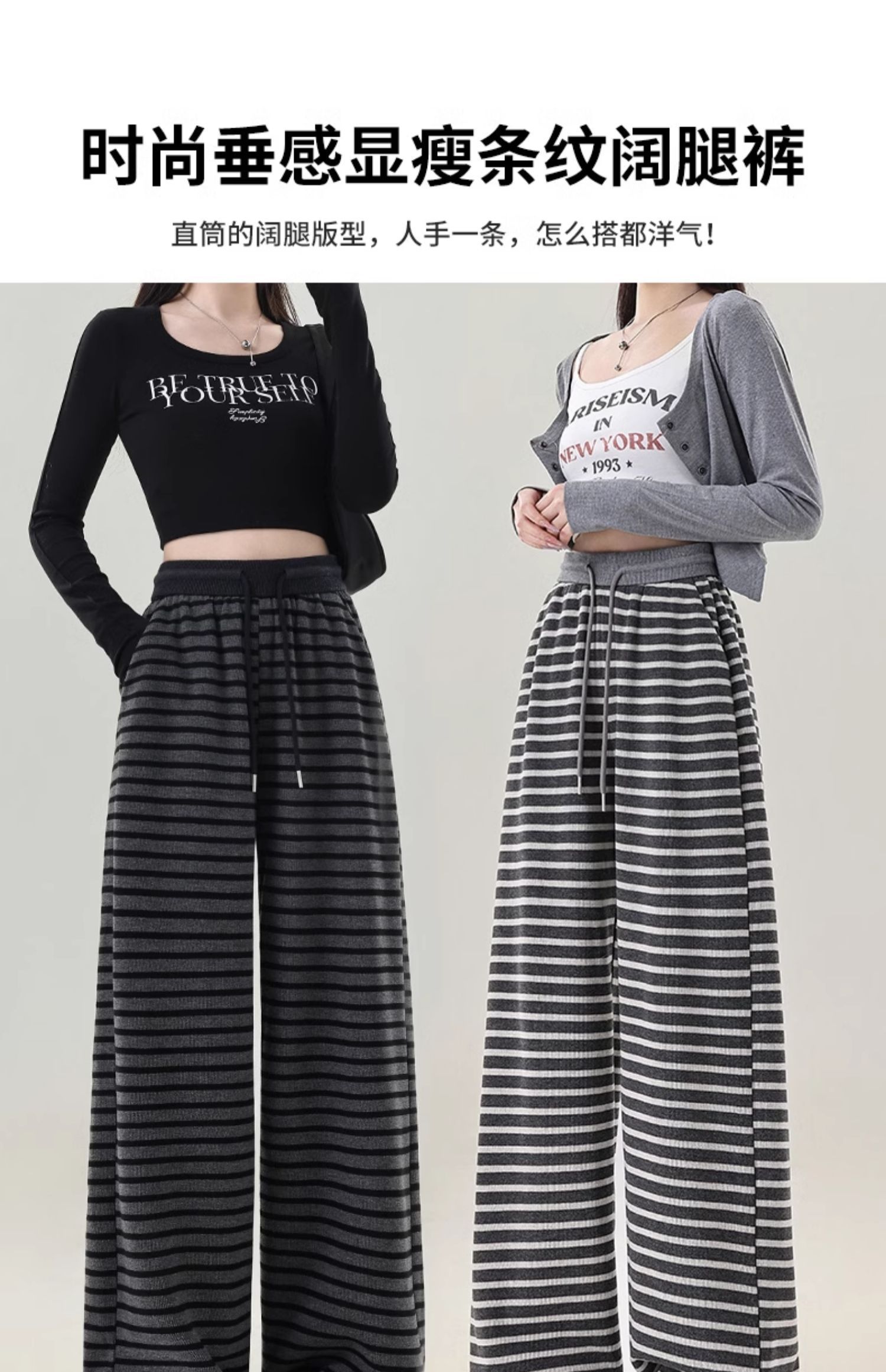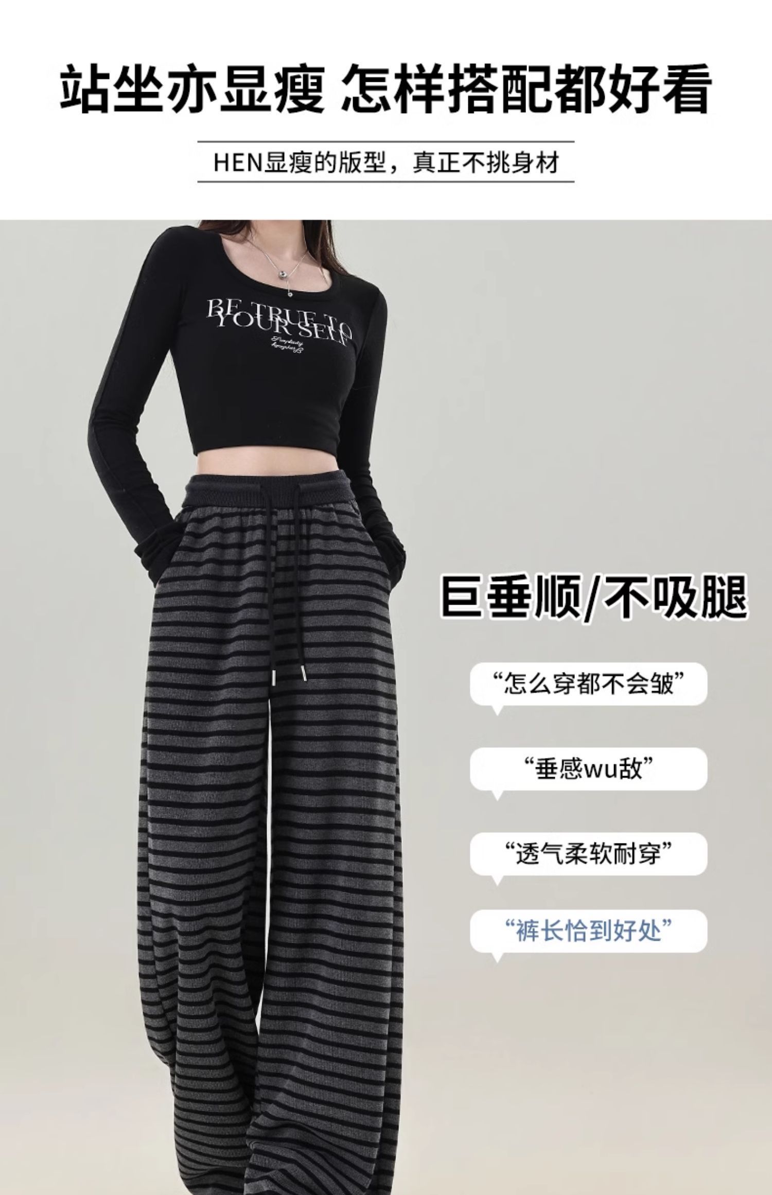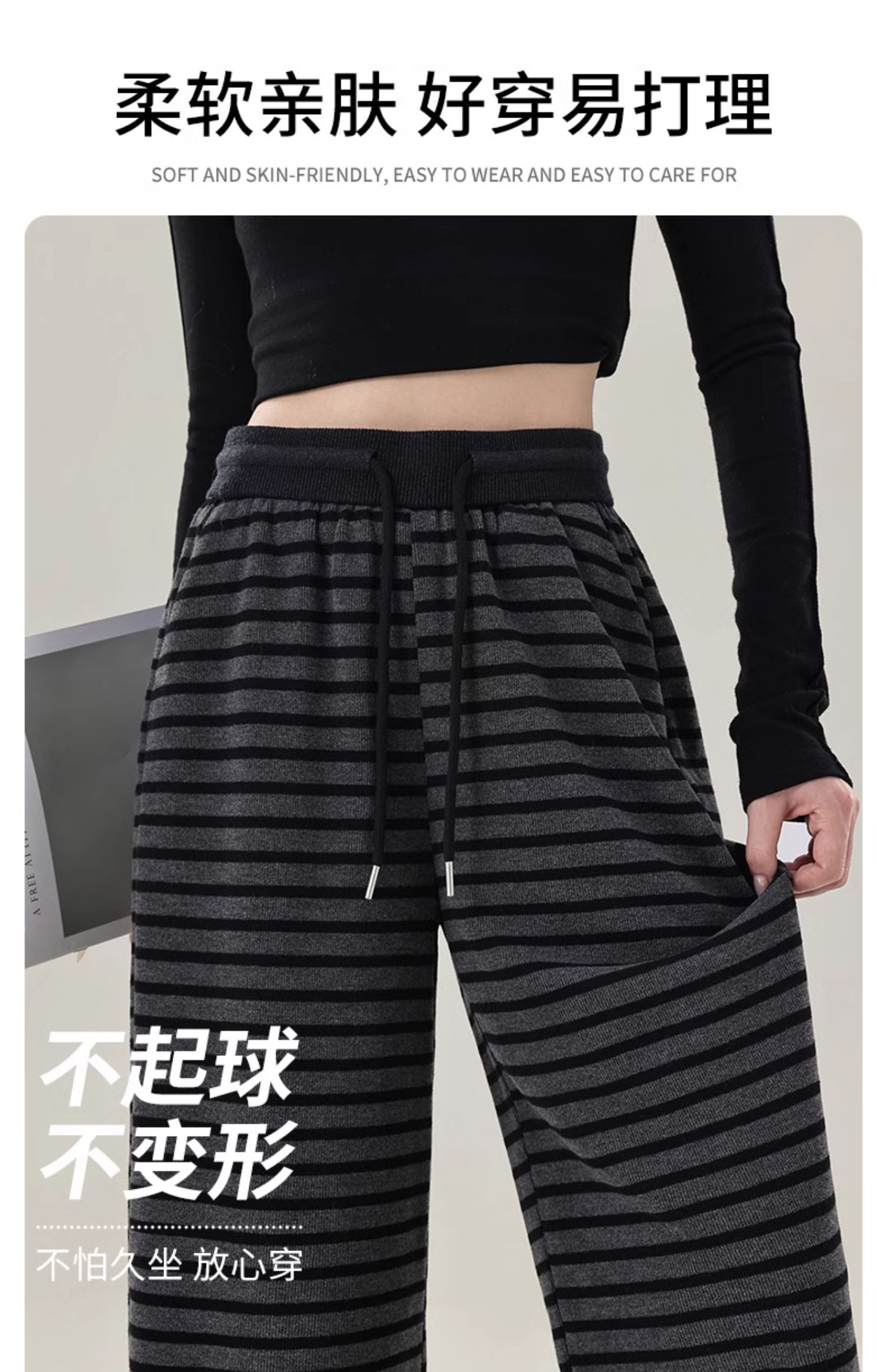 秋冬加绒慵懒条纹针织阔腿裤女春秋2025新款高腰垂感直筒运动裤子