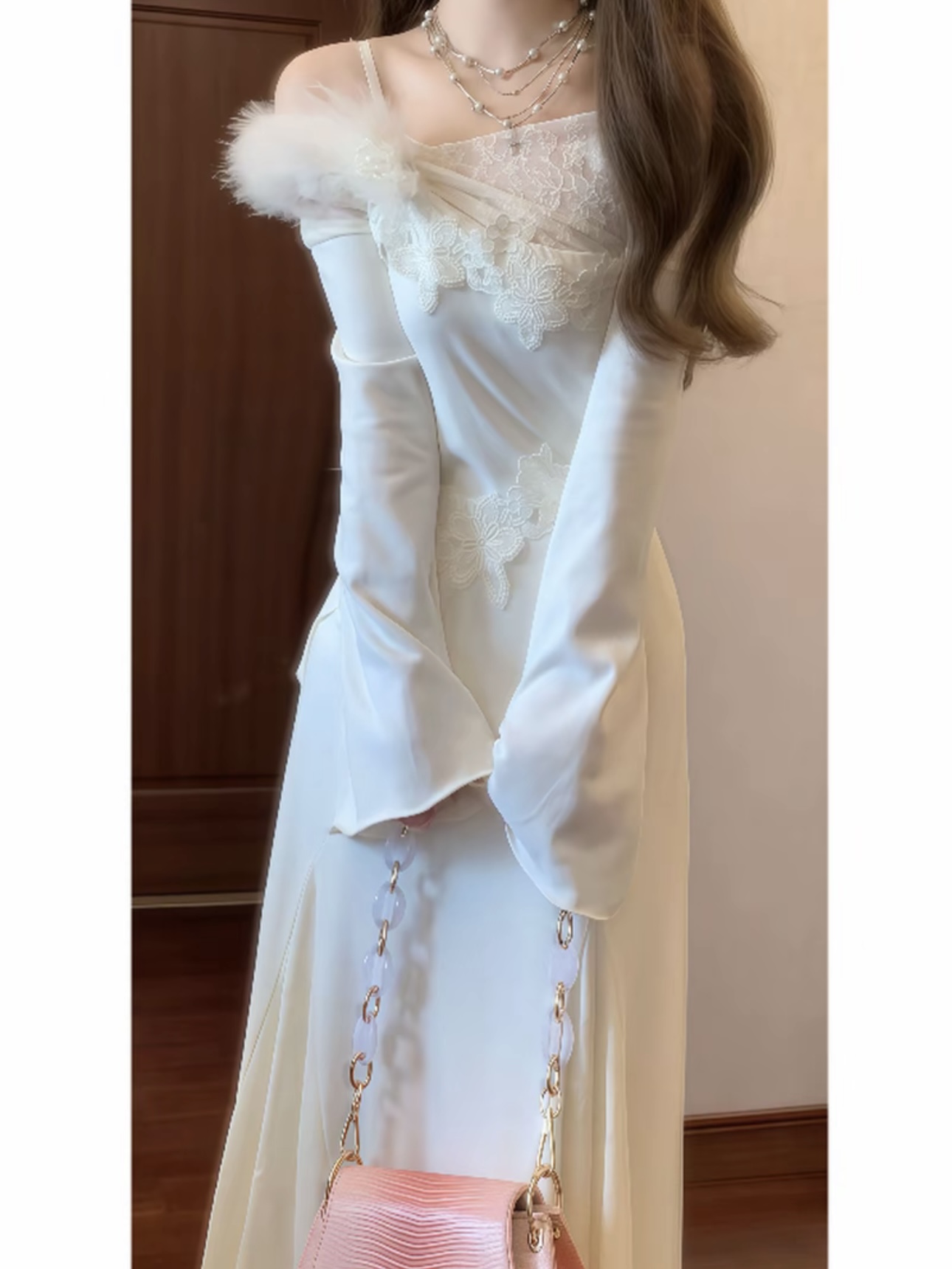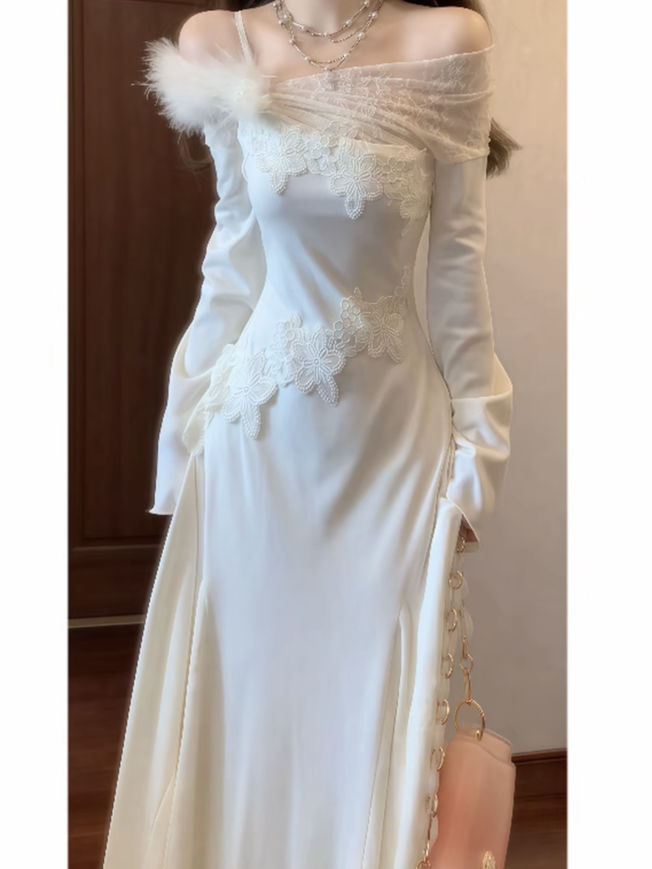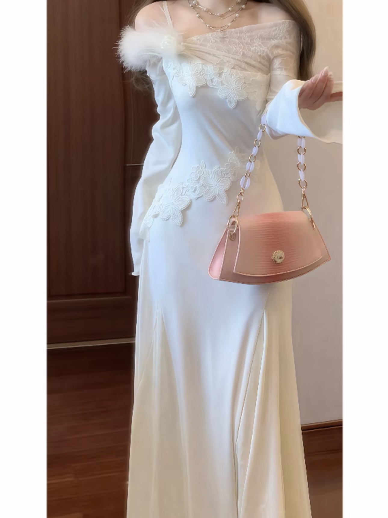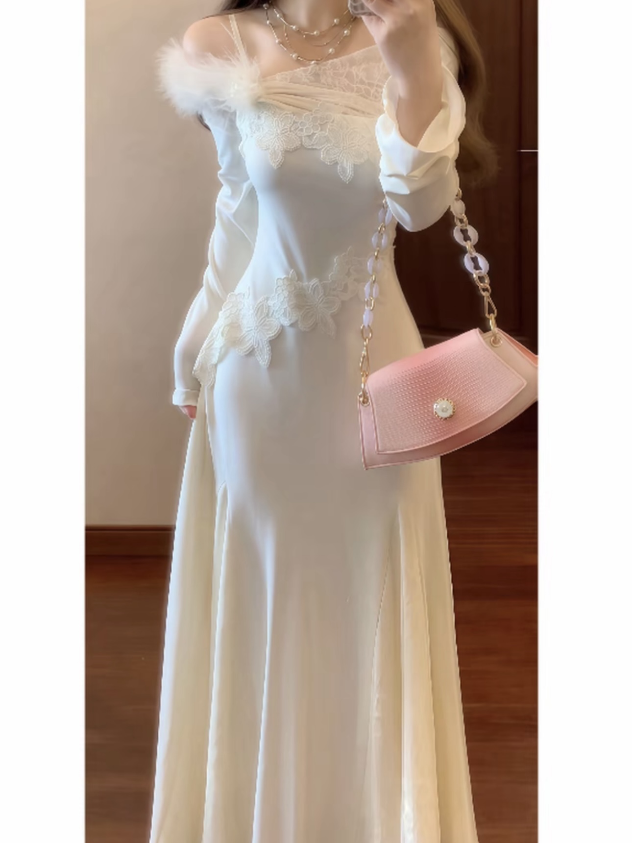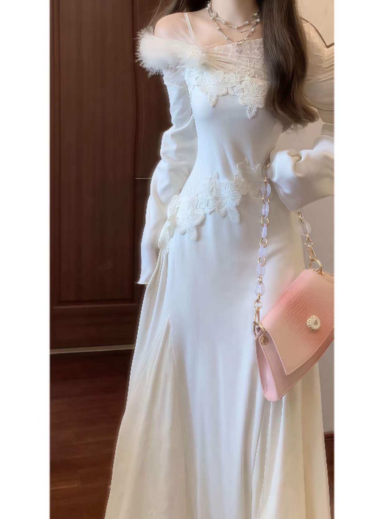 法式优雅气质浪漫蕾丝拼接立体花朵连衣裙收腰鱼尾长裙9848