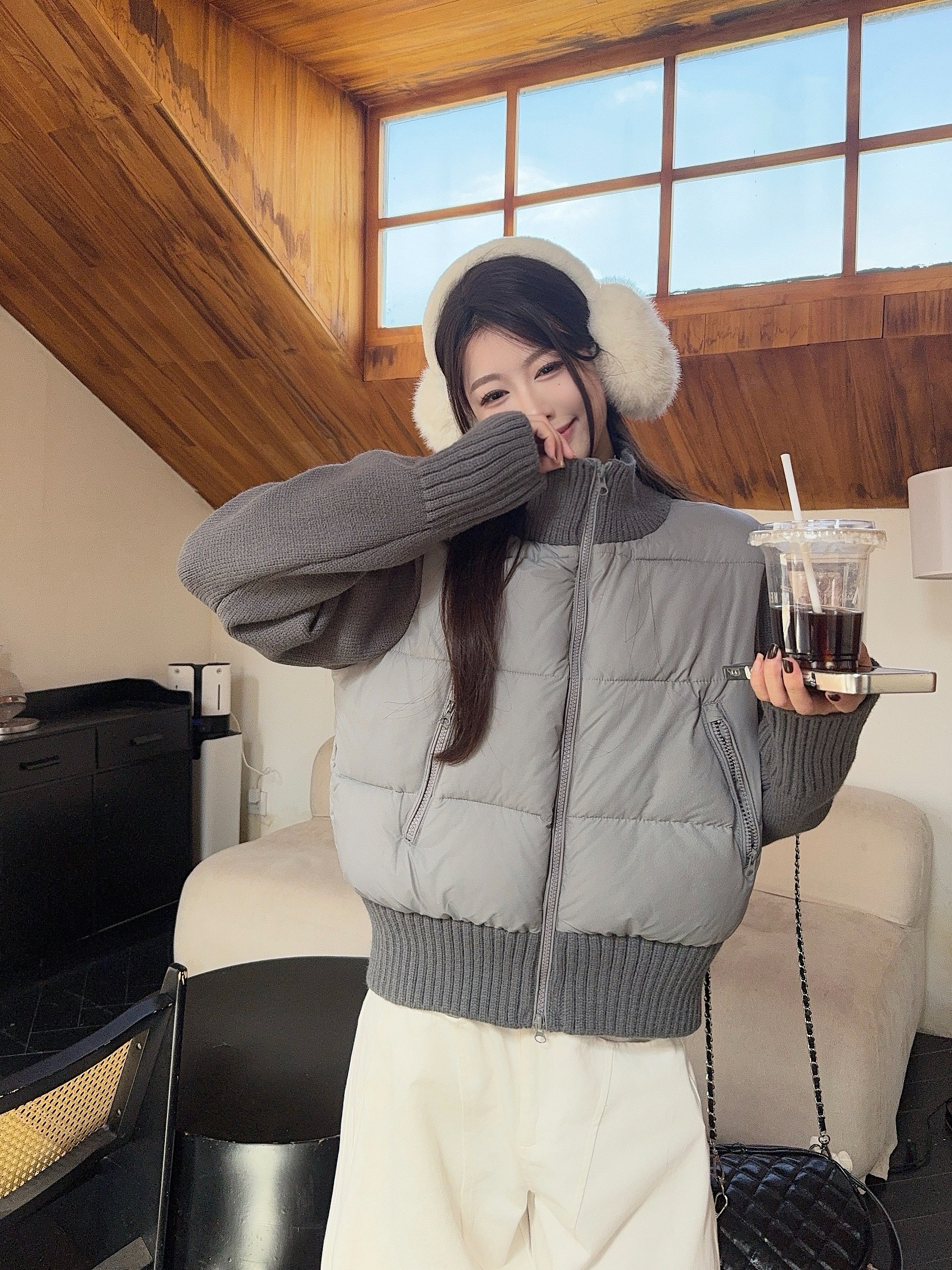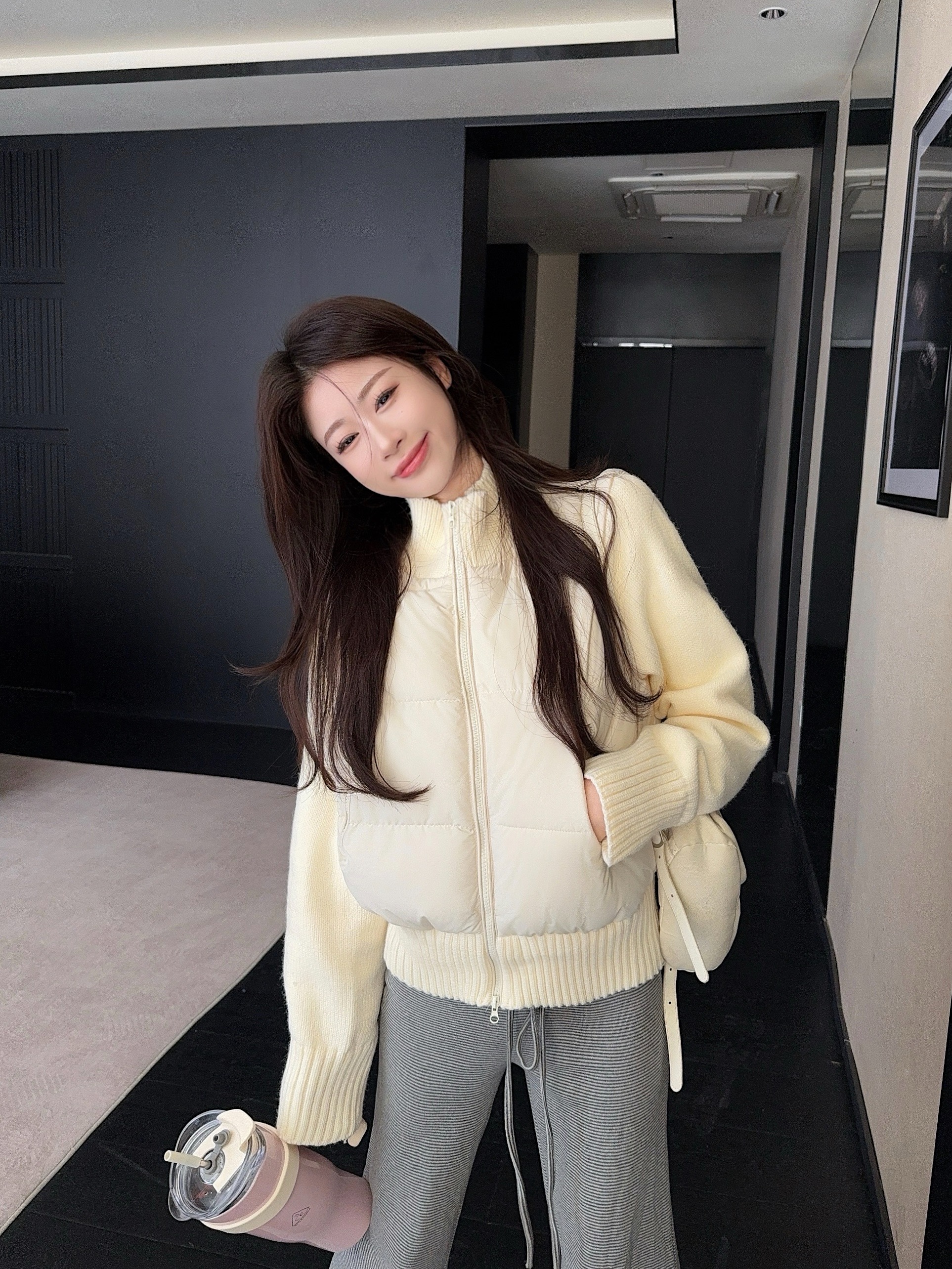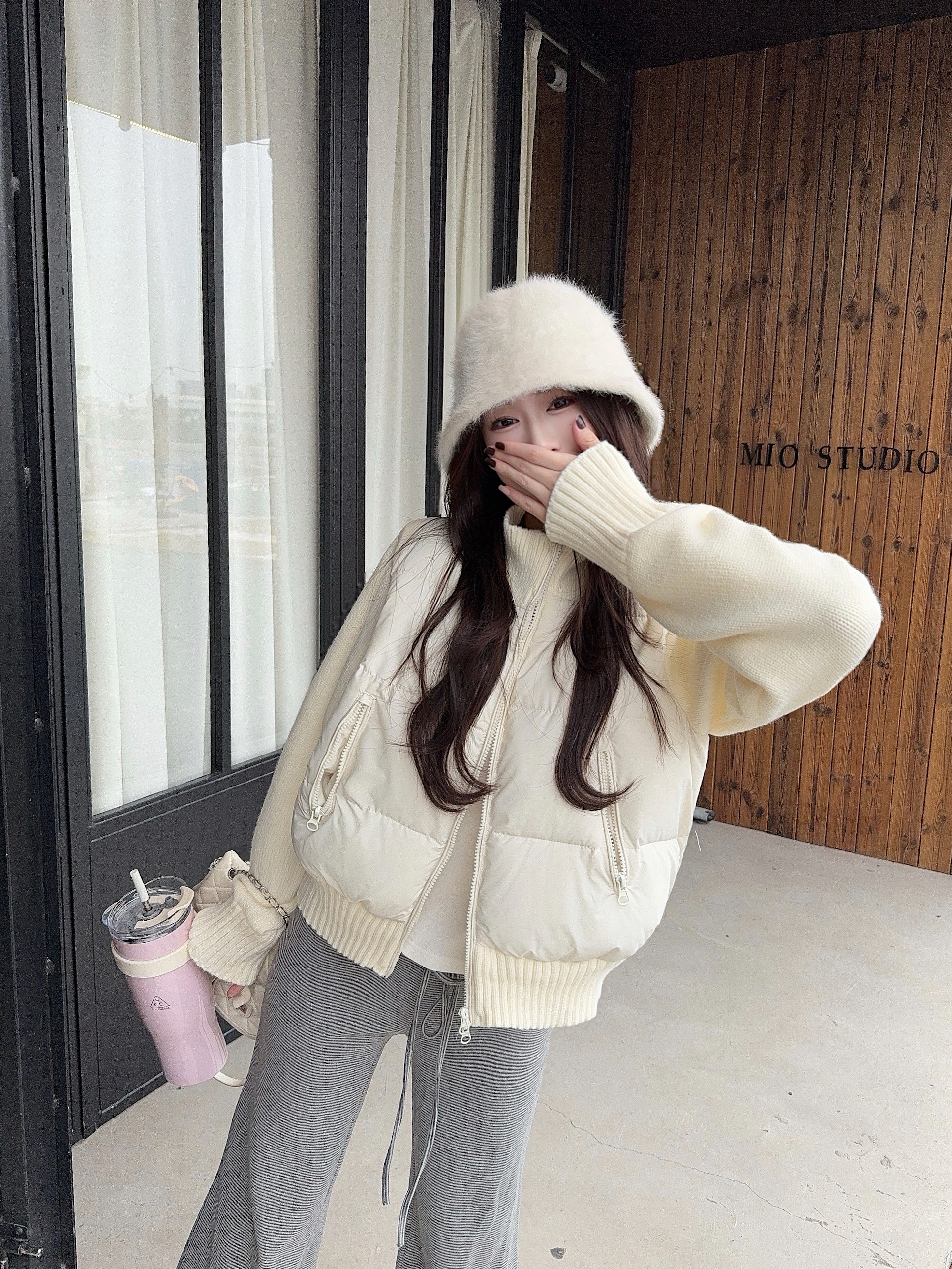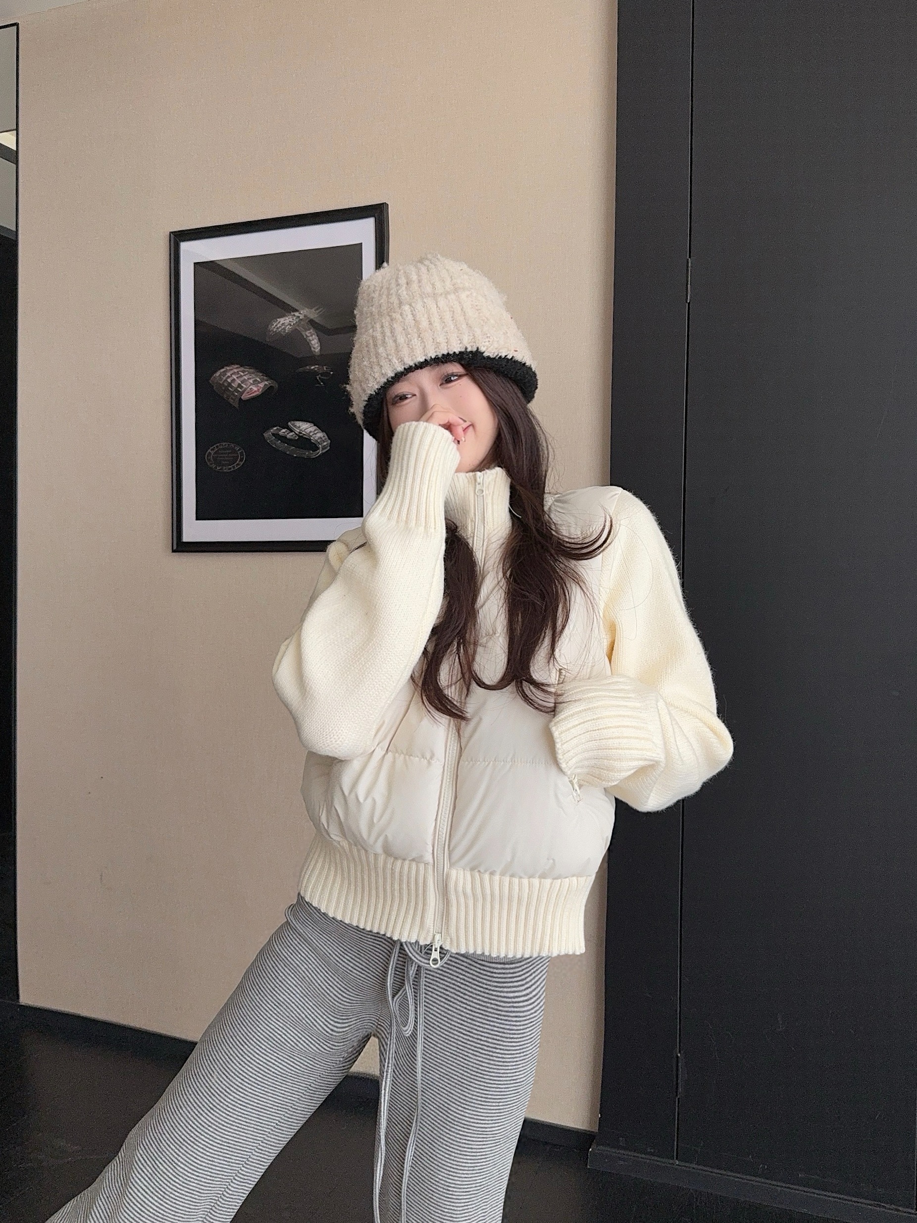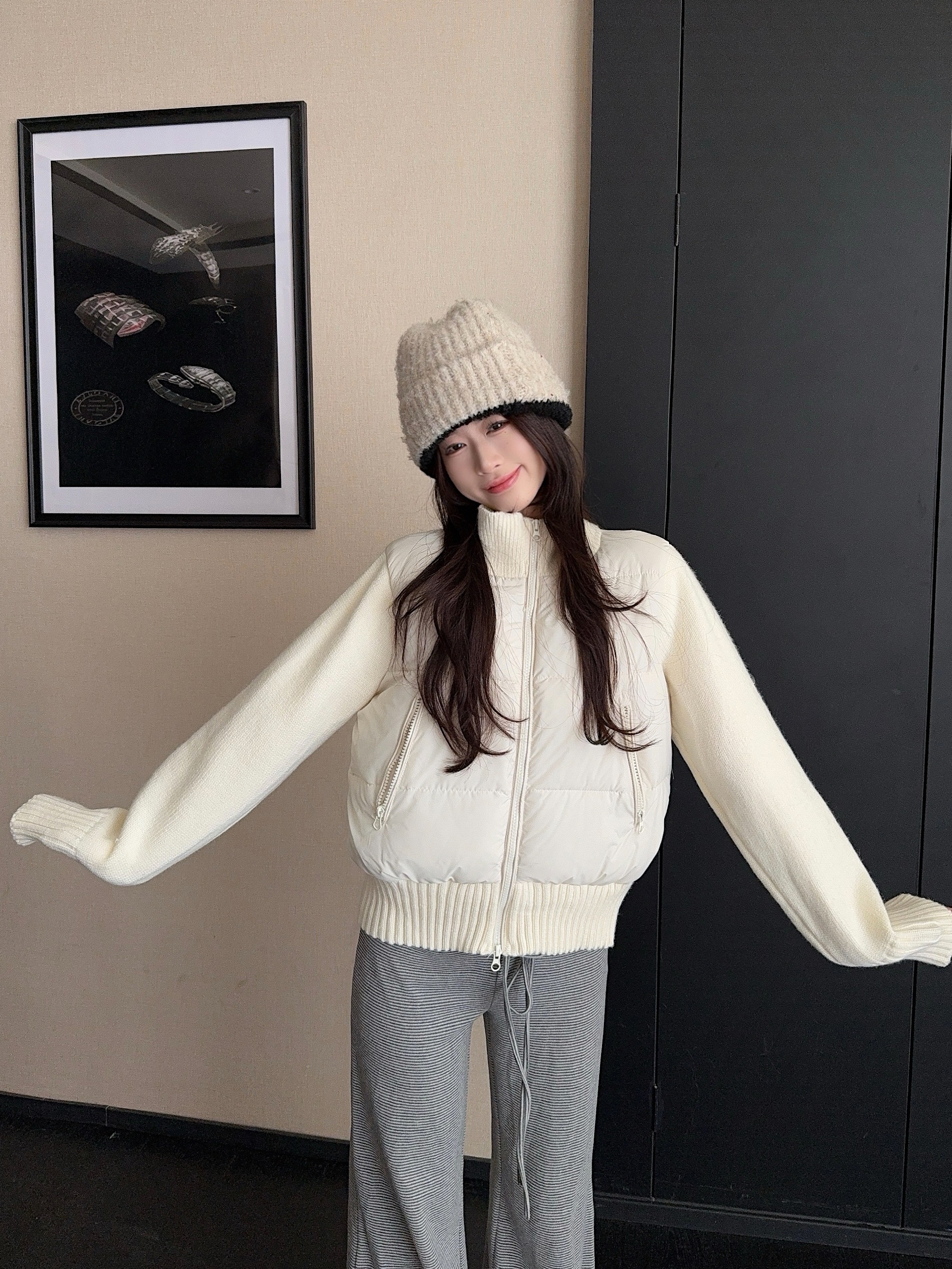 实拍 冬季新款羽绒棉服女短款小个子加厚针织袖拼接轻薄外套