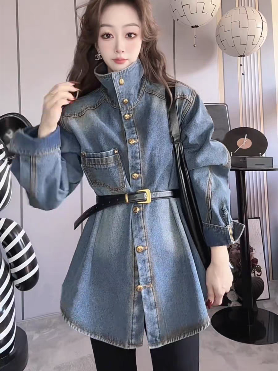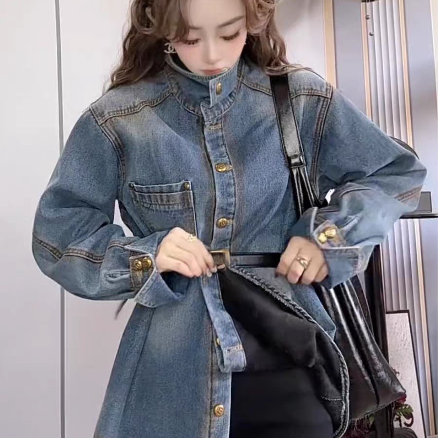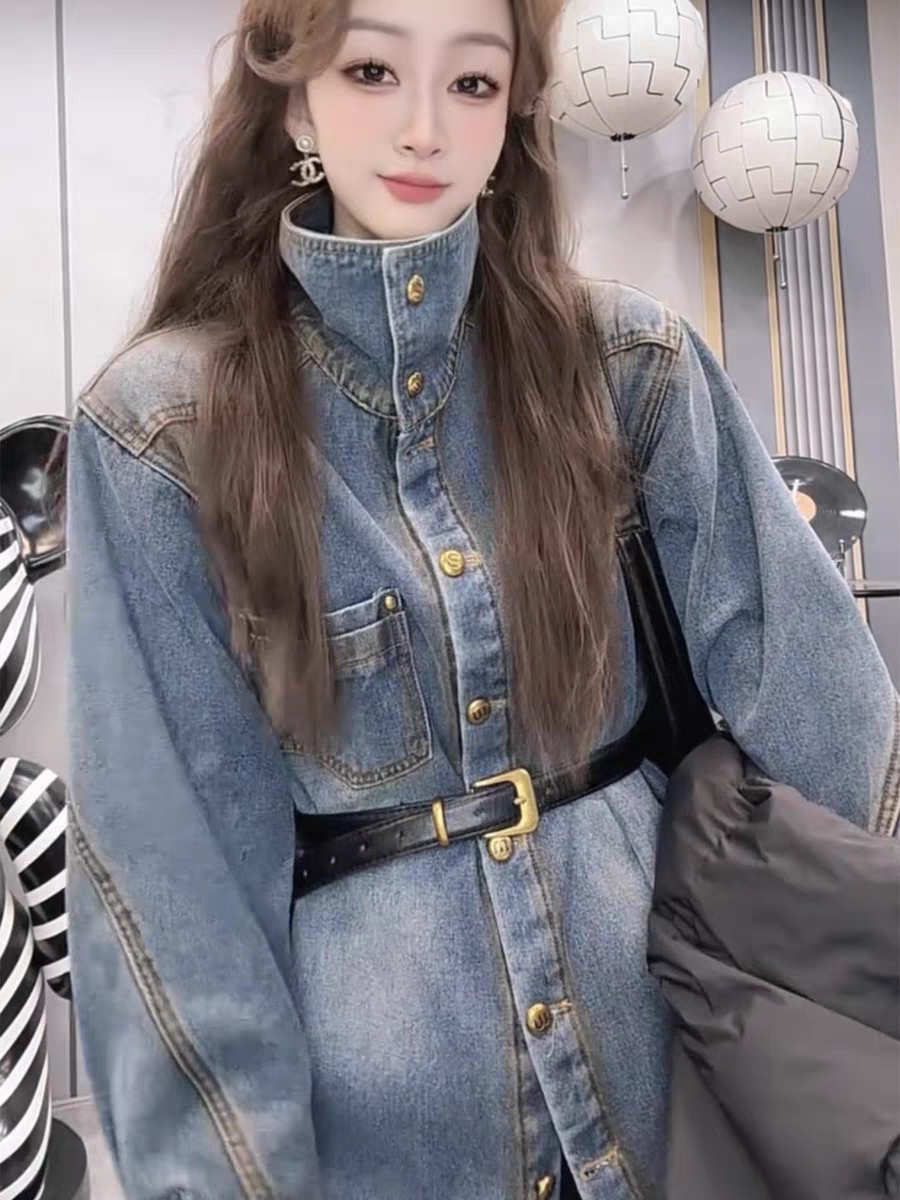 美式金扣立领加绒牛仔外套女2025秋冬季欧货宽松配腰带加厚衬衫
