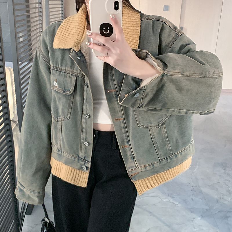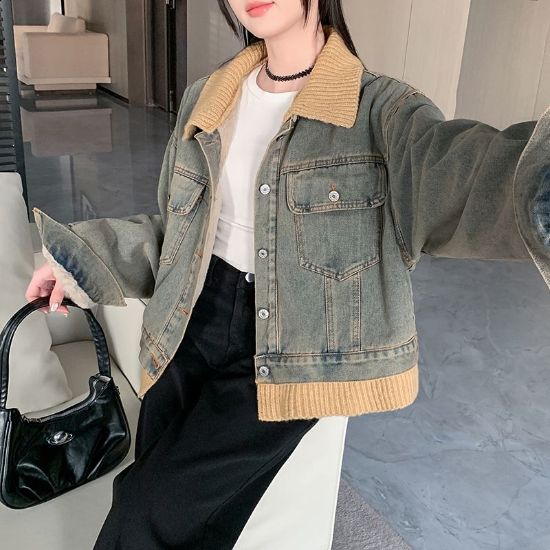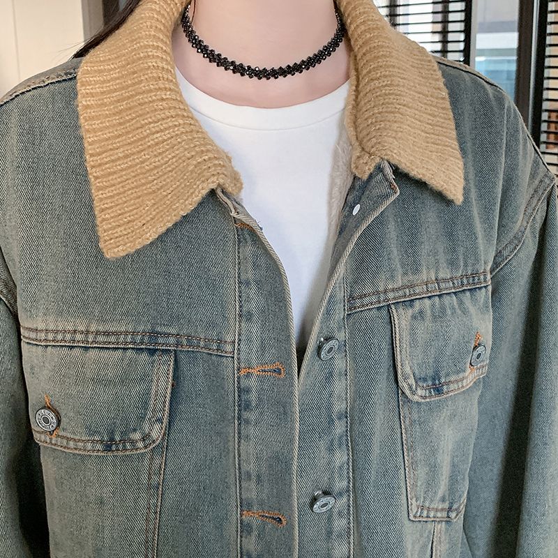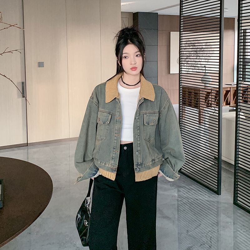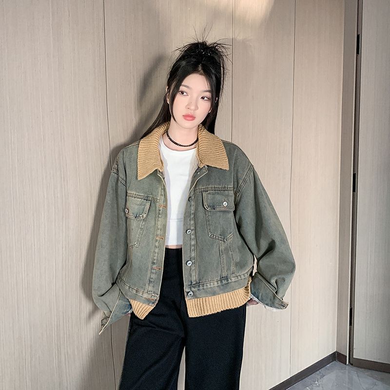 实拍实价~复古慵懒风撞色翻领牛仔外套女秋冬加绒新款小众上衣潮