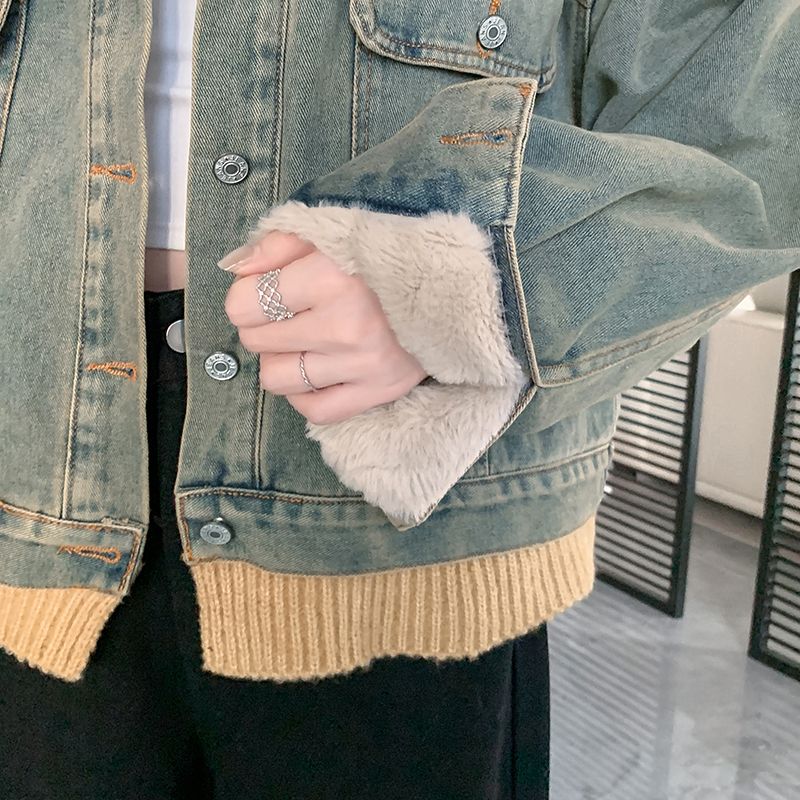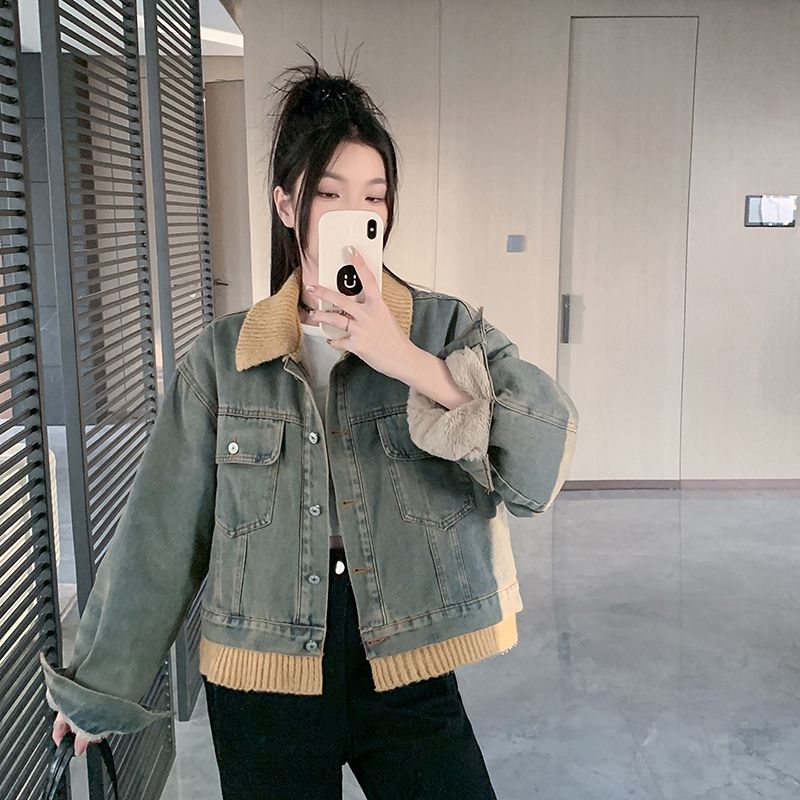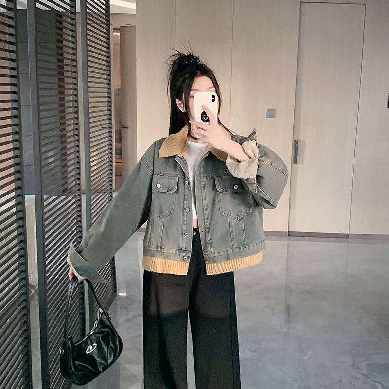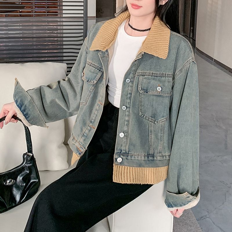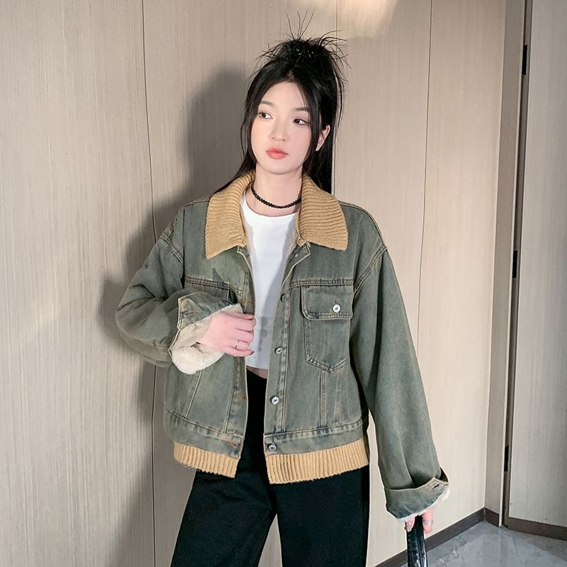 实拍实价~复古慵懒风撞色翻领牛仔外套女秋冬加绒新款小众上衣潮