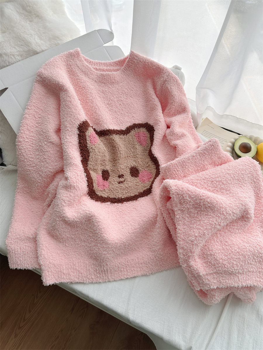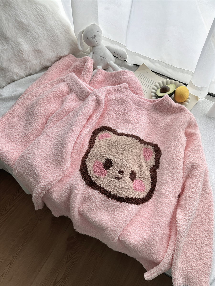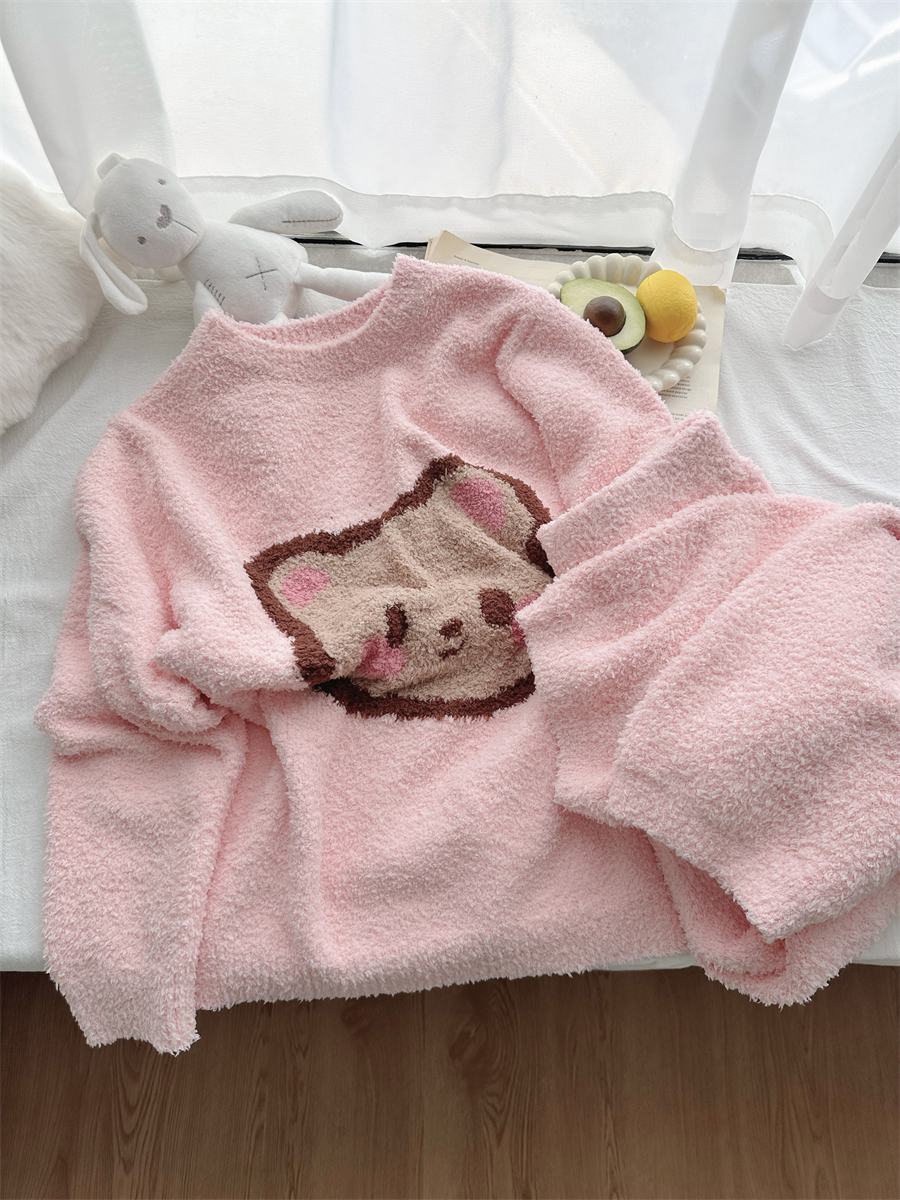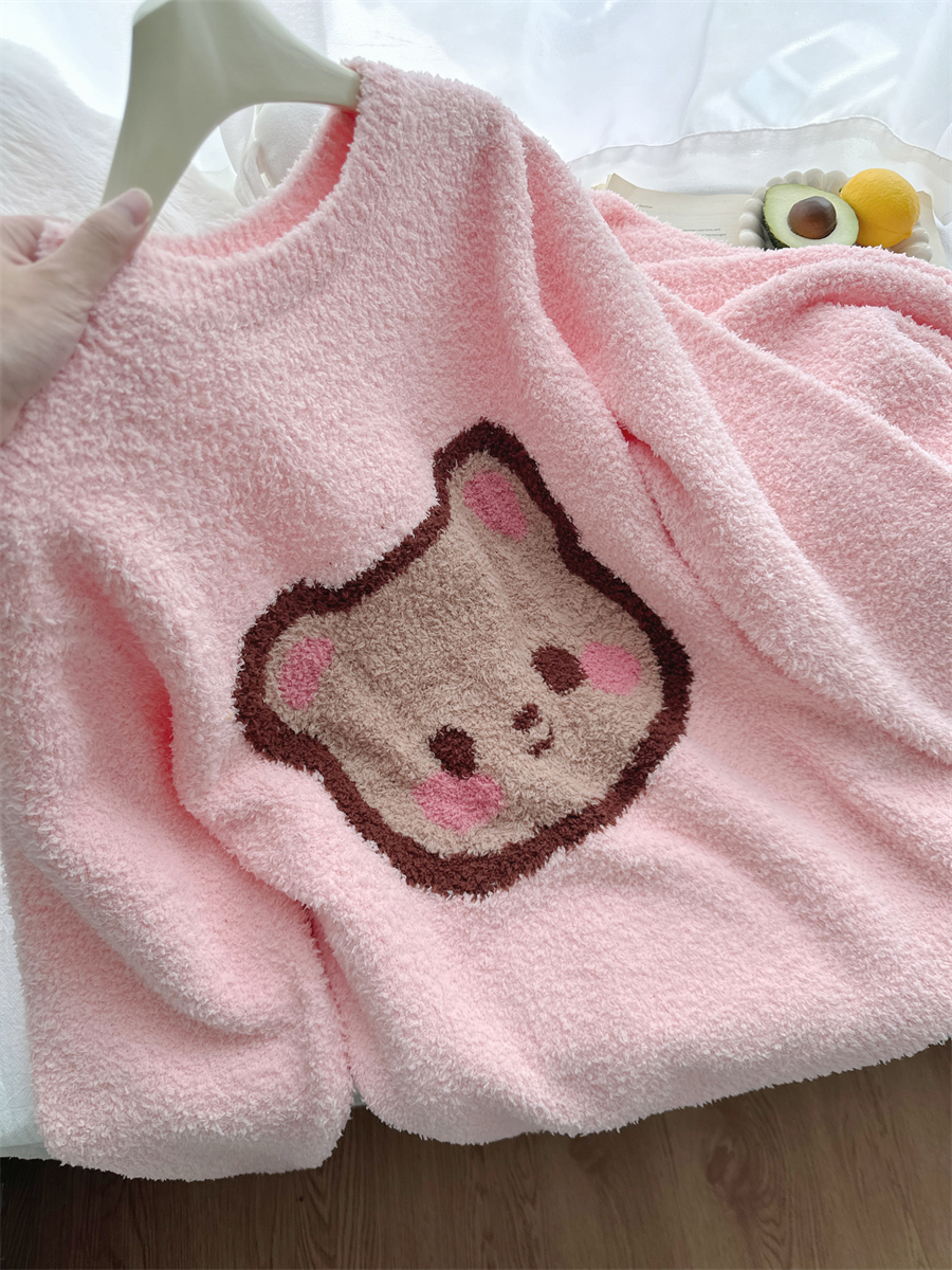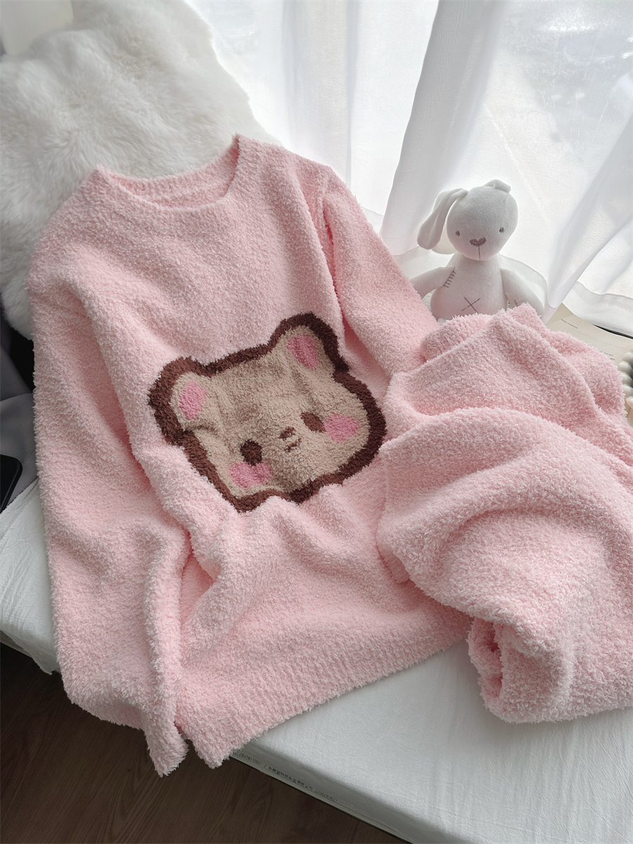 圆领粉小熊韩版卡通加绒半边绒睡衣女冬季珊瑚绒两件套家居服官方
