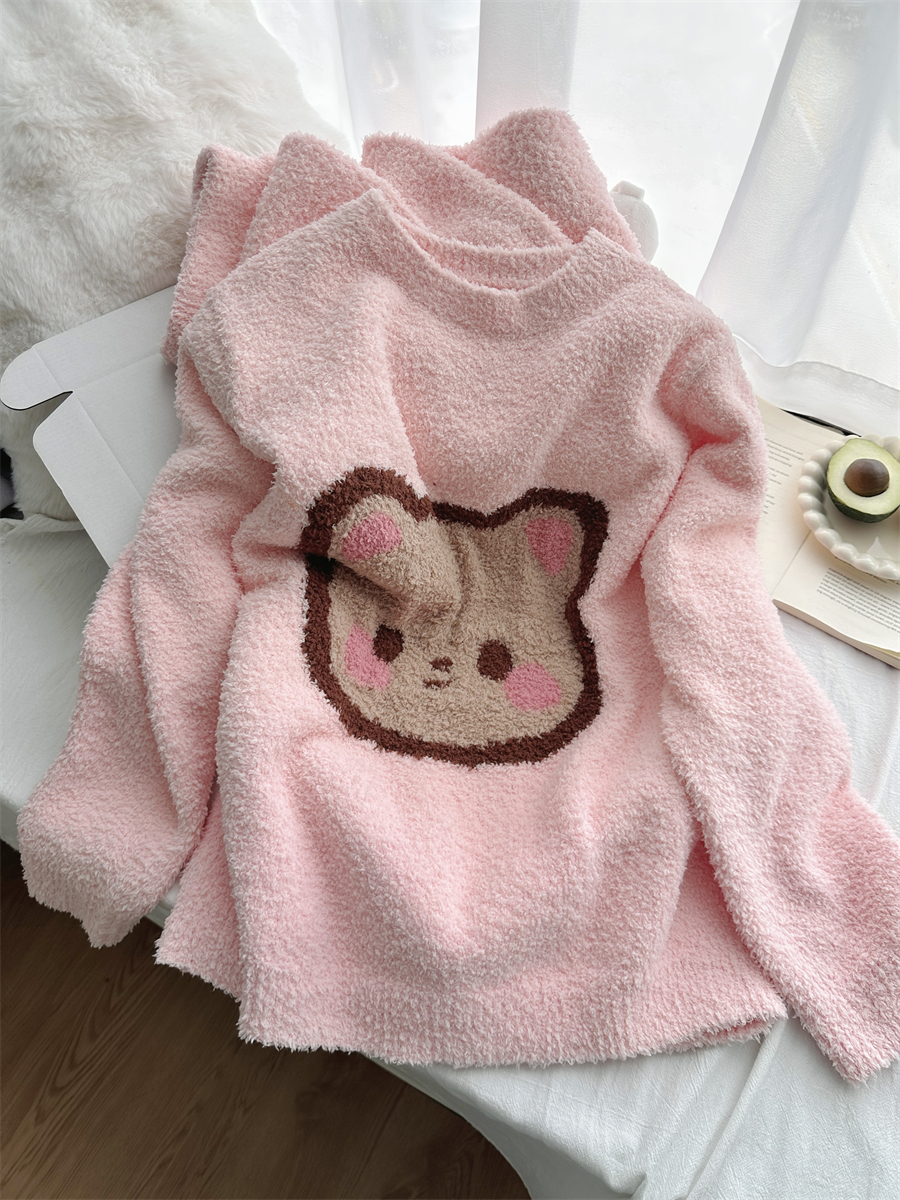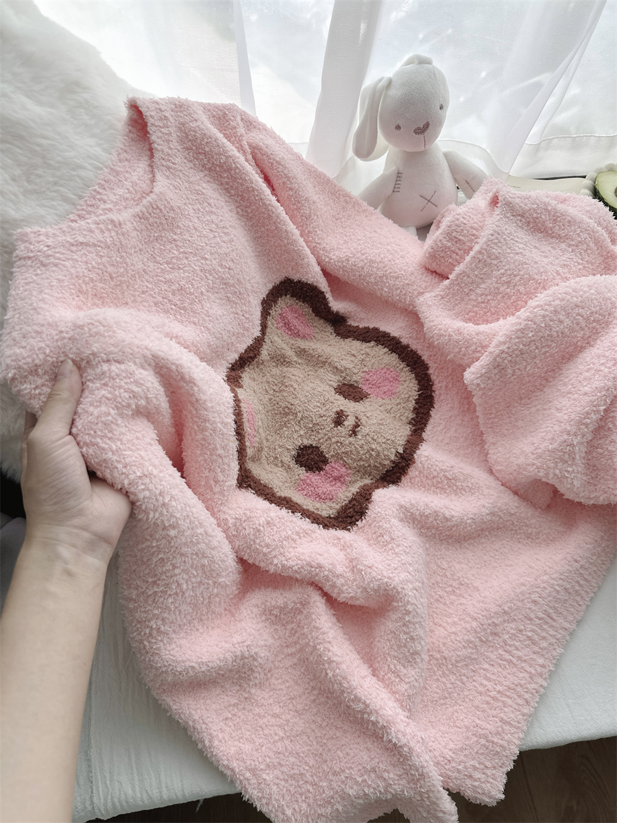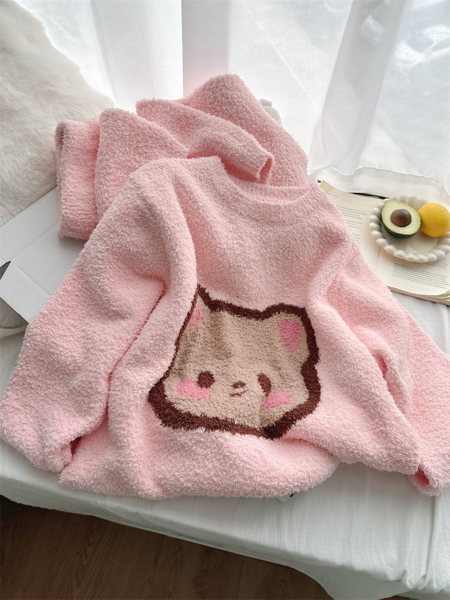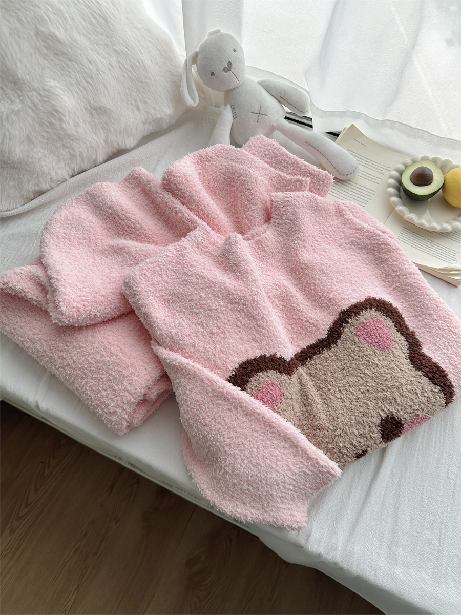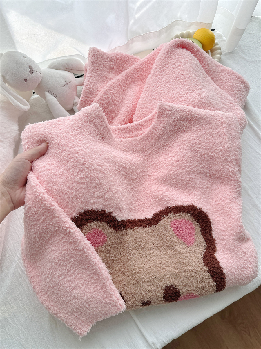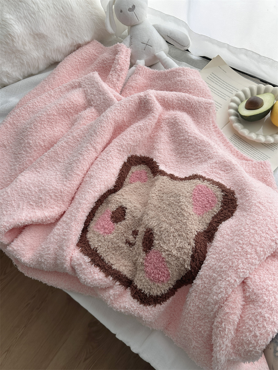 圆领粉小熊韩版卡通加绒半边绒睡衣女冬季珊瑚绒两件套家居服官方