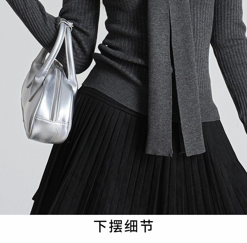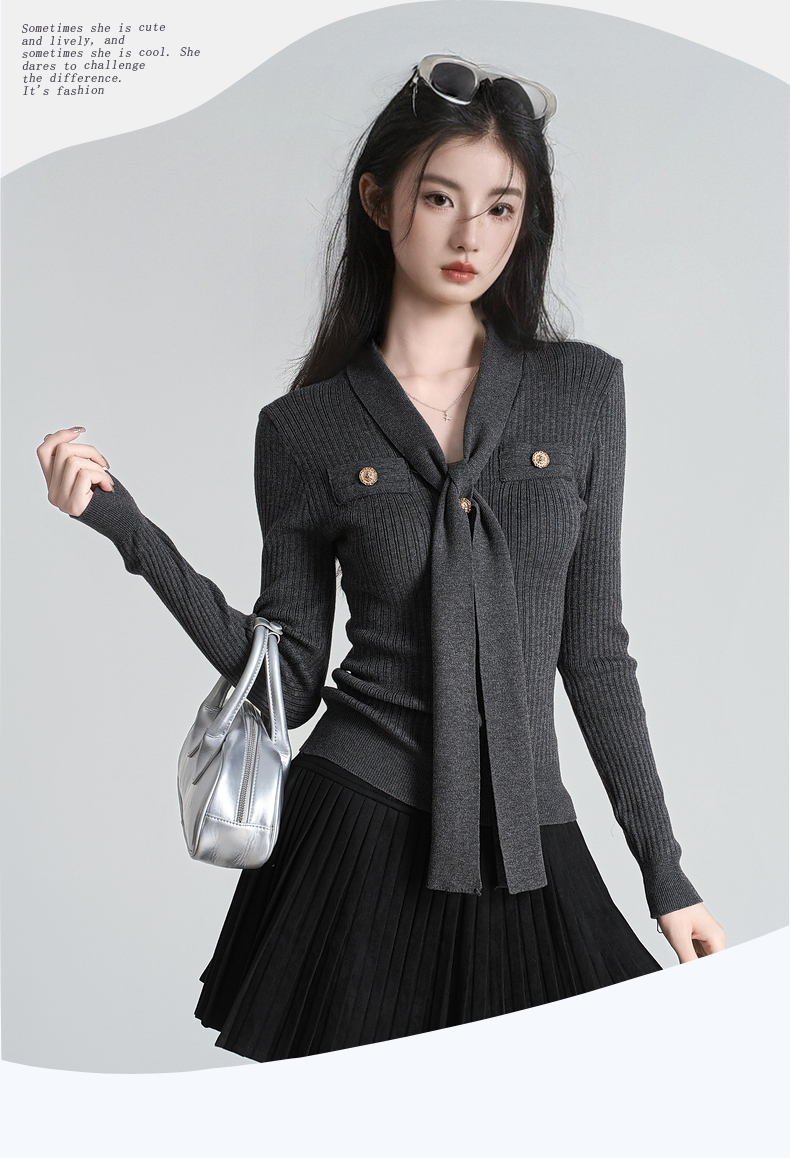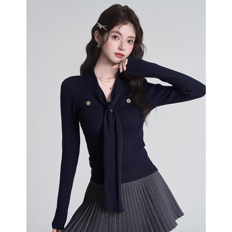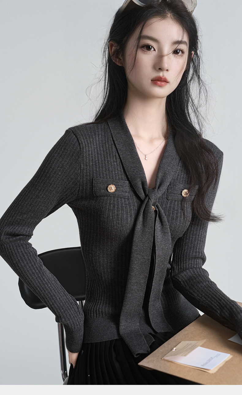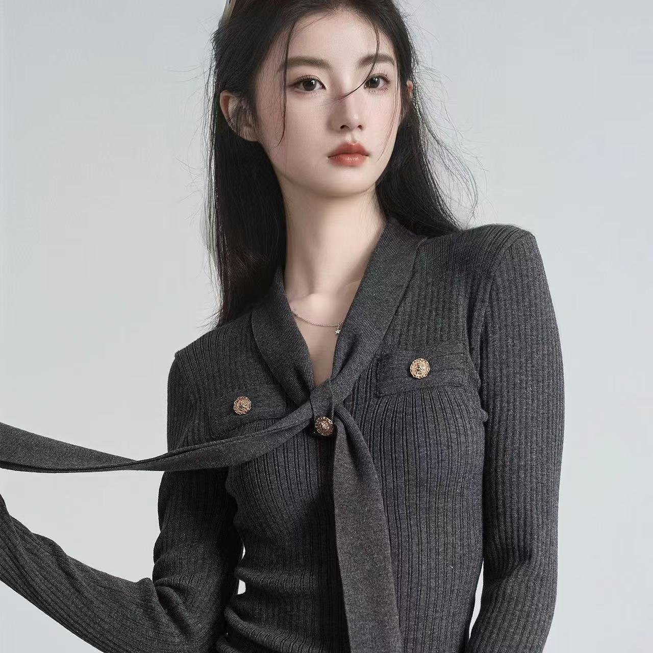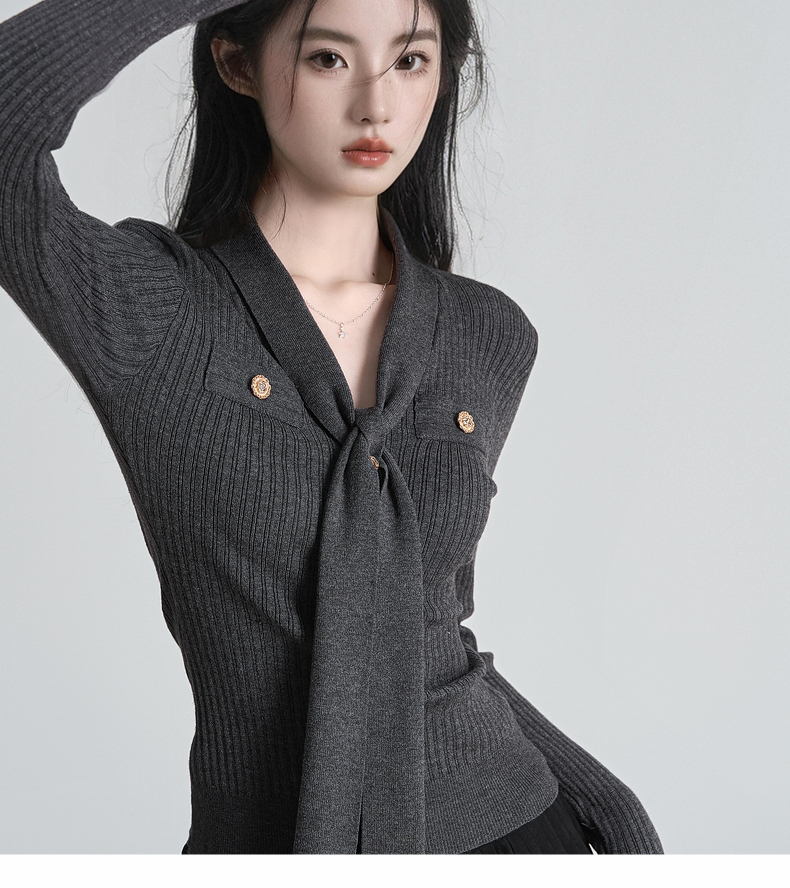秋冬新款小香风绑带V领褶皱针织衫女收腰打底衫内搭毛衣上衣