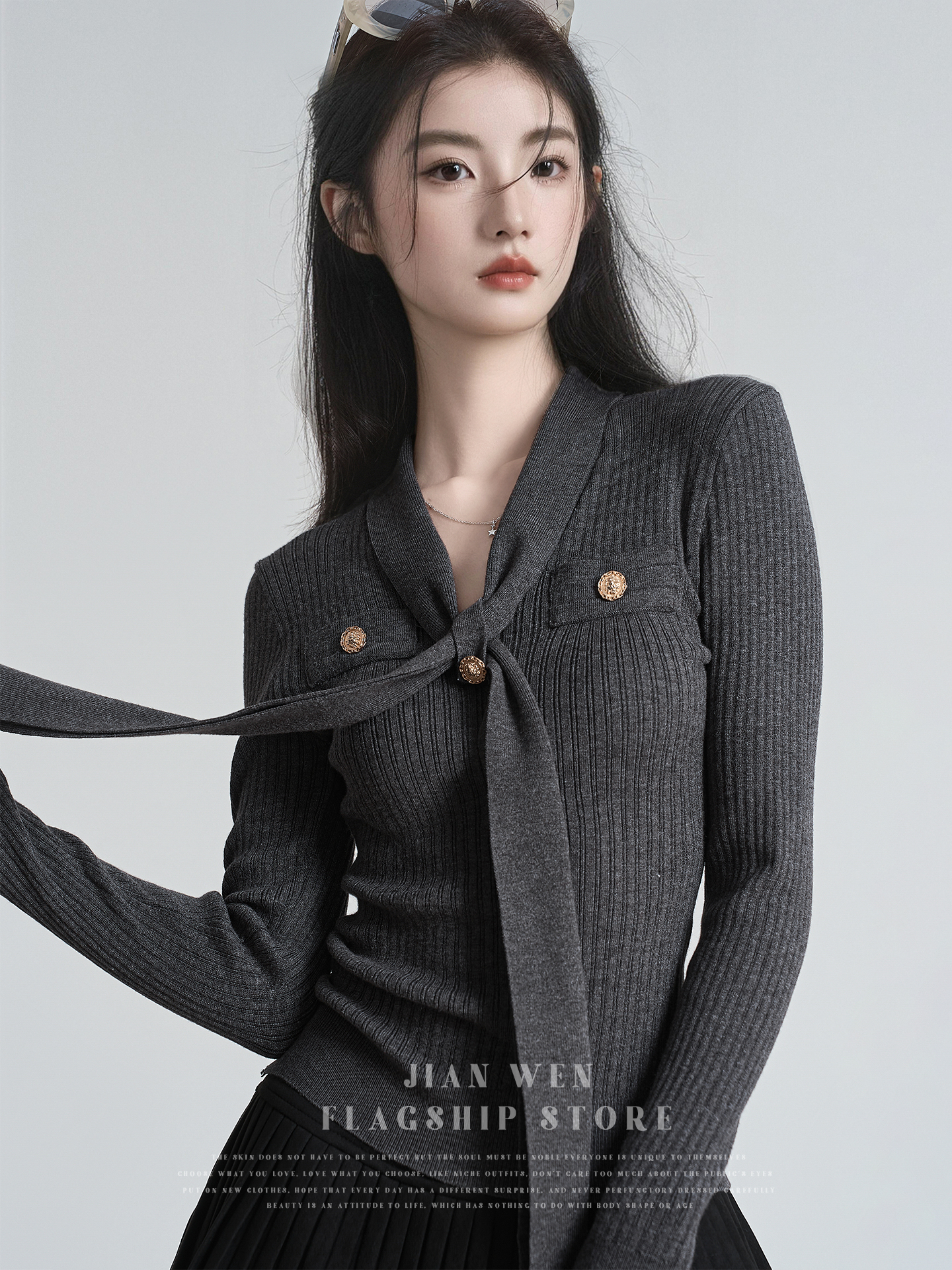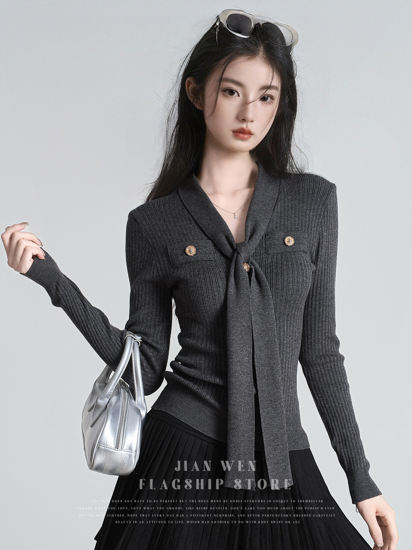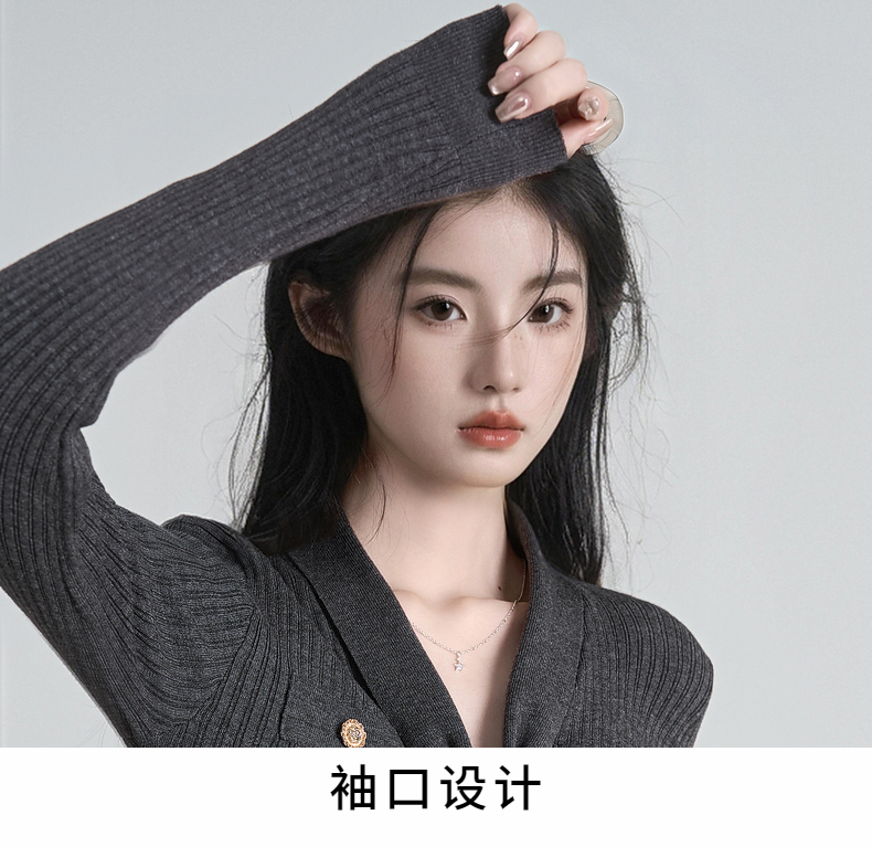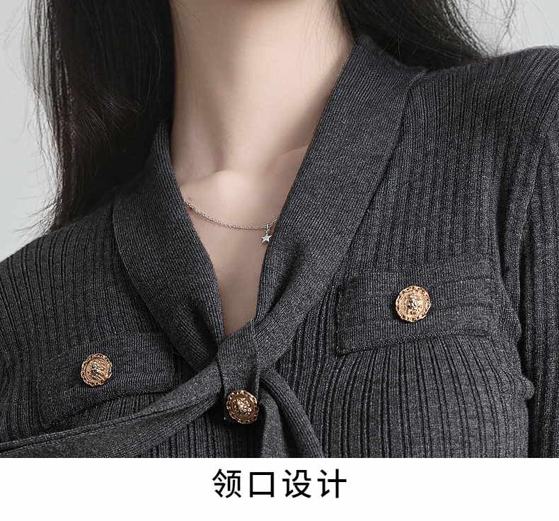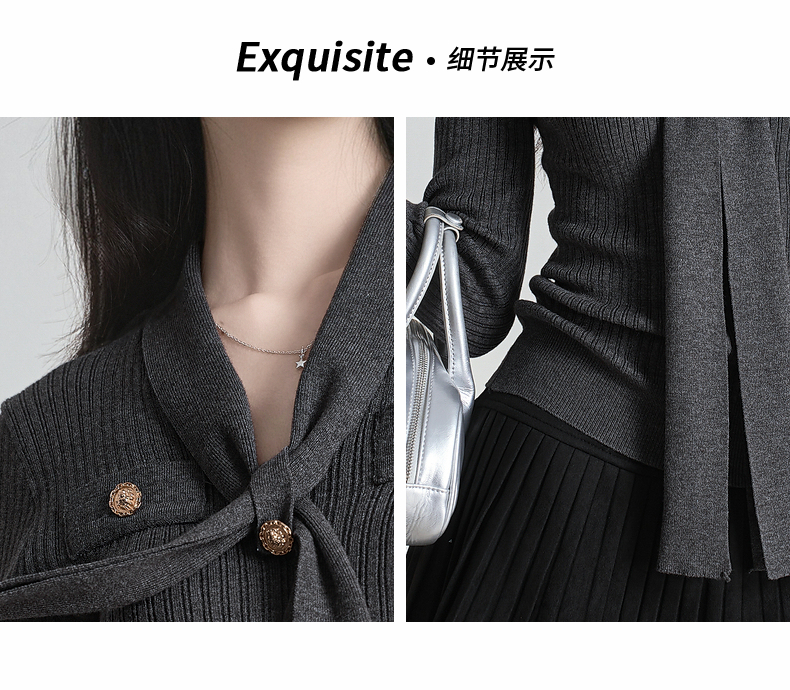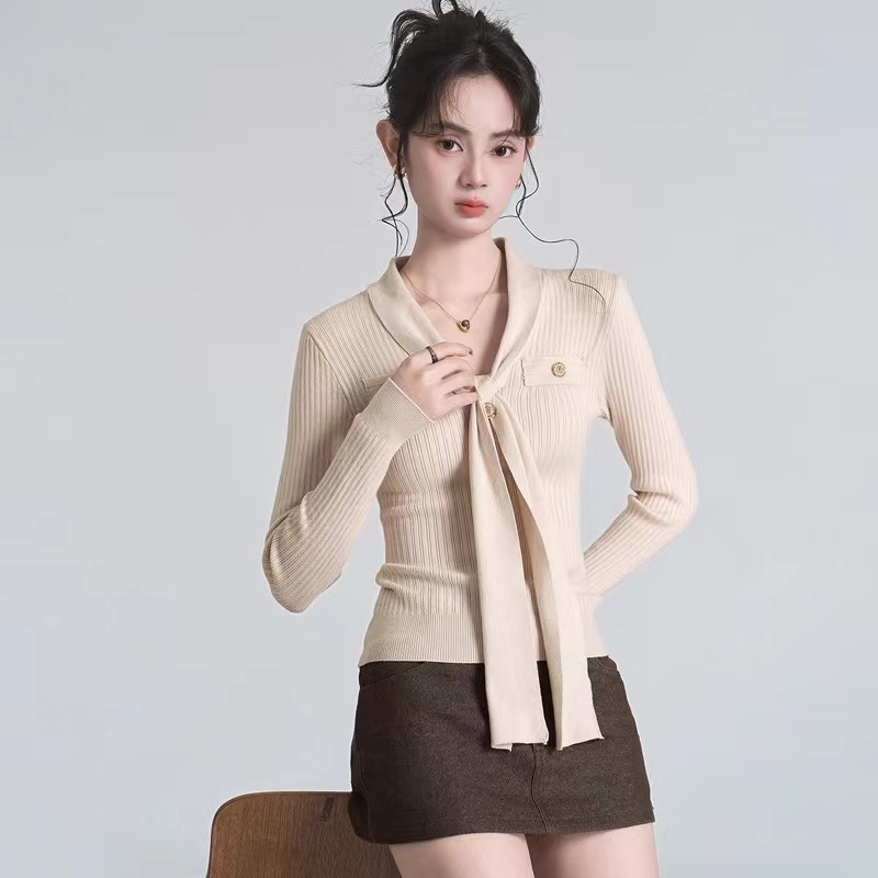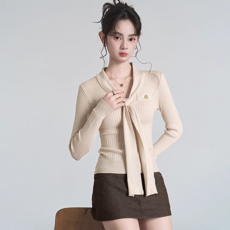 秋冬新款小香风绑带V领褶皱针织衫女收腰打底衫内搭毛衣上衣