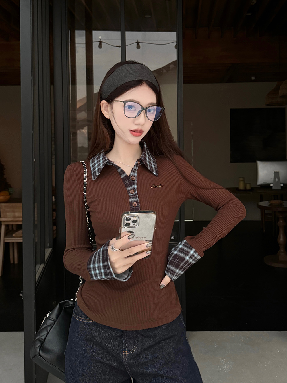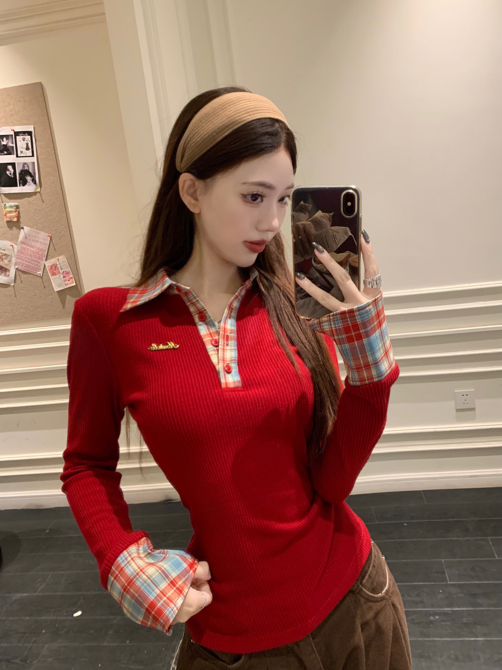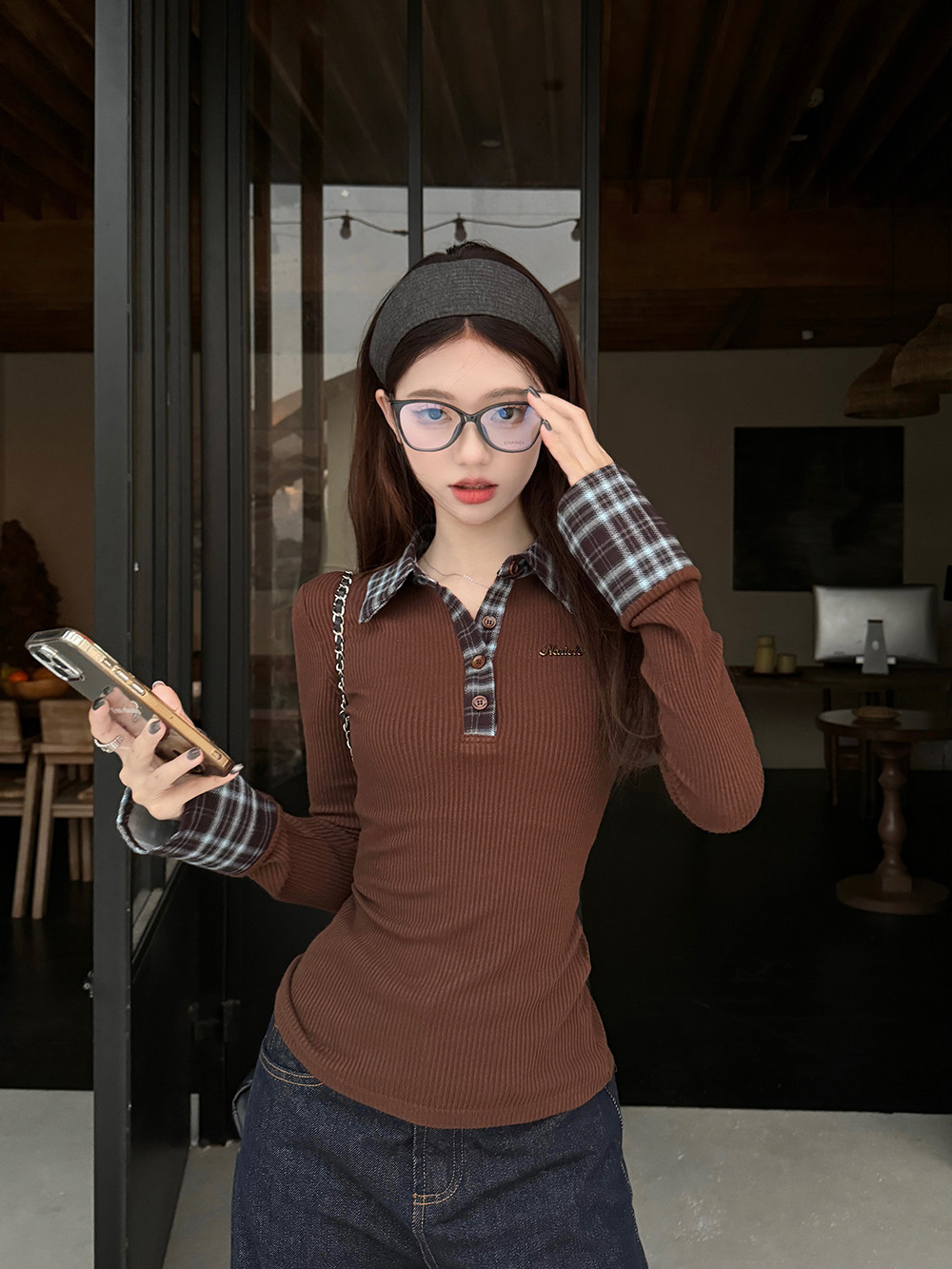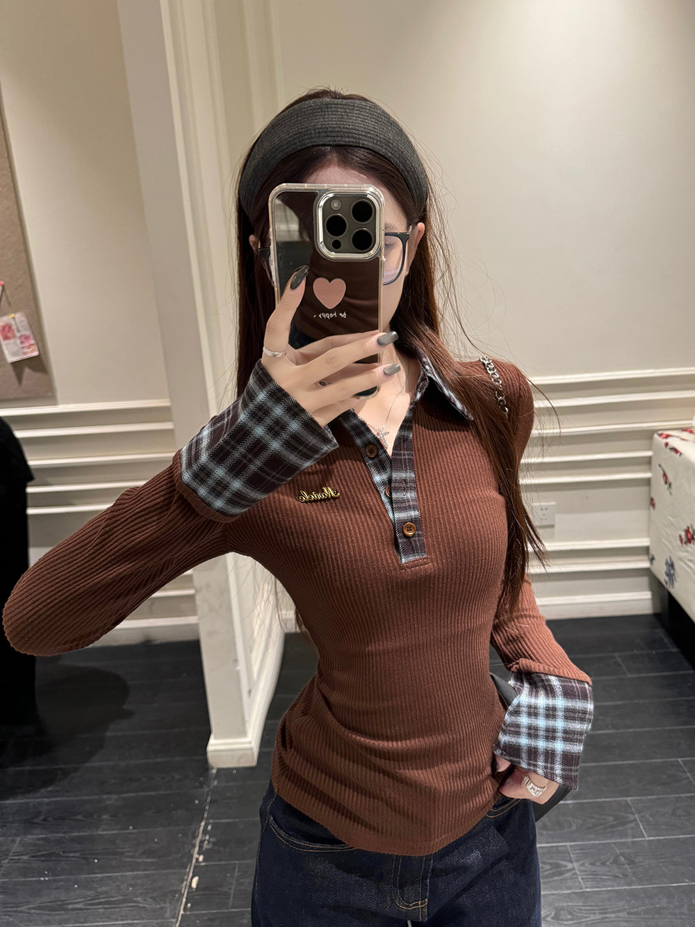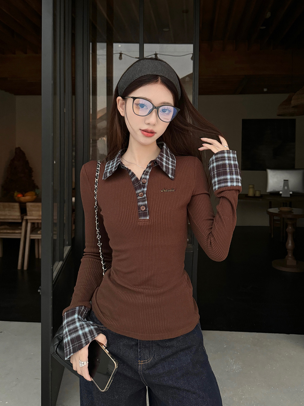 复古假两件格纹拼接长袖T恤秋冬修身内搭上衣