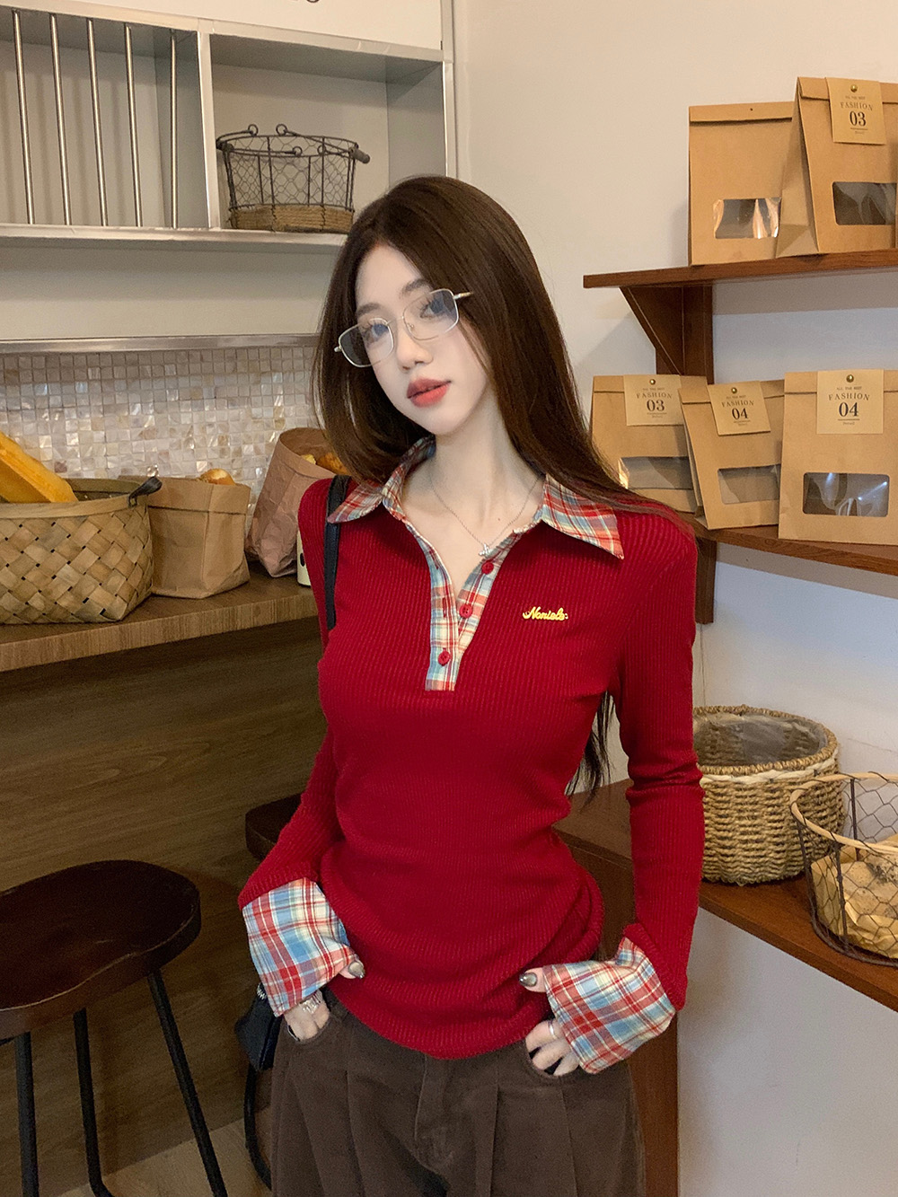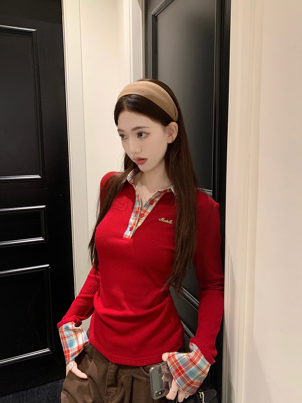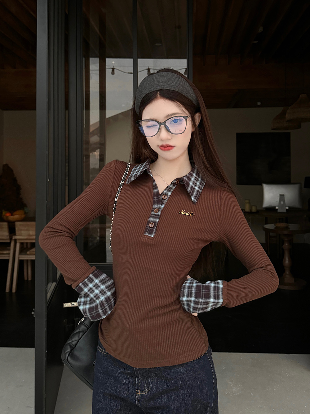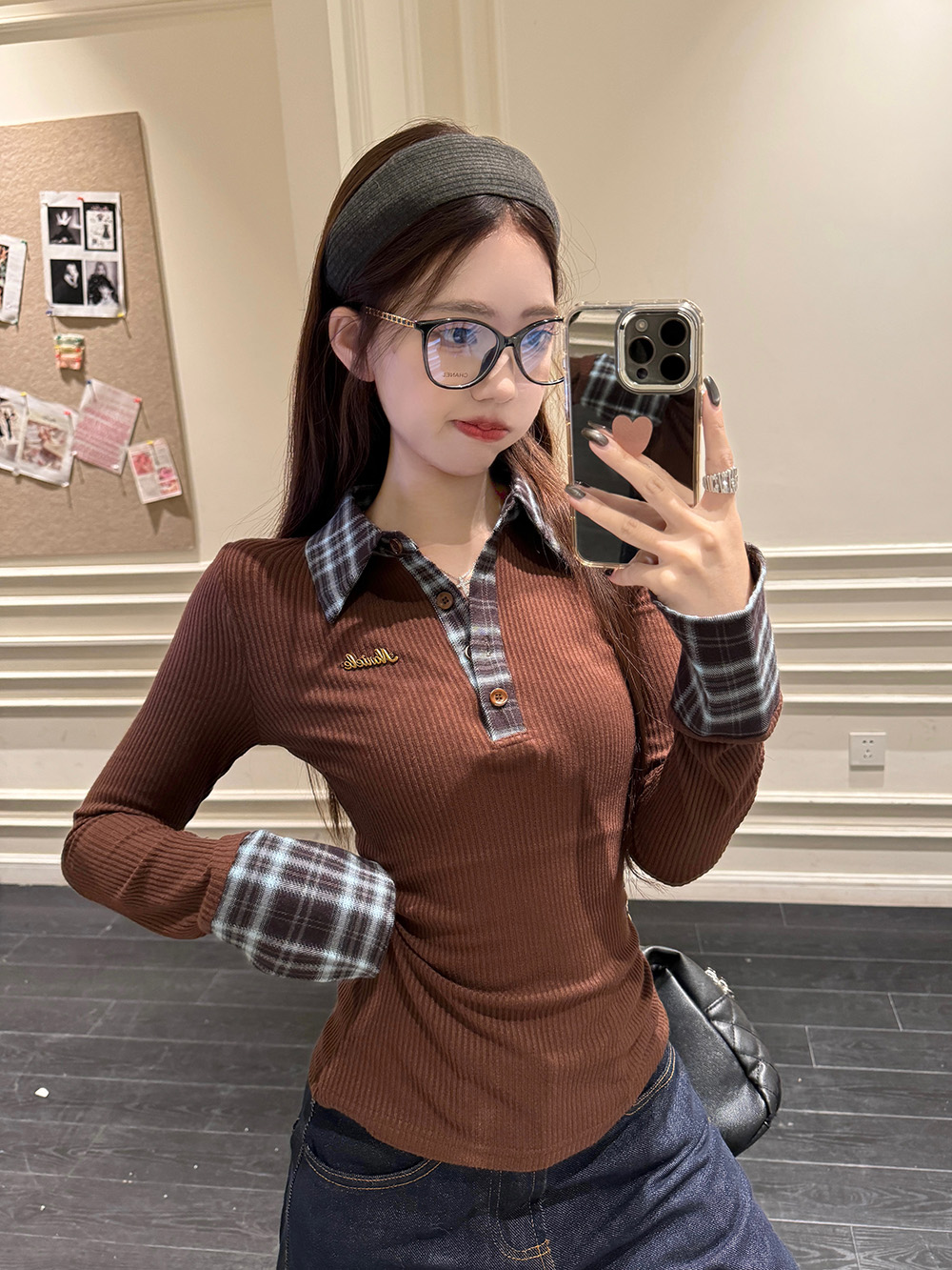 复古假两件格纹拼接长袖T恤秋冬修身内搭上衣