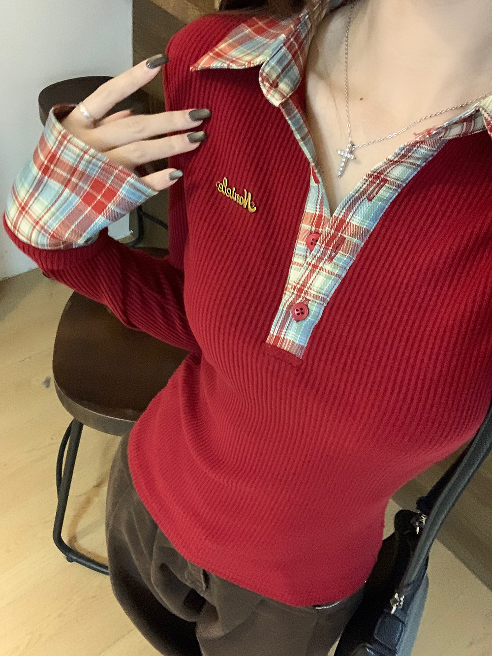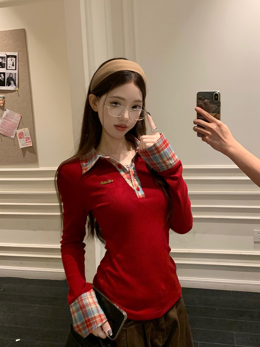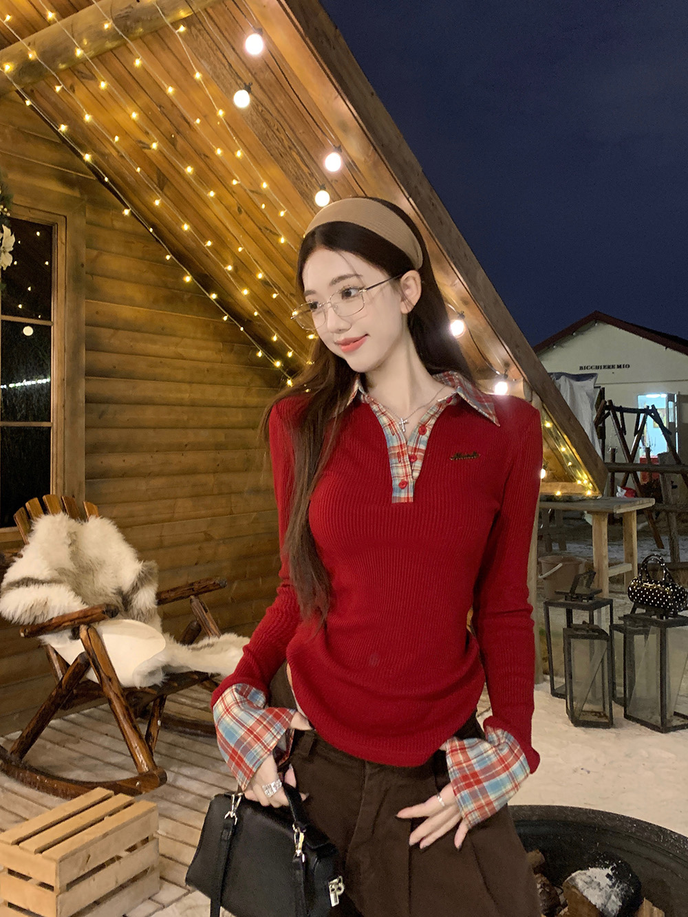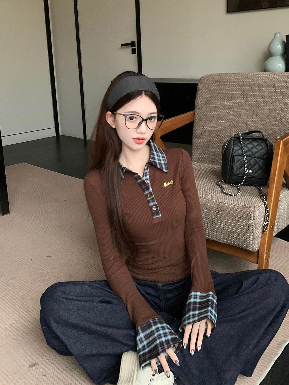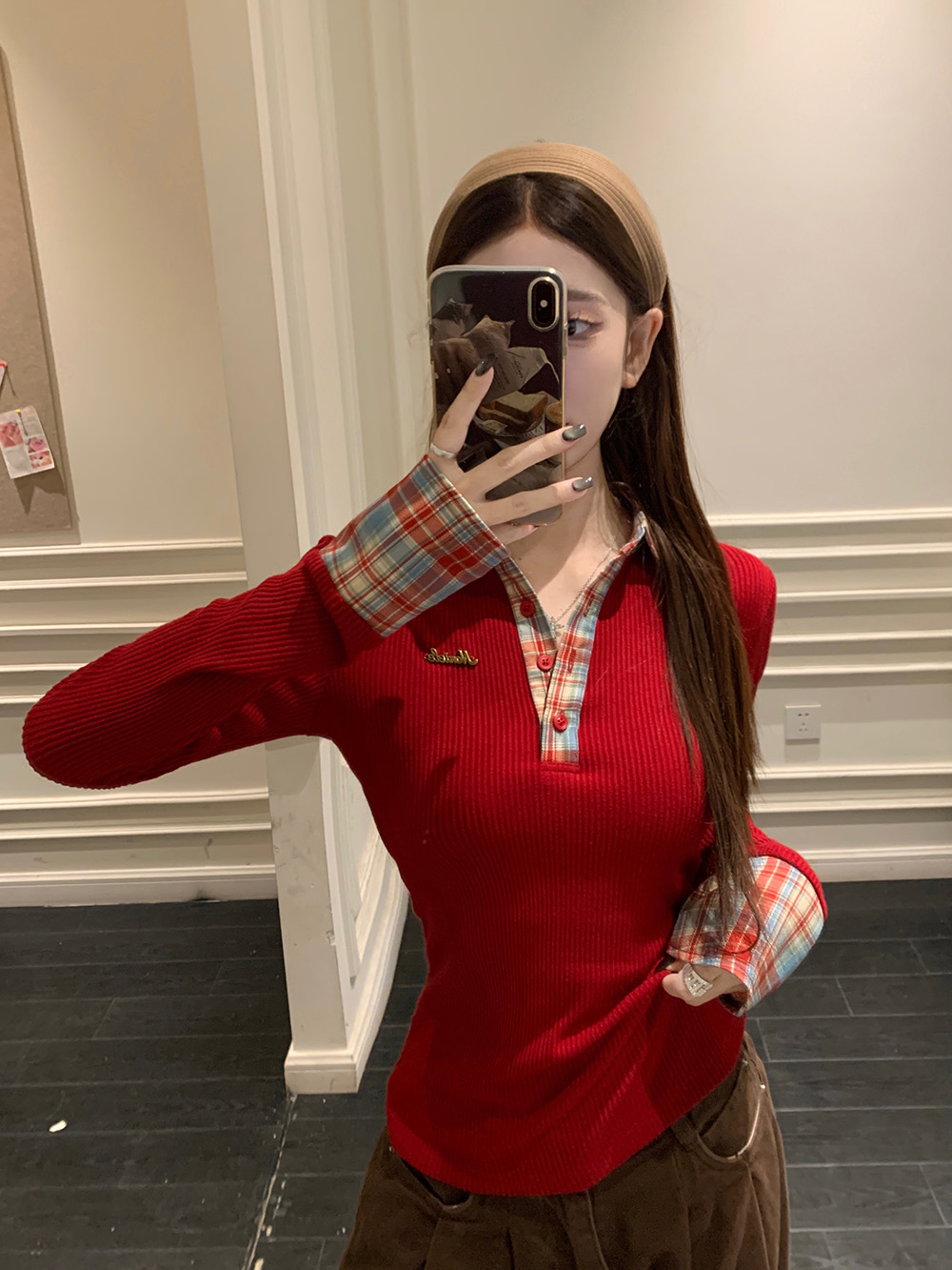 复古假两件格纹拼接长袖T恤秋冬修身内搭上衣